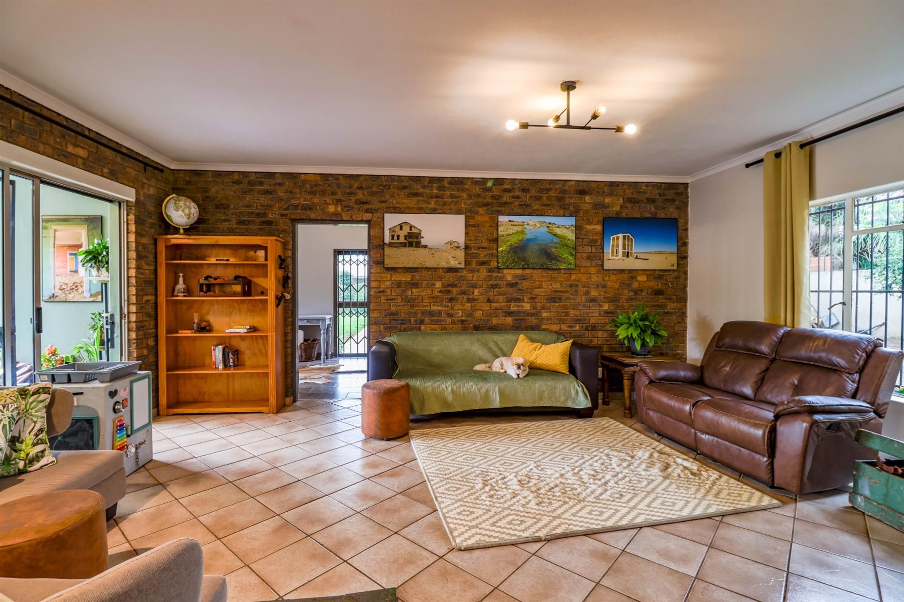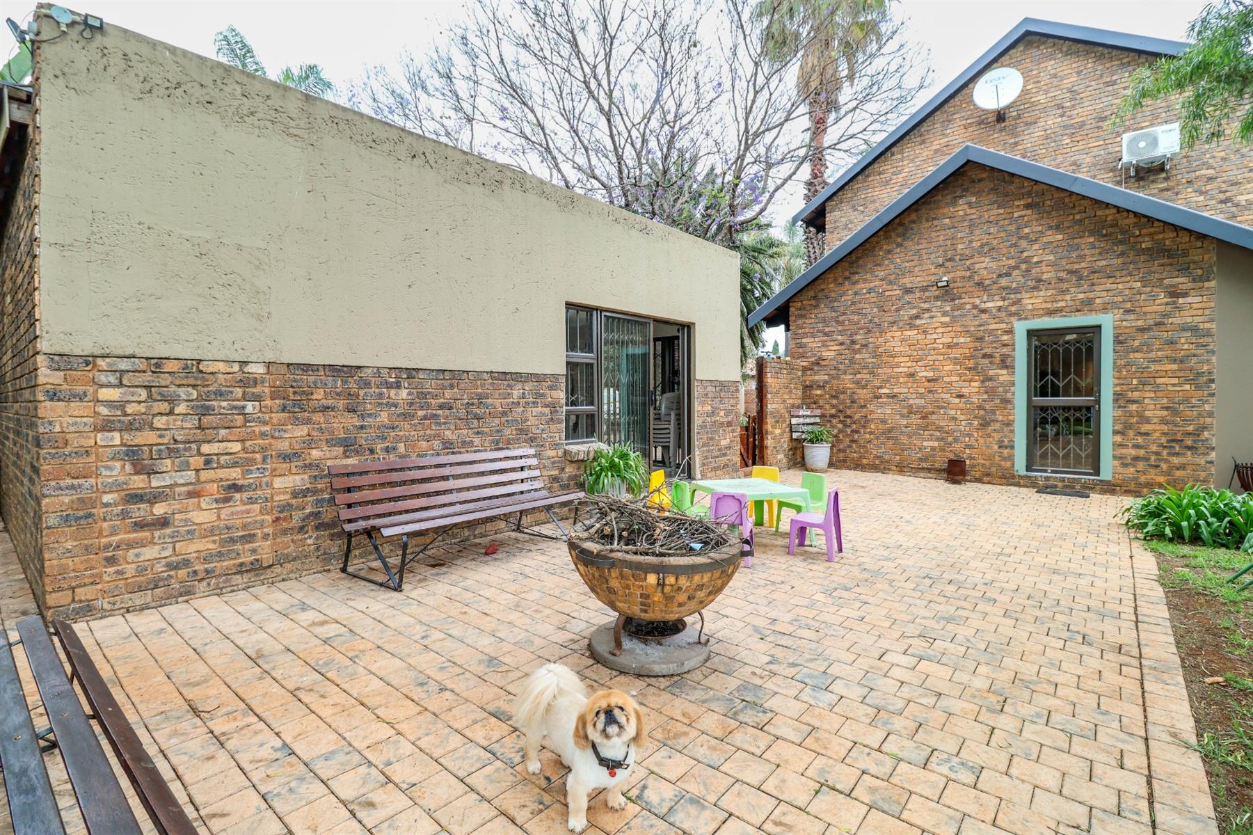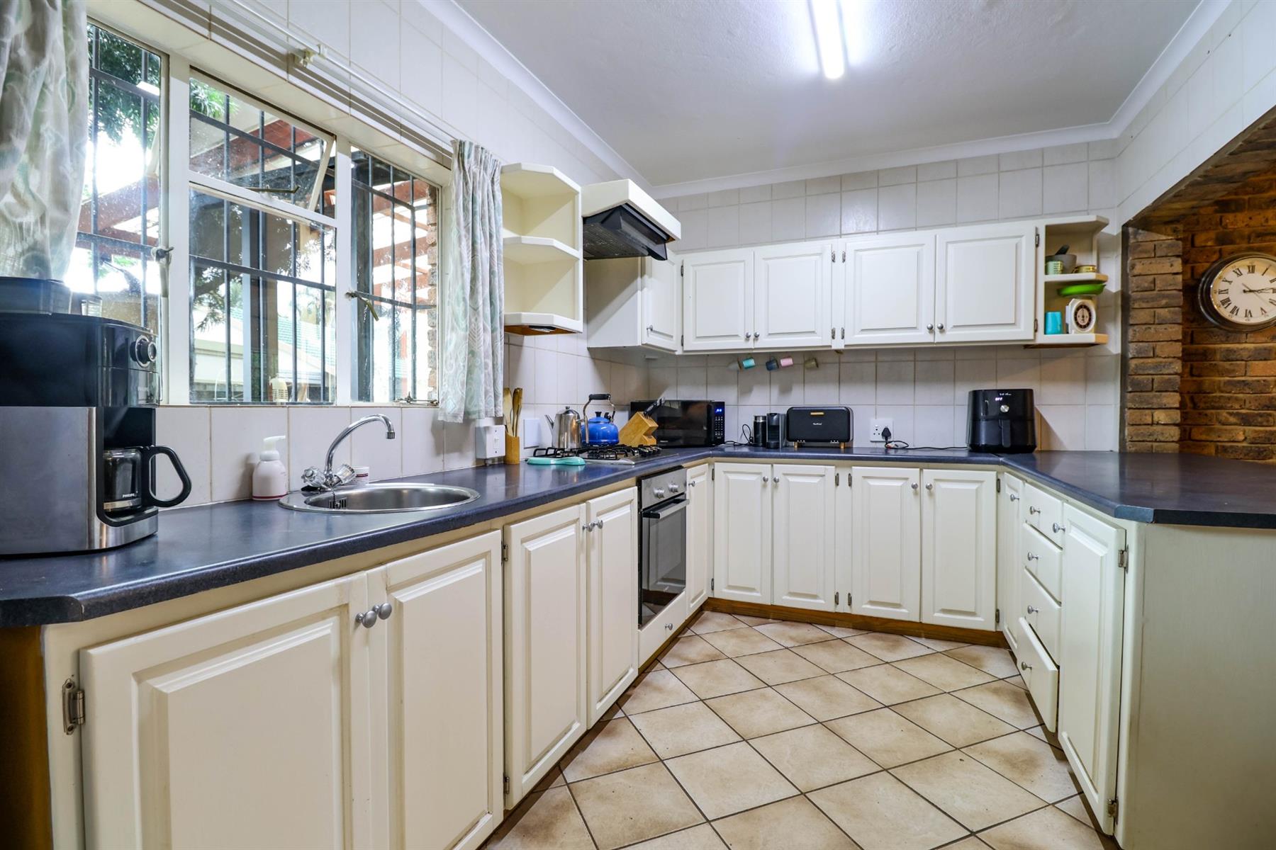 The heart of the home is an open-plan kitchen that flows seamlessly into the dining room and TV room, creating an ideal space for entertaining and family gatherings. The kitchen is equipped with a gas hob, ample built-in cupboards, and a pantry for all your storage needs. Enjoy cozy evenings by the fireplace in the TV room, or step out onto the patio for some fresh air.