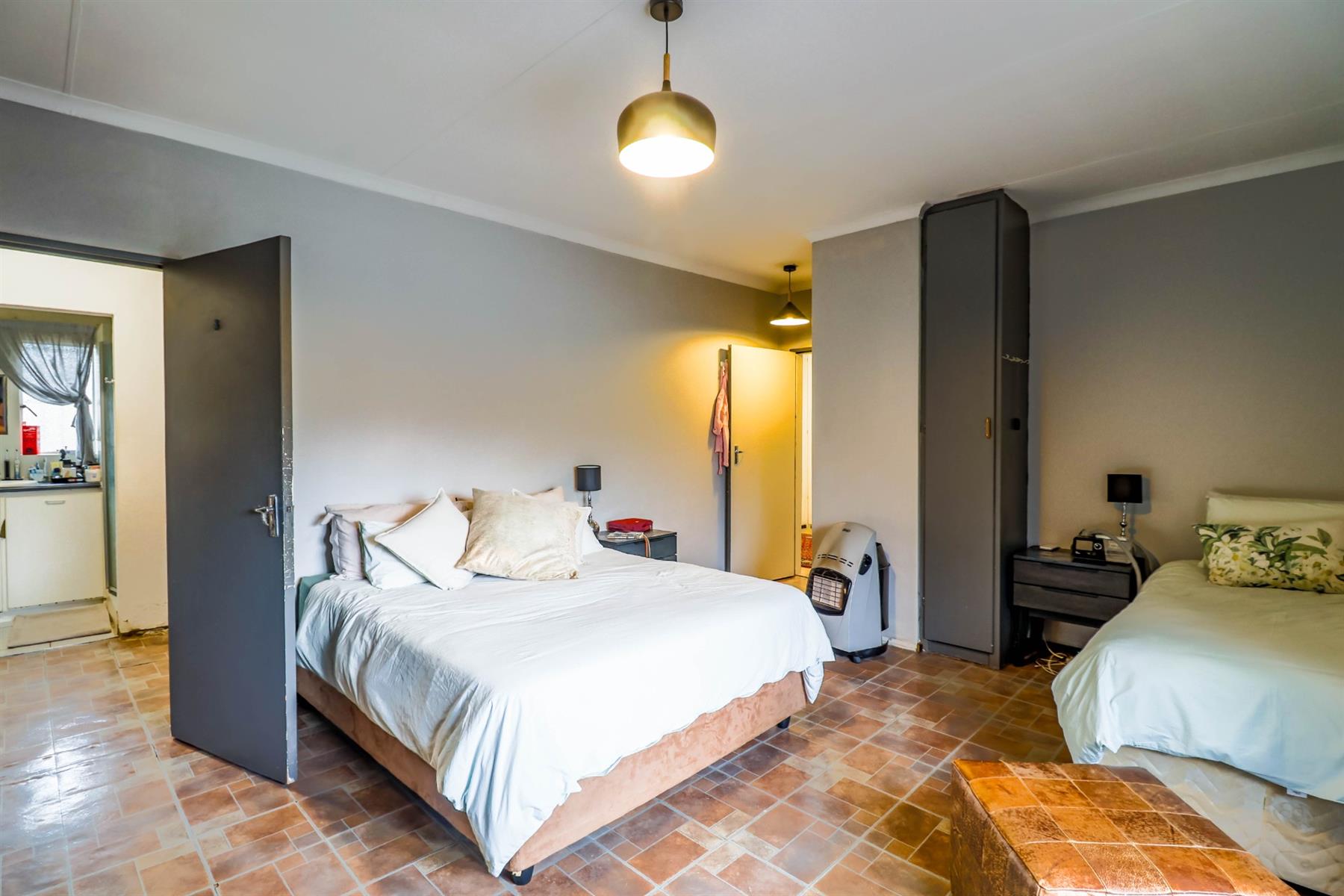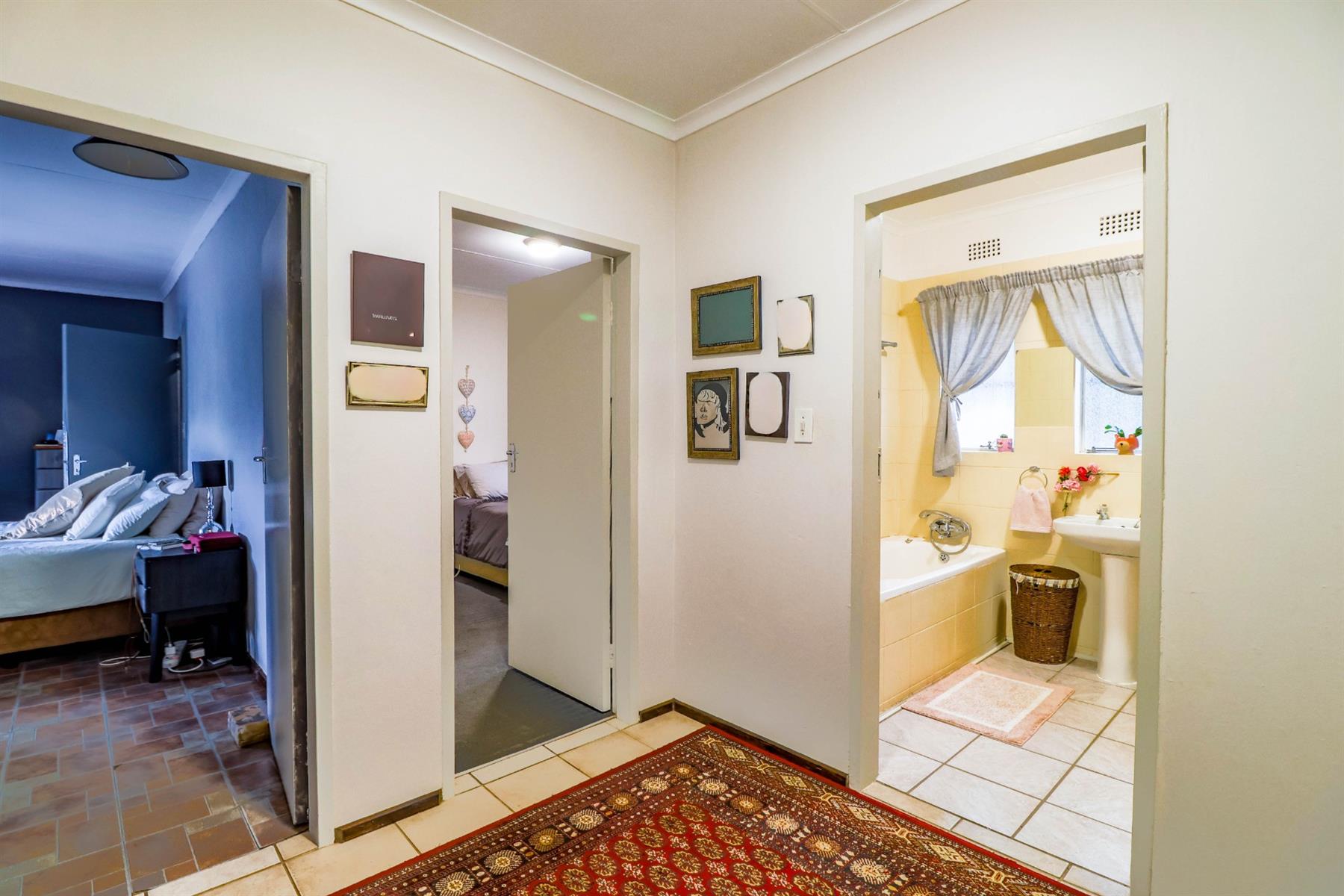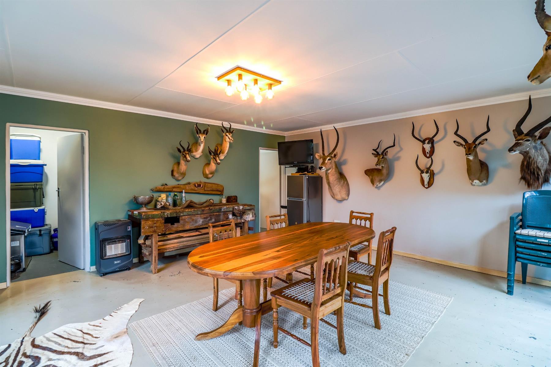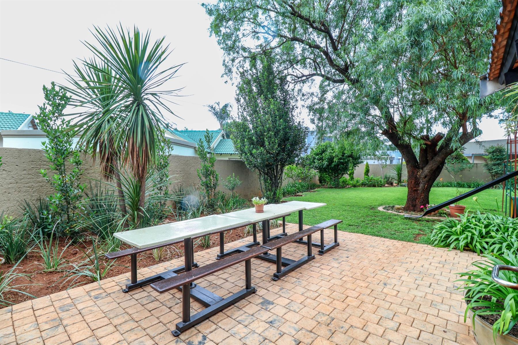 The heart of the home is an open-plan kitchen that flows seamlessly into the dining room and TV room, creating an ideal space for entertaining and family gatherings. The kitchen is equipped with a gas hob, ample built-in cupboards, and a pantry for all your storage needs. Enjoy cozy evenings by the fireplace in the TV room, or step out onto the patio for some fresh air.