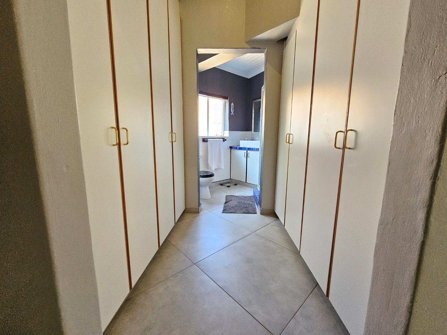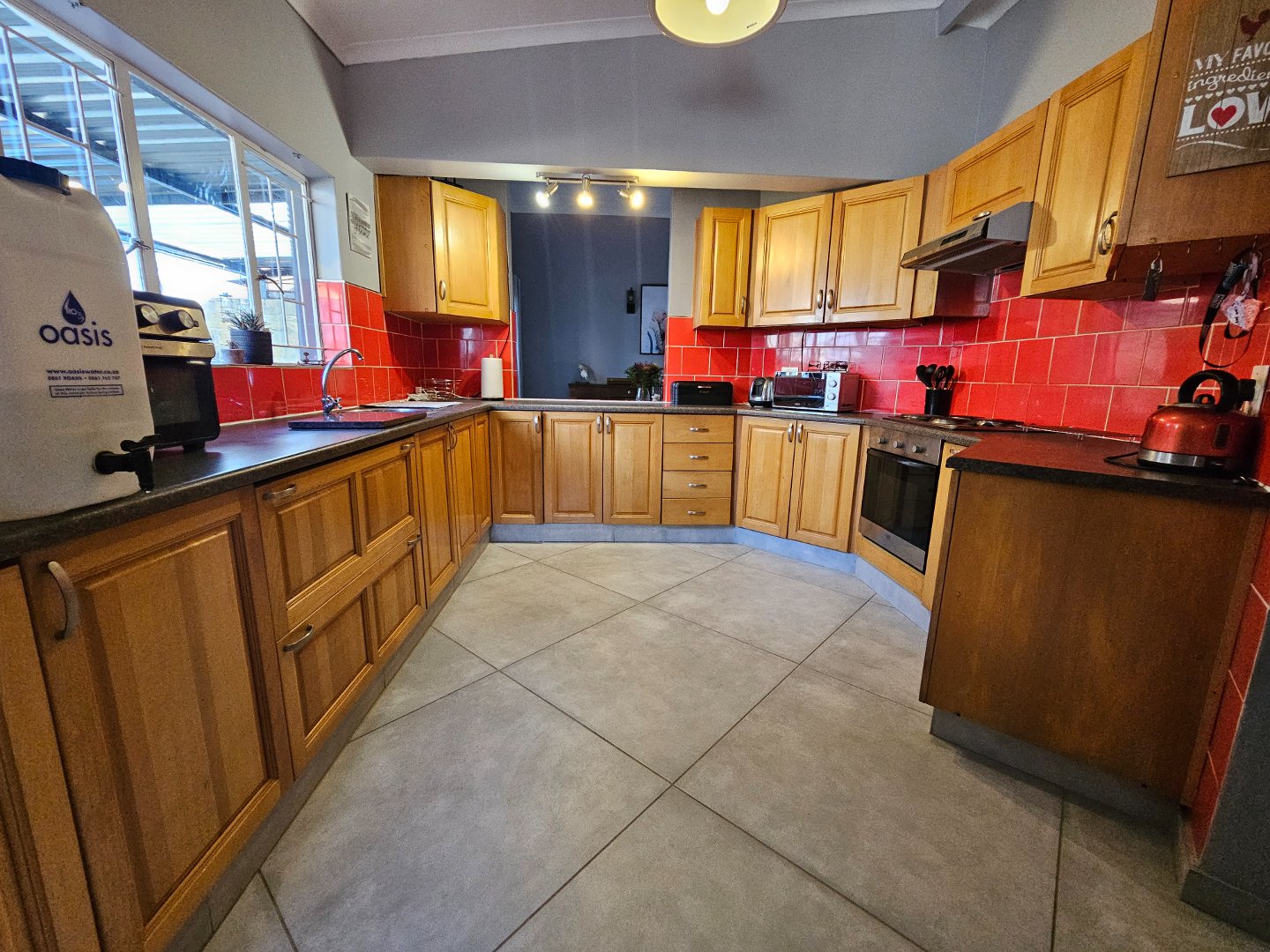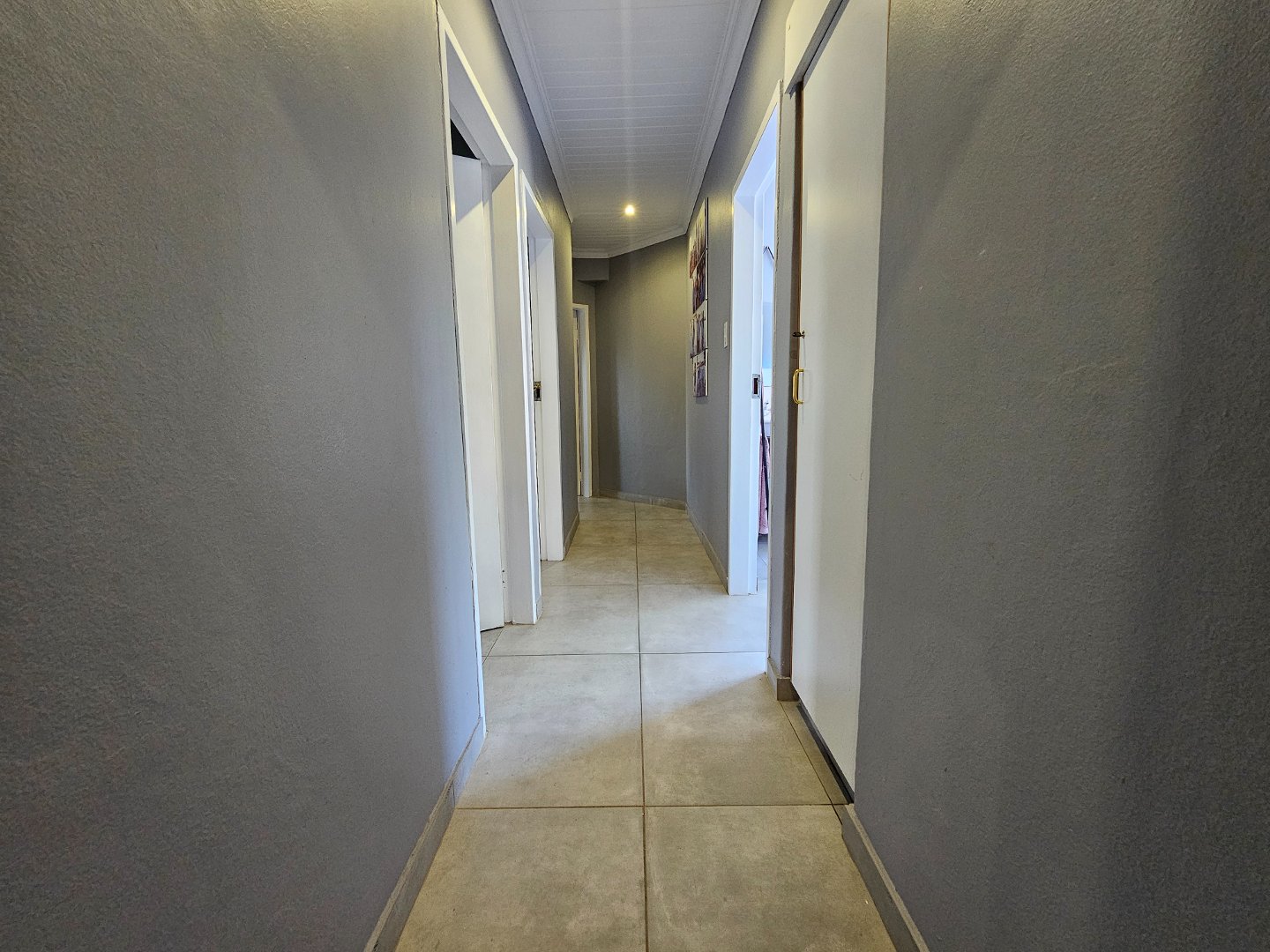 The outdoor space is a testament to thoughtful landscaping, featuring a well-manicured garden equipped with a sprinkler system. The garden invites relaxation and entertainment with its swimming pool and covered patio, complete with a built-in braai and garden storage. Practicality is not overlooked, with a double carport and electric gate enhancing the property's convenience and security.