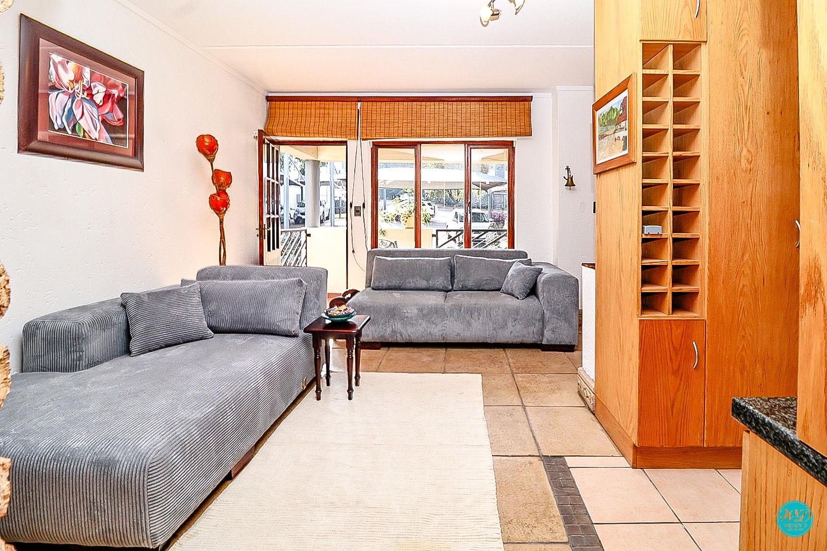 An open-plan living area leading onto a covered balcony, perfect for relaxing and enjoying lush green views