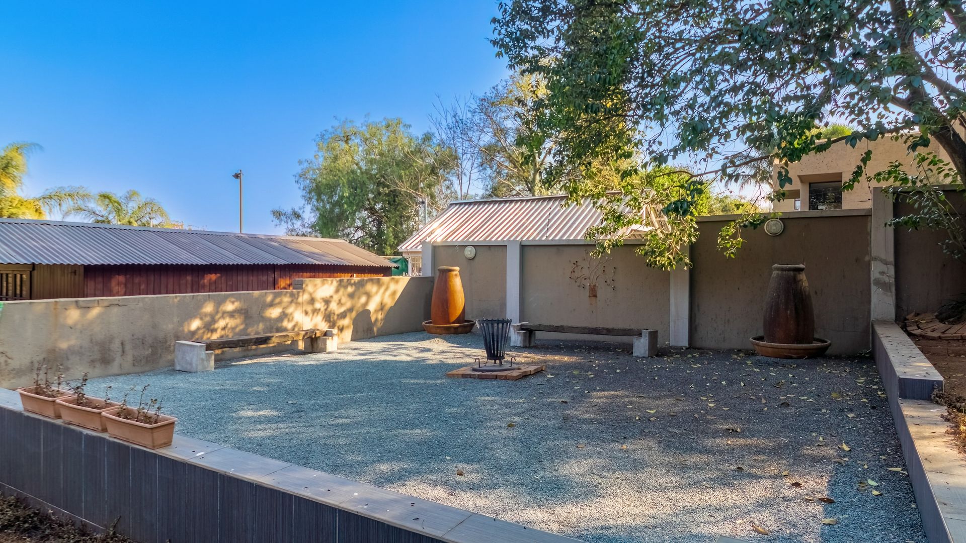 The living areas open onto a magnificent, oversized veranda overlooking the garden — a true outdoor sanctuary with a built-in jacuzzi and a beautifully crafted fire pit area, perfect for relaxed evenings and social gatherings.