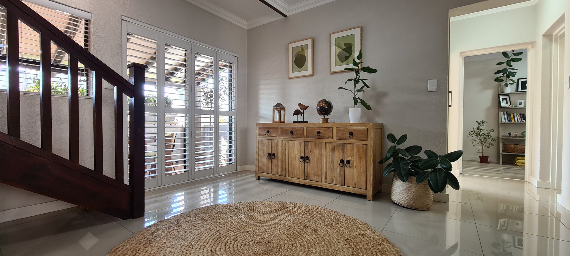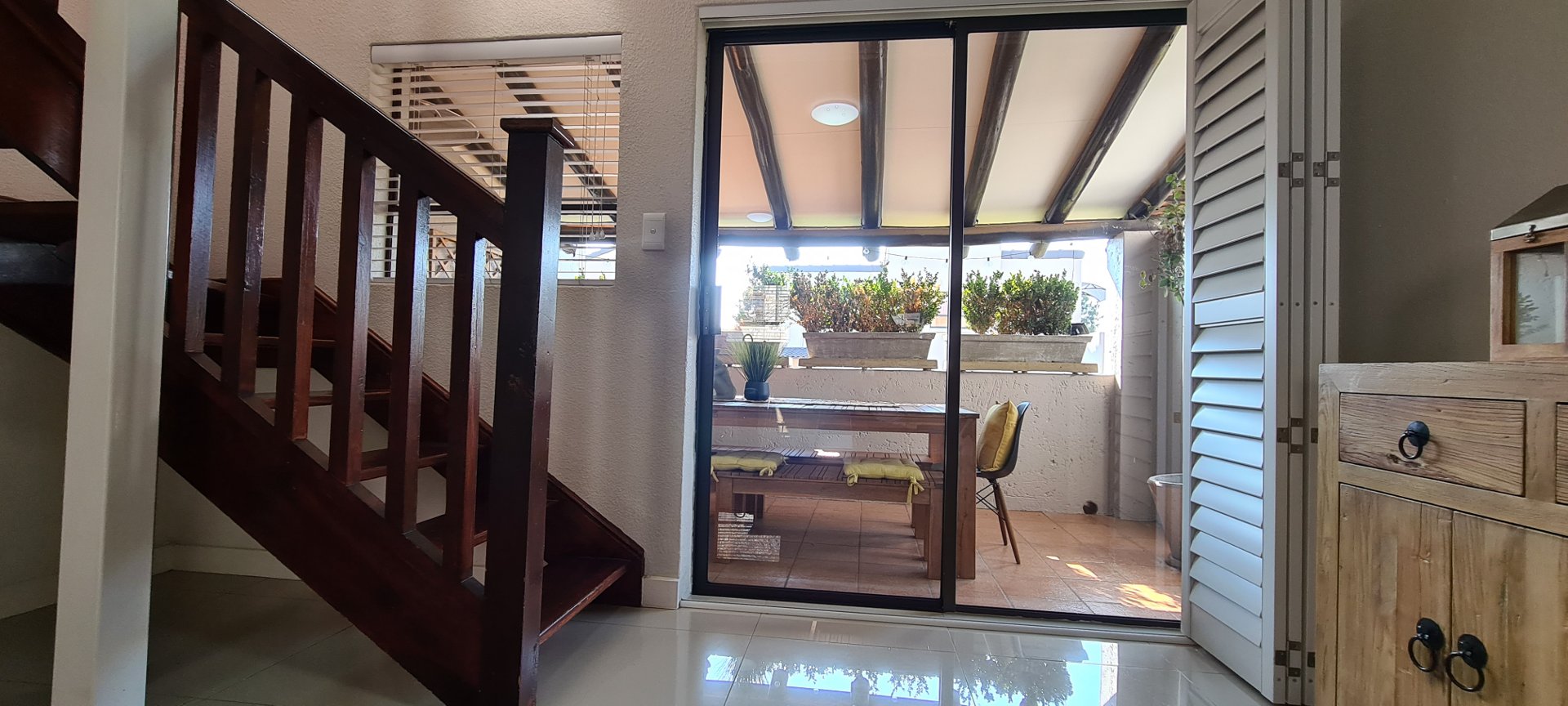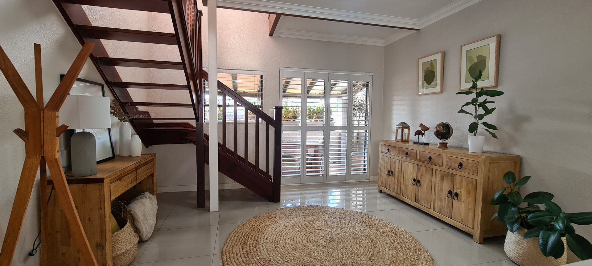 The open plan kitchen and foyer opening up to a covered balcony equipped for a barbeque with friends or family.