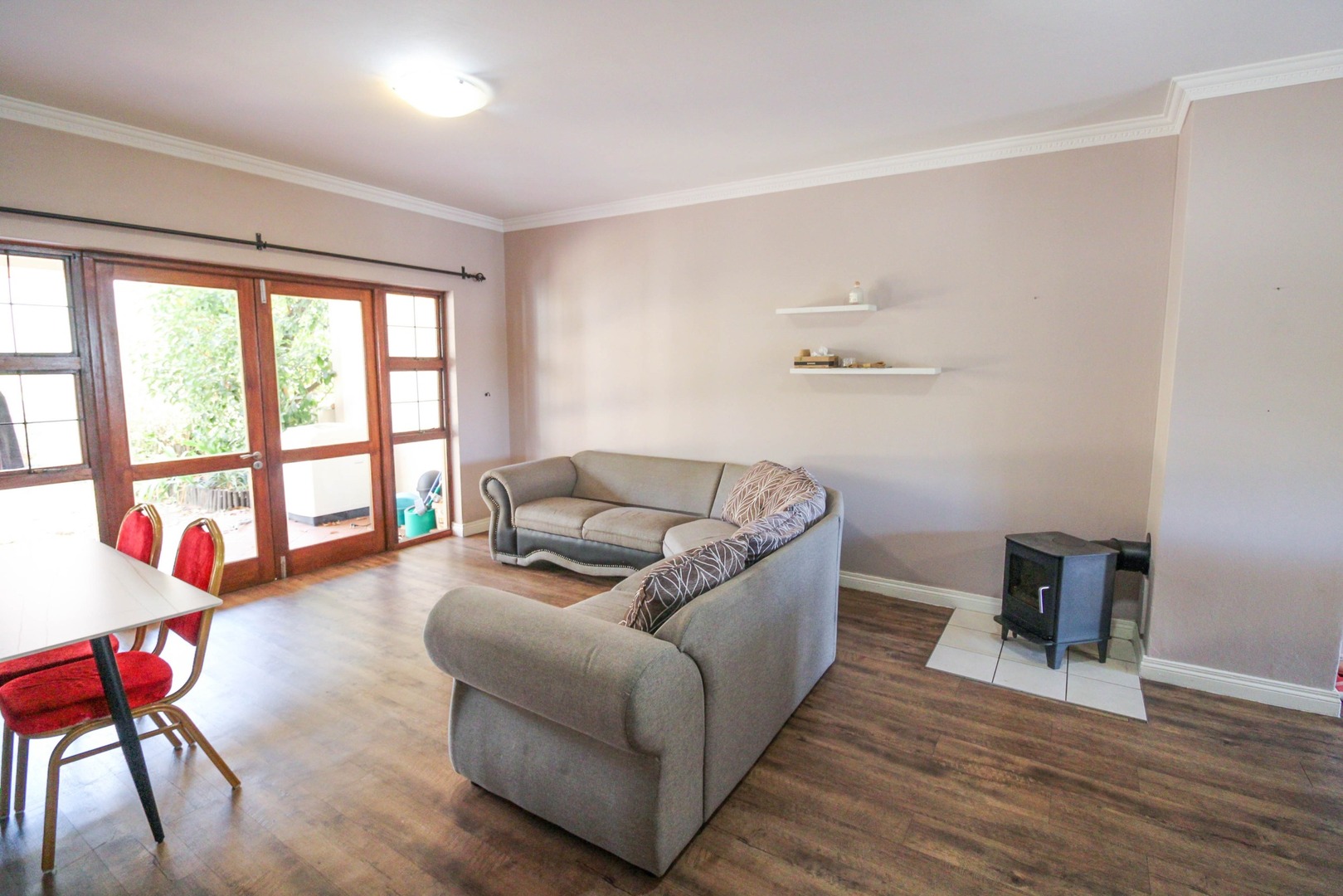 The kitchen is equipped with ample built-in cupboard space, a pantry, microwave oven nook, double basin, space for under-counter appliances, an oven, stove, and extractor fan. It seamlessly leads to a cozy living area with a freestanding fireplace, perfect for those chilly evenings. Double doors open from the living area onto the expansive garden, offering a perfect space for relaxation and entertaining.
