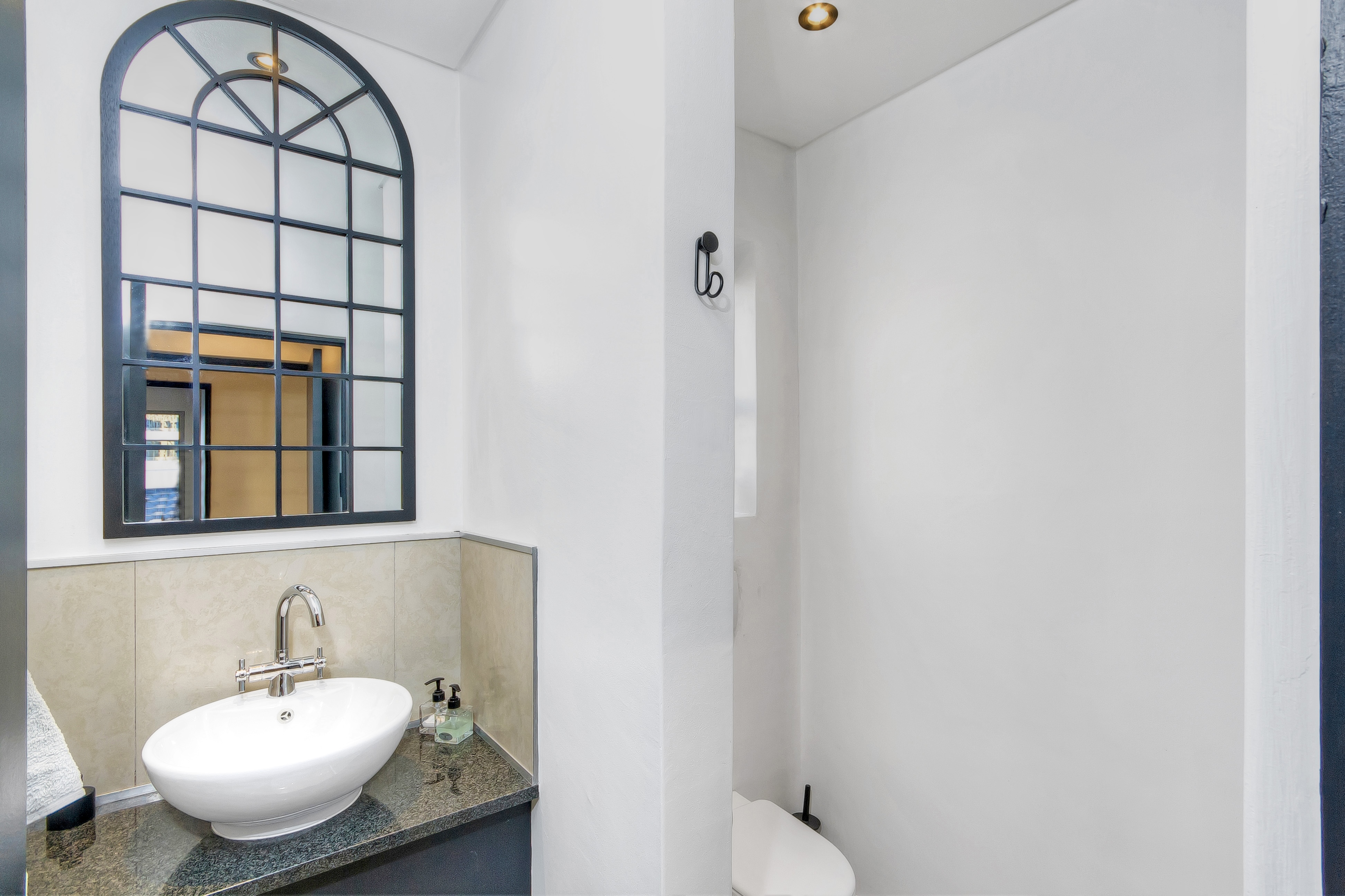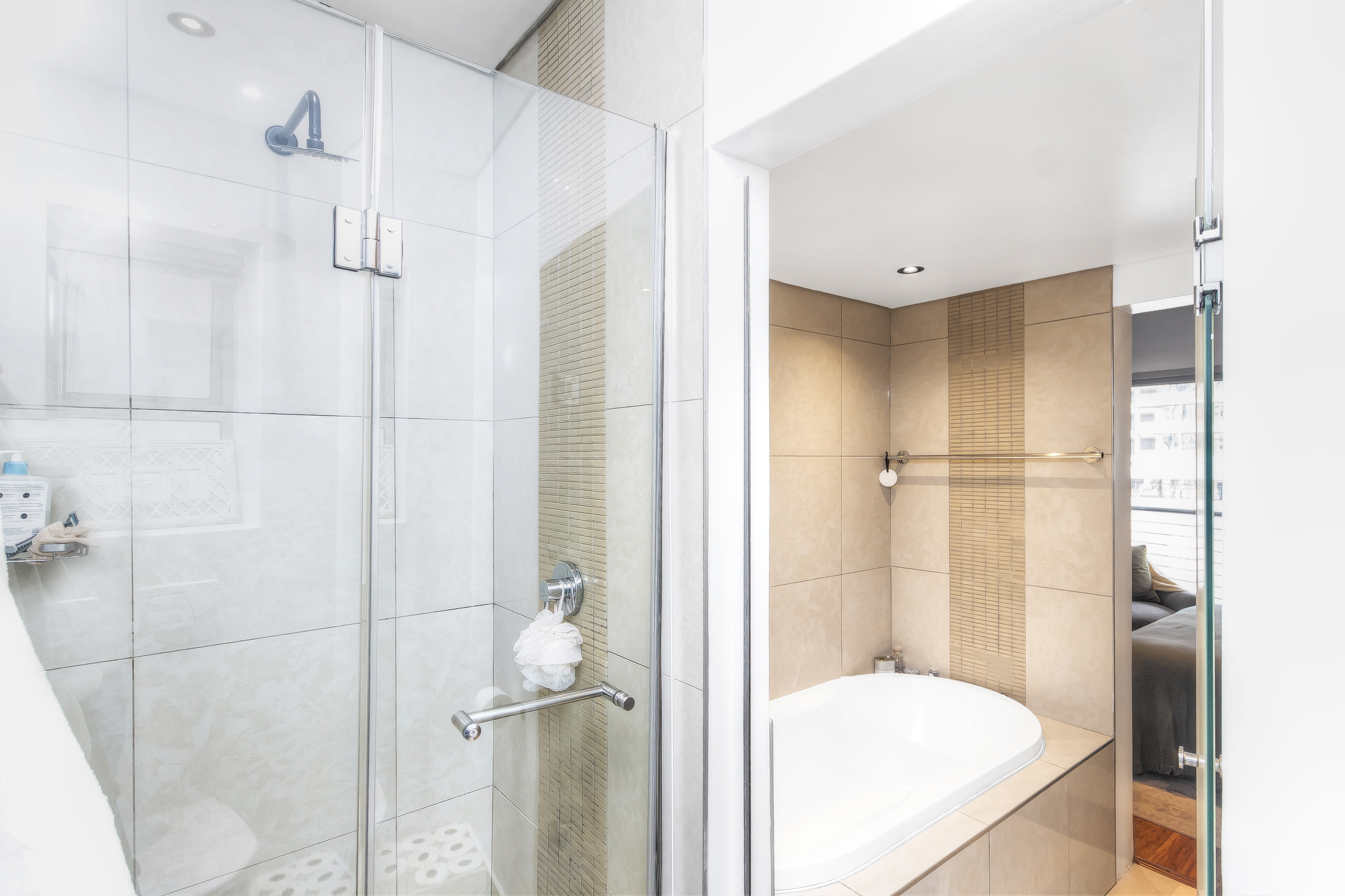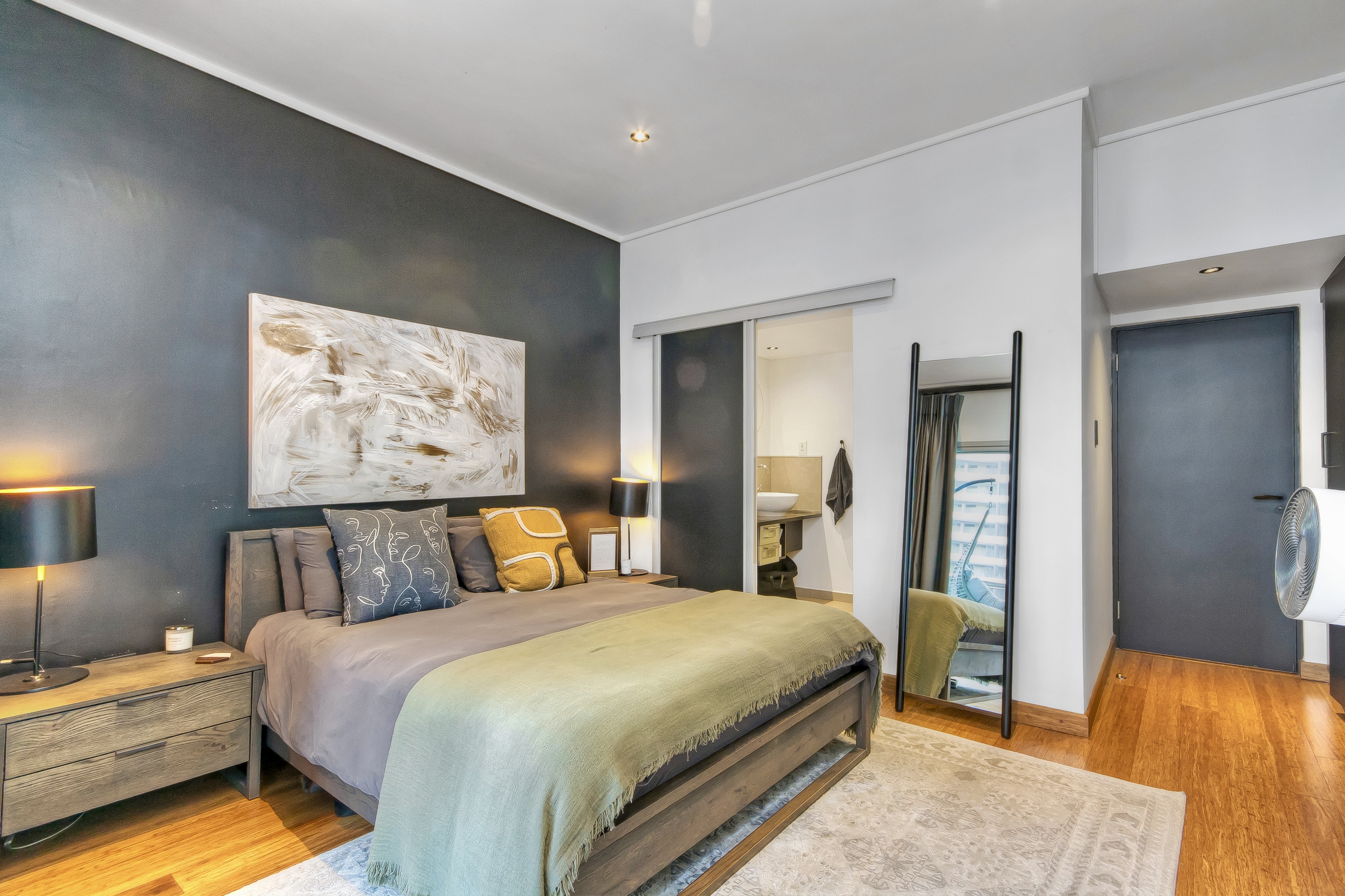 Magnificent wooden flooring in bedroom areas both Ensuite with classy high end cabinetry and finishes , the second bedroom closing off as an en-suite or sectioned guest bathroom .