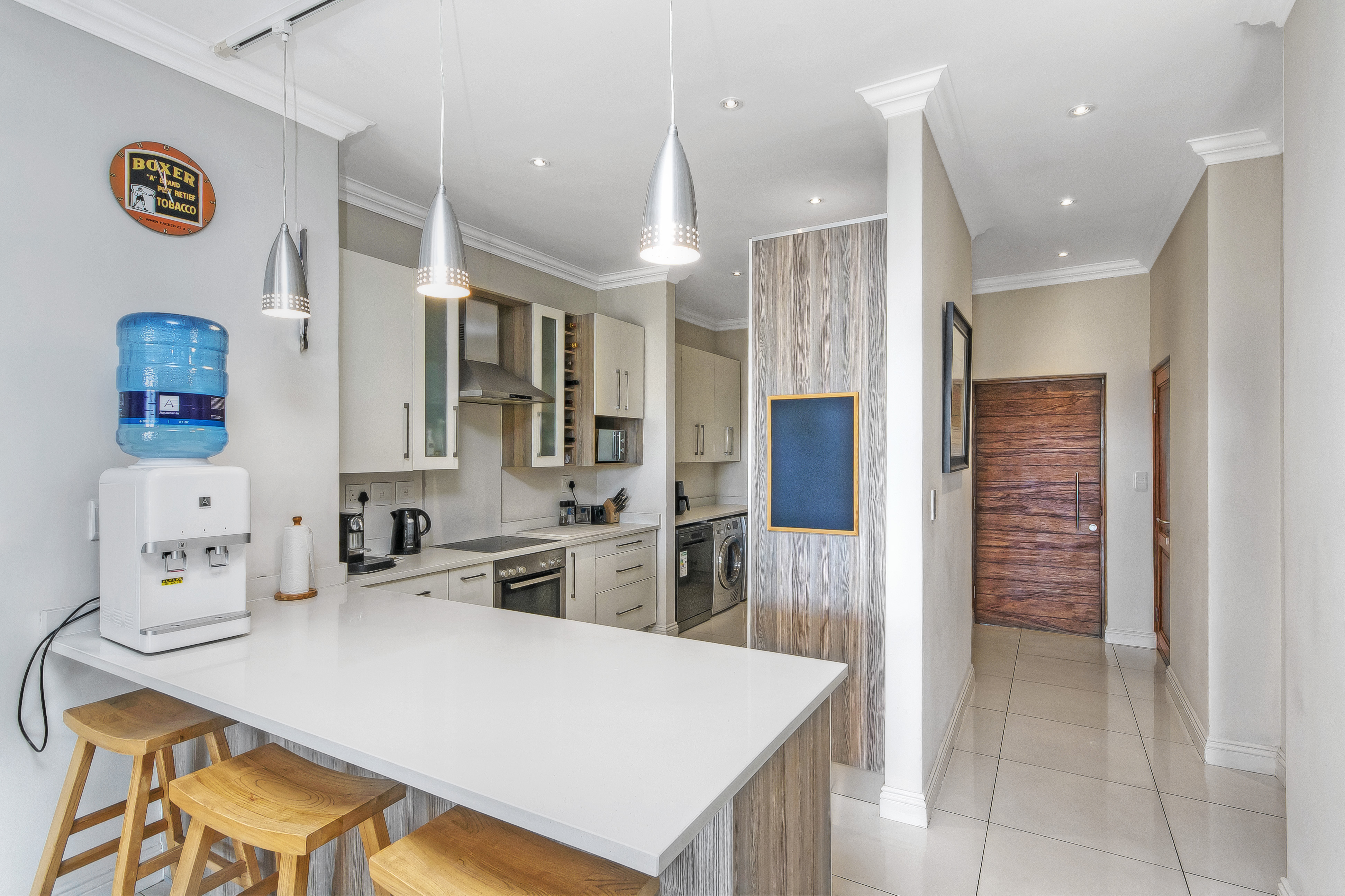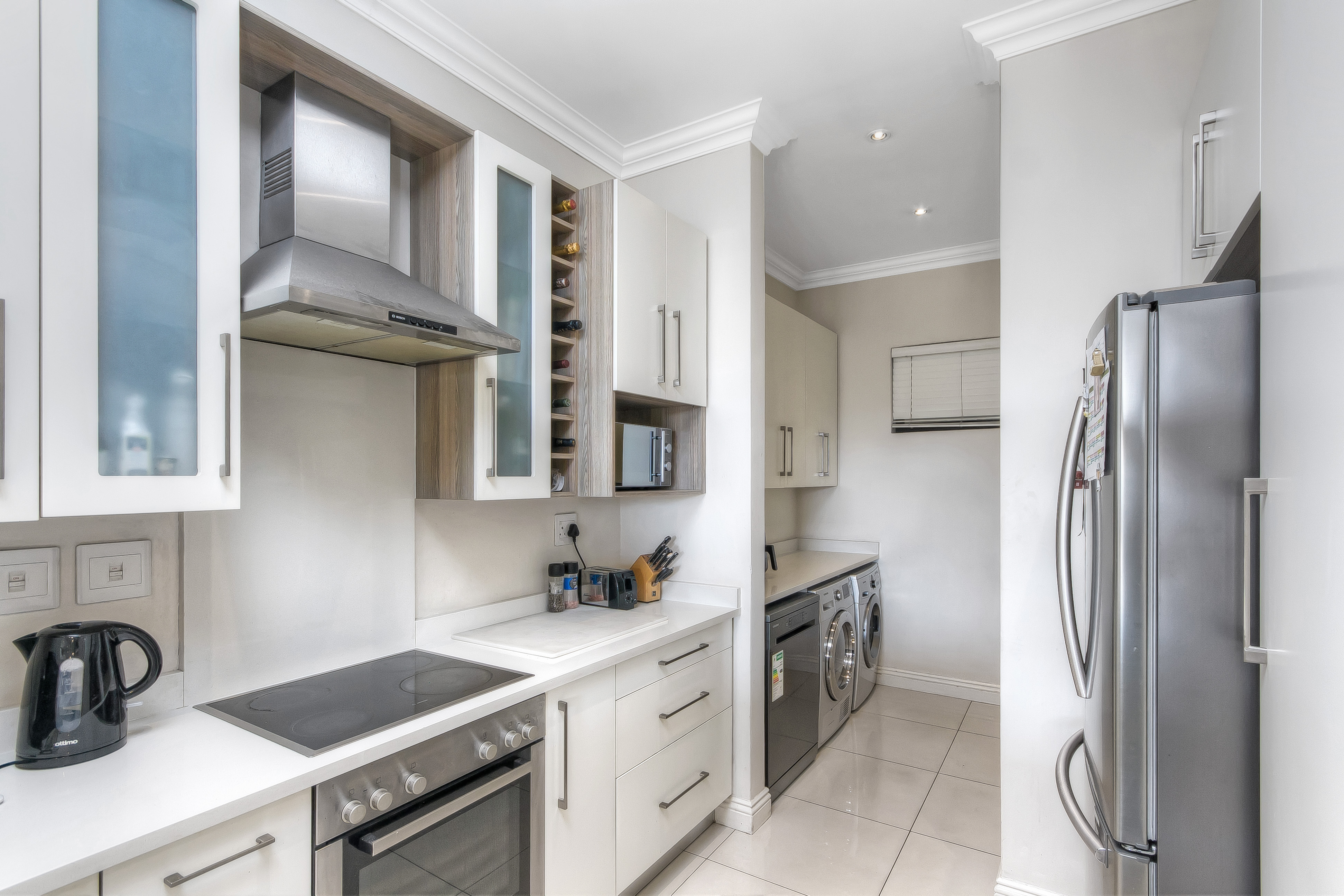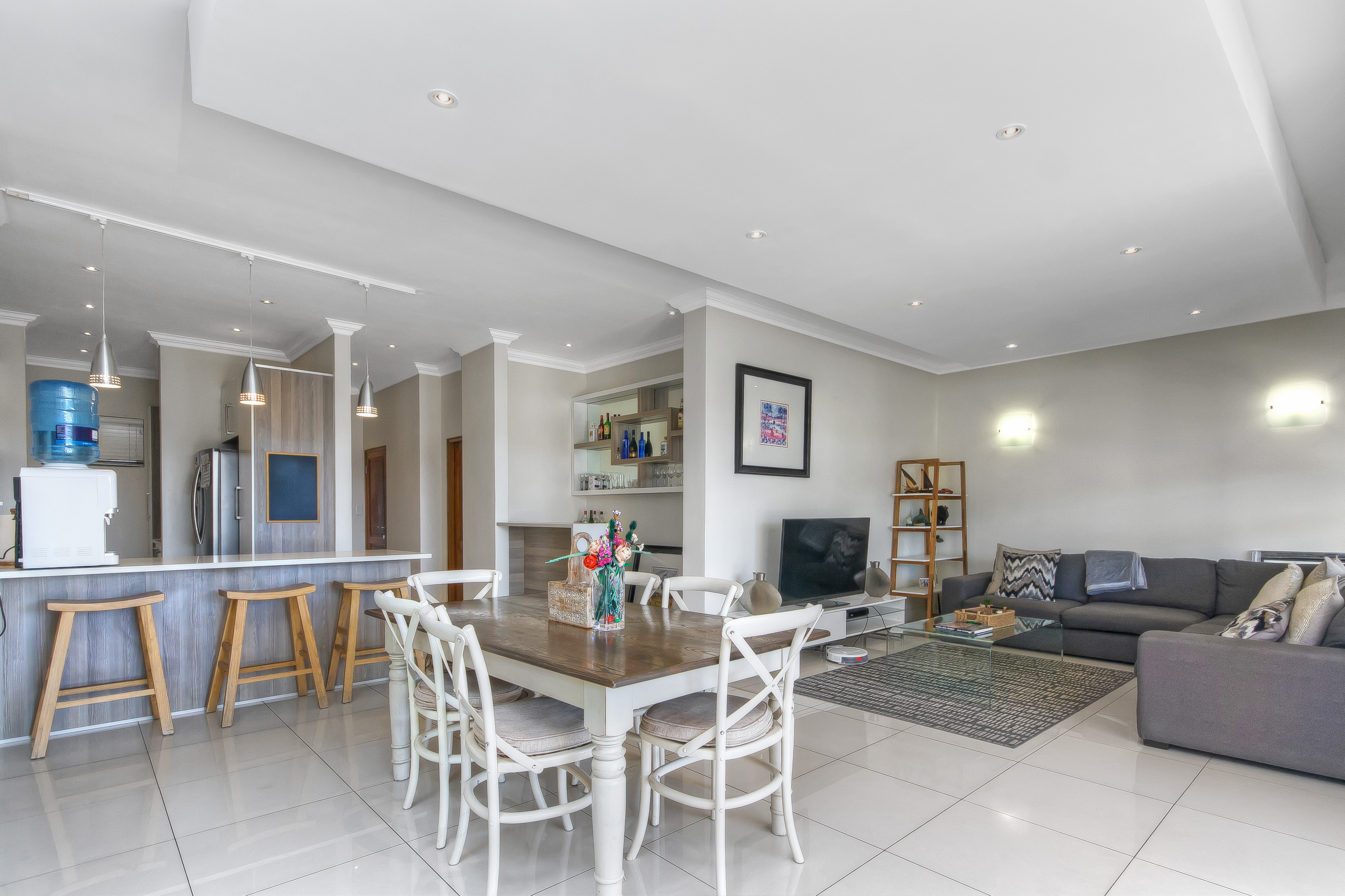 Open-plan immaculate and luxuriously styled kitchen and scullery with loads cupboards and eat in counter , leads through to the most spectacular living space , a great flow through out the apartment with meticulous architectural features and once again A WOW living area with bright light flowing through the home and the most incredible energy flowing from room to room .