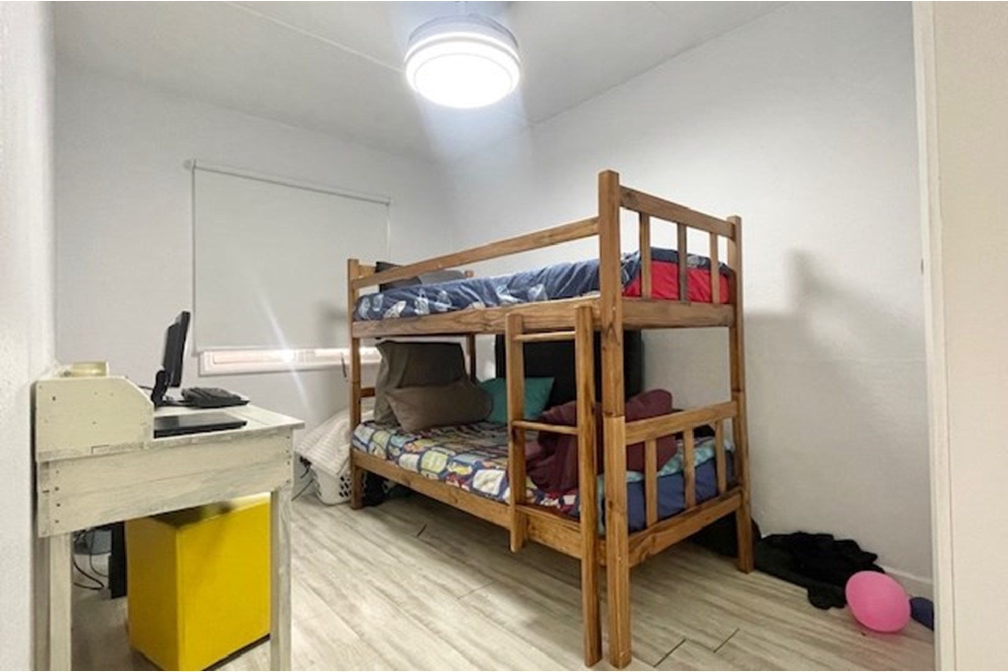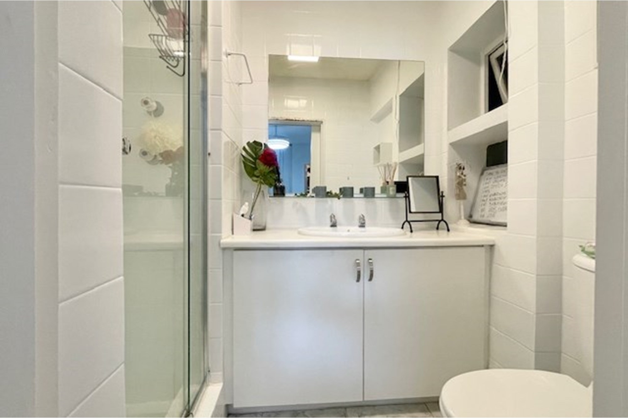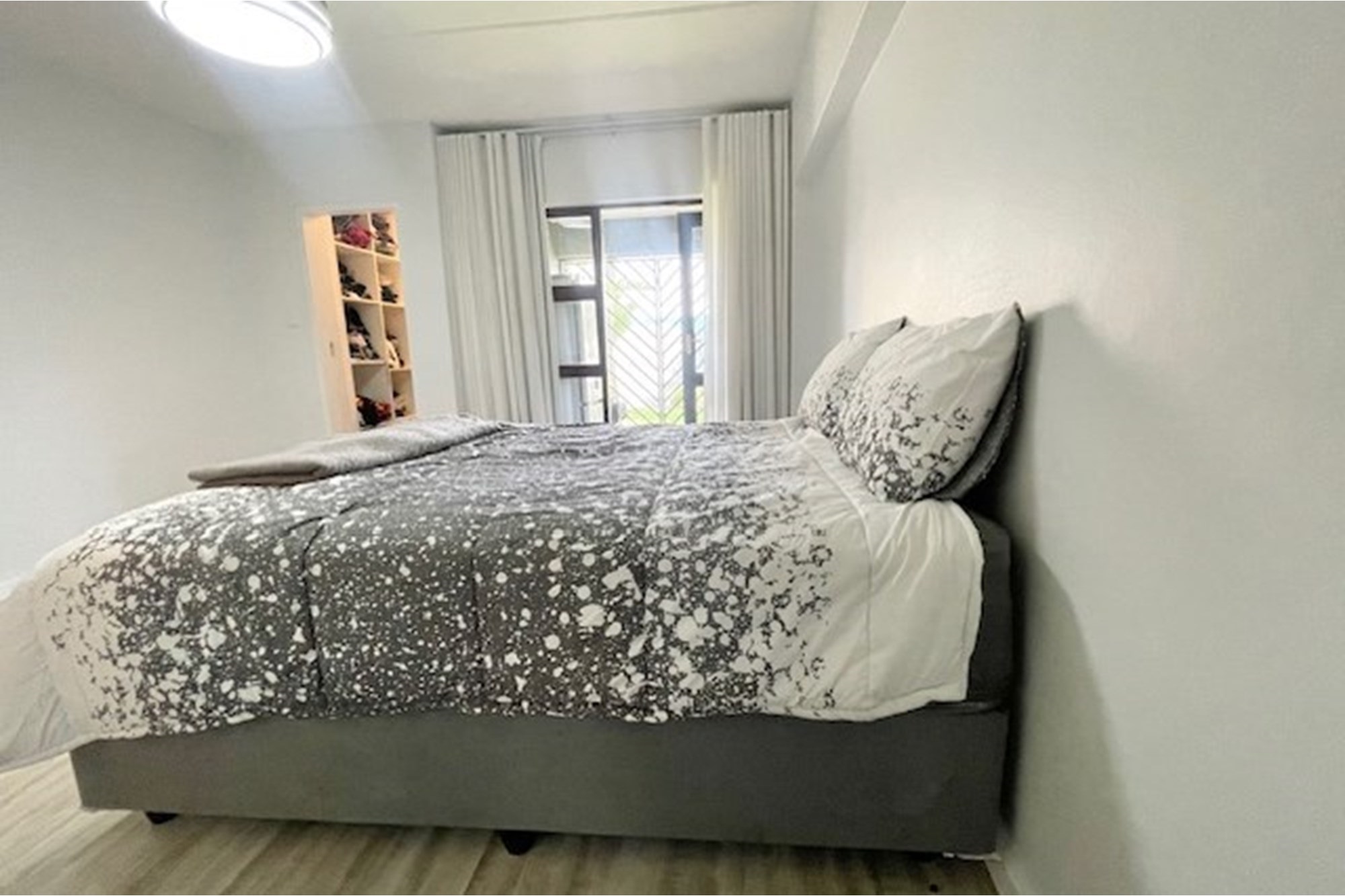 The two bedrooms are separated from the main living space for privacy. The master bedroom includes an en-suite bathroom with shower and a walk-in closet, while the 2nd bedroom has access to a full bathroom.