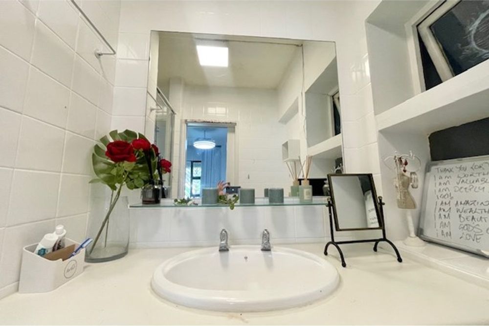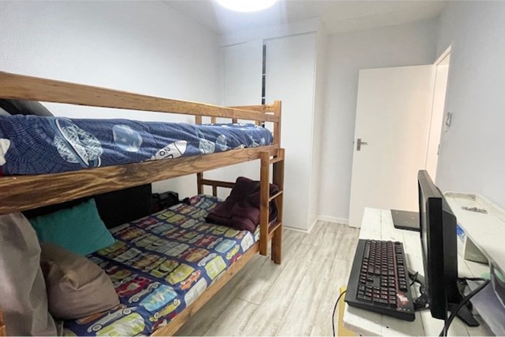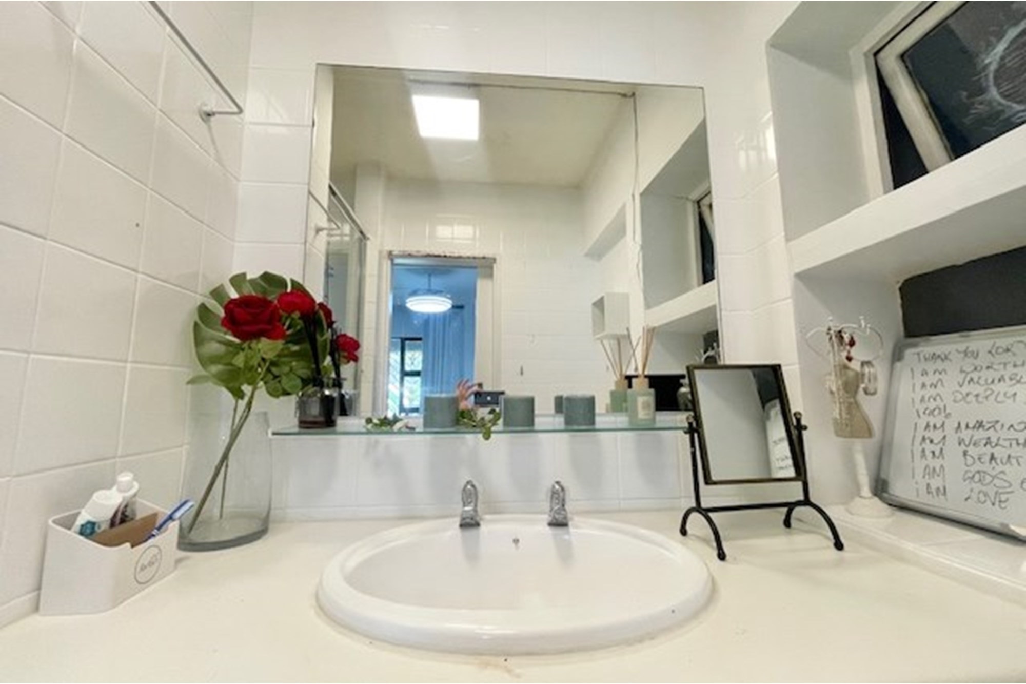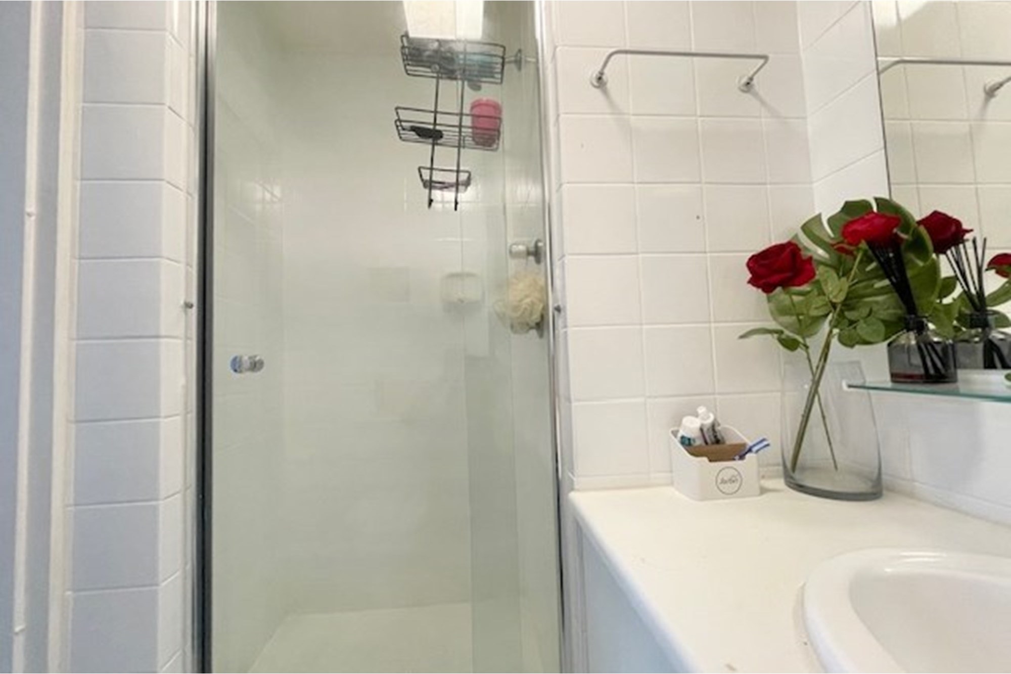 The two bedrooms are separated from the main living space for privacy. The master bedroom includes an en-suite bathroom with shower and a walk-in closet, while the 2nd bedroom has access to a full bathroom.