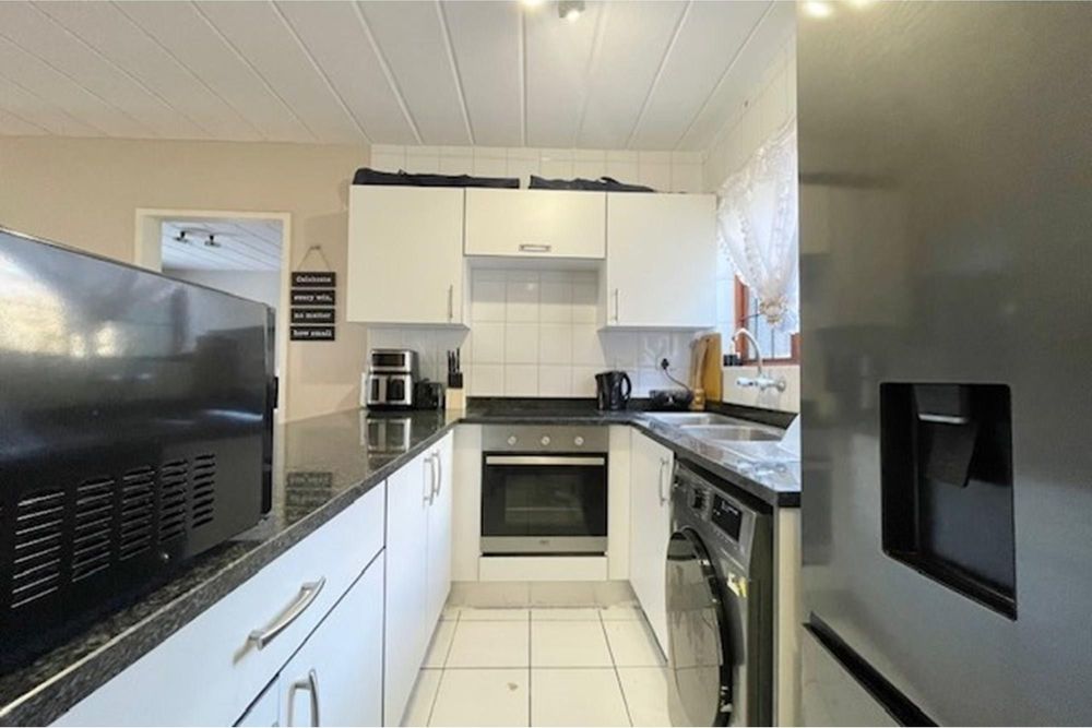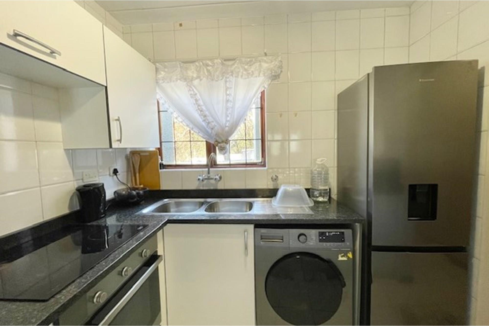 Lounge and kitchen open plan. Kitchen with melamine surfaces, double sink, electrical stove. Space for single fridge/freezer and 1 under counter appliance.