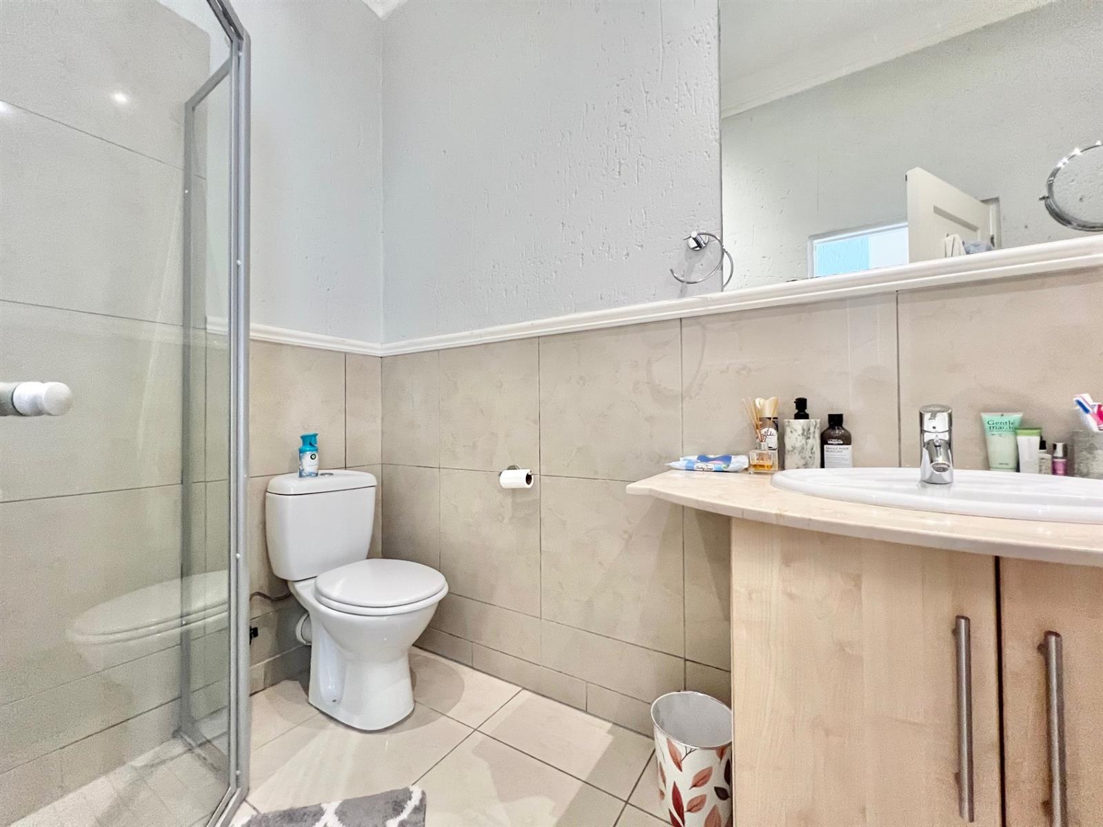 Upstairs are two carpeted ensuite bedrooms, both with additional built-in cupboards, balconies, and good natural light. The main bathroom includes a bath and shower, while the second bathroom offers a shower. A guest toilet is conveniently located downstairs.