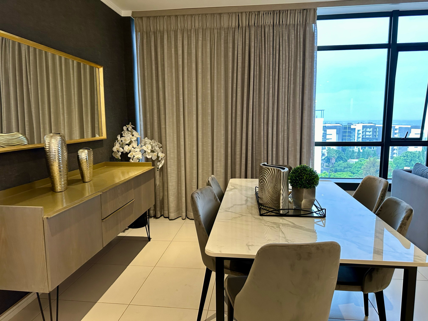 As you step into this luxurious 107-square-meter apartment at Masingita Towers, Morningside, you are greeted by a seamlessly designed living space that exudes both style and comfort. The entire unit has been meticulously furnished to create a sophisticated and inviting atmosphere.