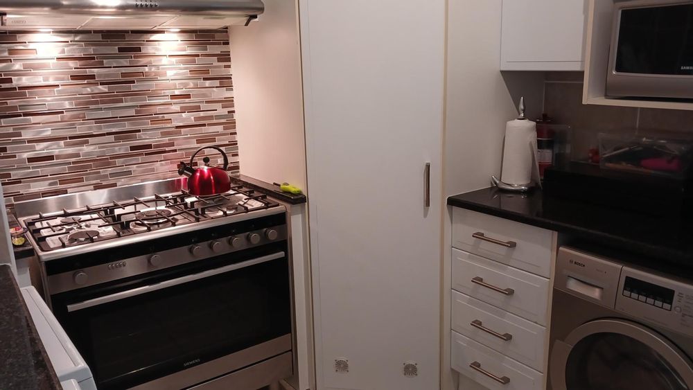 The generous living area invites relaxation, complete with a Juliette balcony that allows natural light to fill the space. There is an additional smaller balcony with a gas braai and extractor making outdoor cooking and entertaining easy. The modern, granite kitchen has a gas hob, a large oven, and space for a fridge and three appliances.