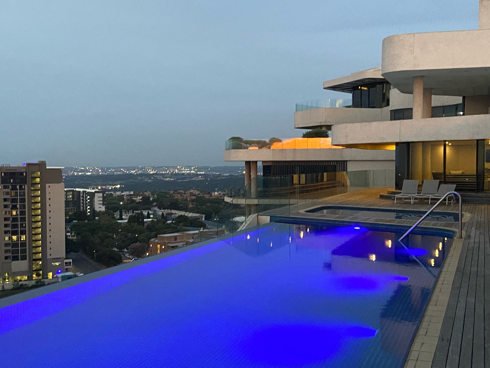 The unique rooftop Skydeck, which offers 360-degree views of the Sandton skyline and beyond, is an architectural marvel. Luxurious partying and relaxation at their best are made possible by the large wooden terrace and heated infinity pool.