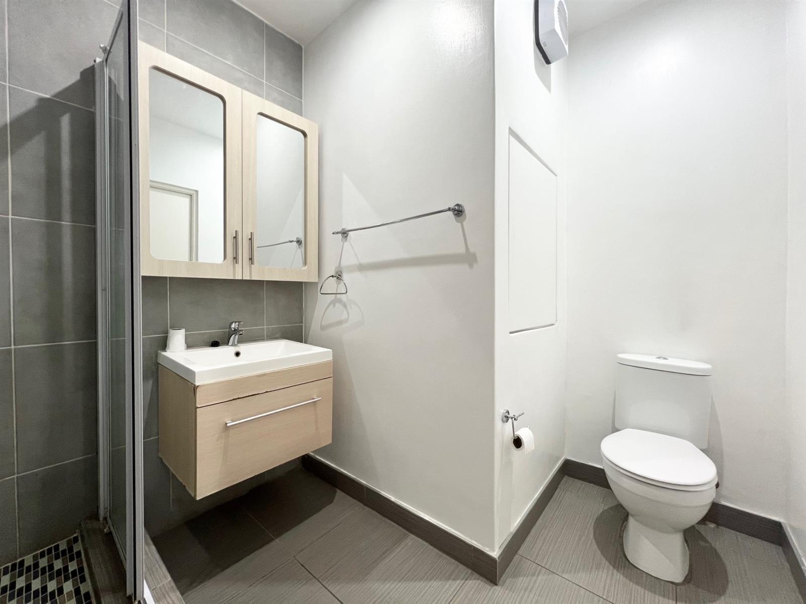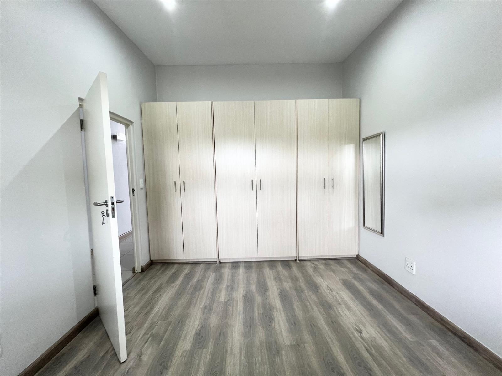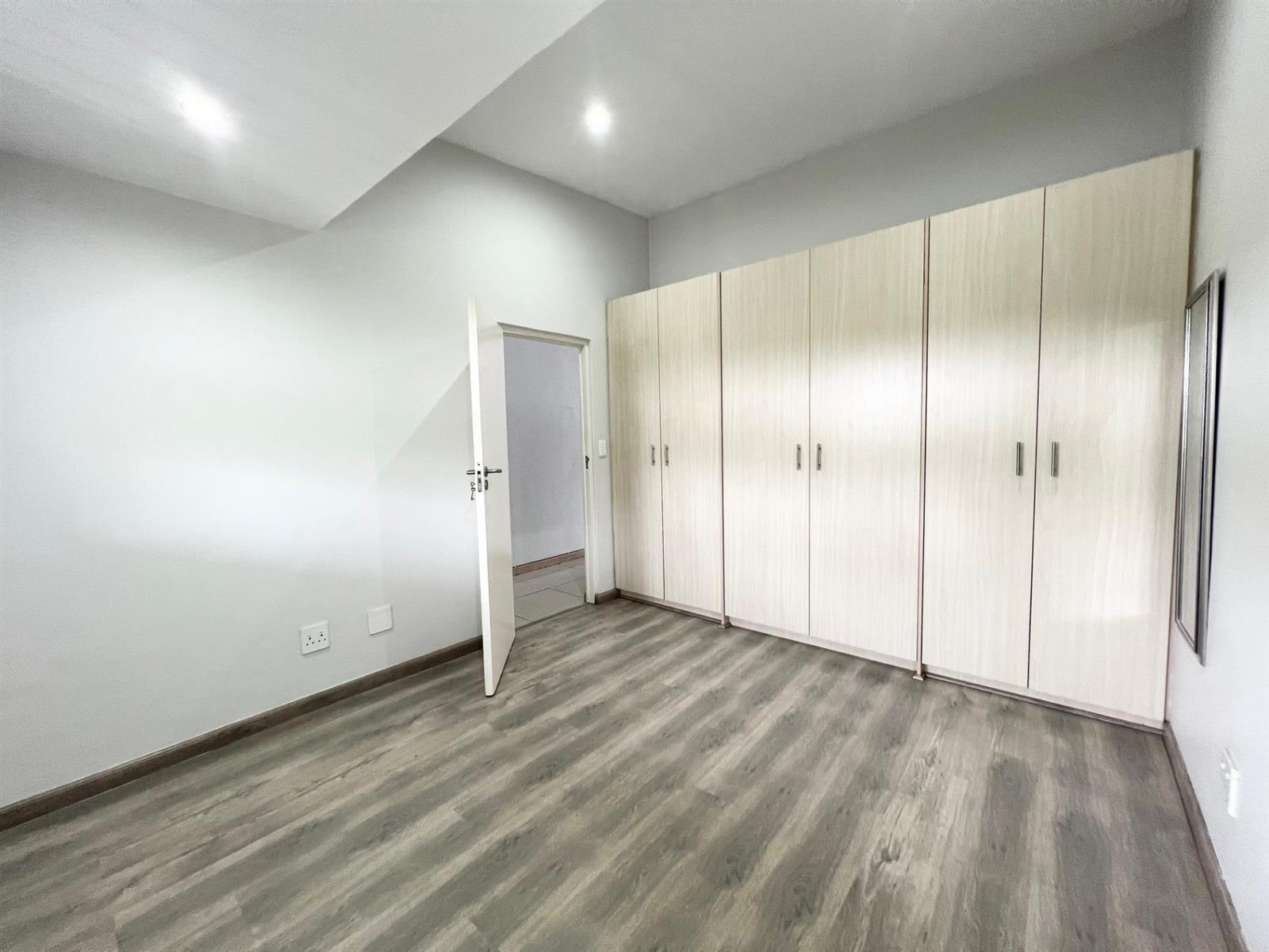 Inside, laminate wood floors add warmth and sophistication to the bedroom and living spaces, while the kitchen, passage, and bathroom are finished with sleek, easy-to-maintain tiles. The bedroom includes ample built-in cupboard space, and the bathroom is fitted with a shower, vanity, and toilet for modern convenience.