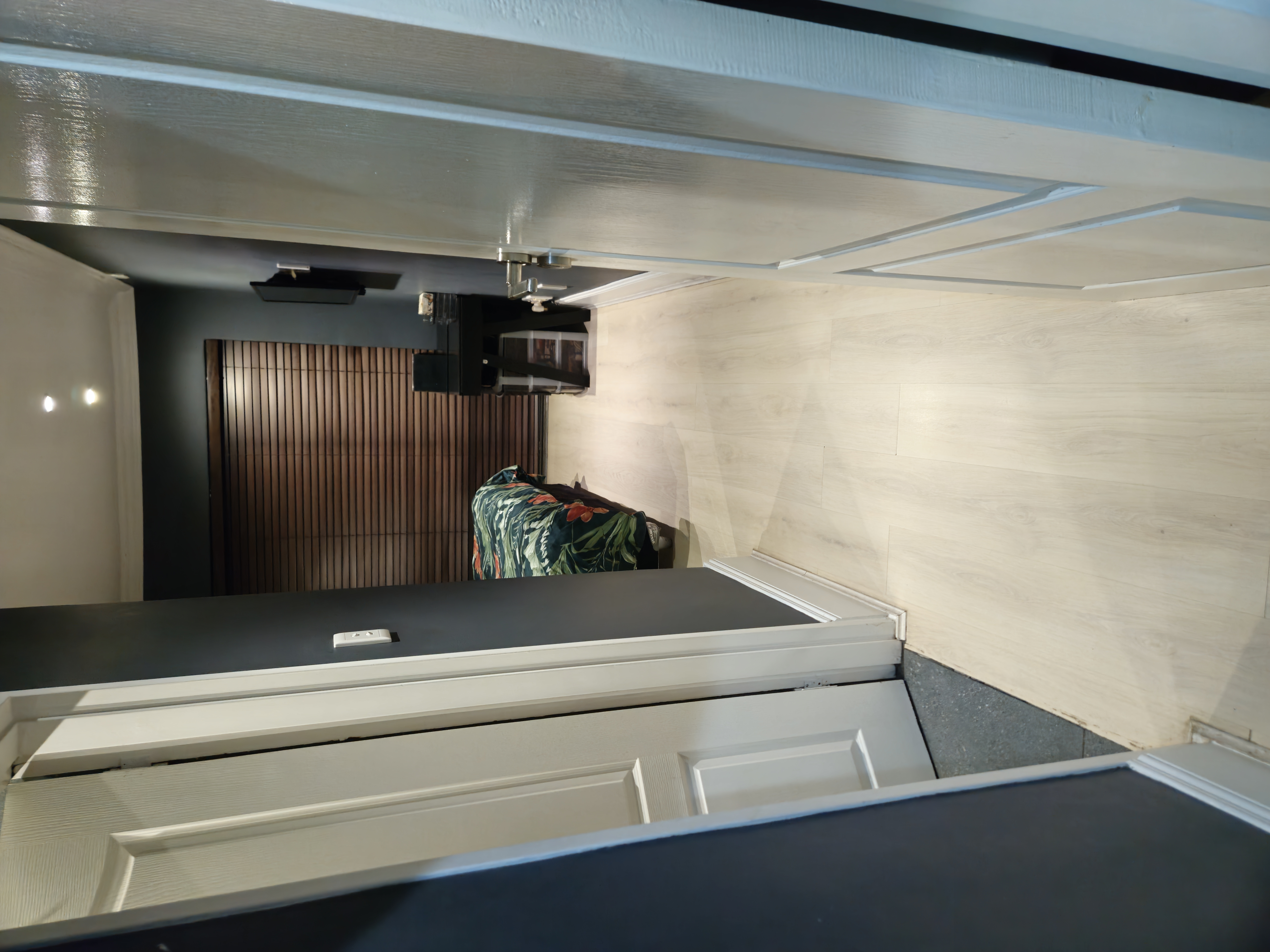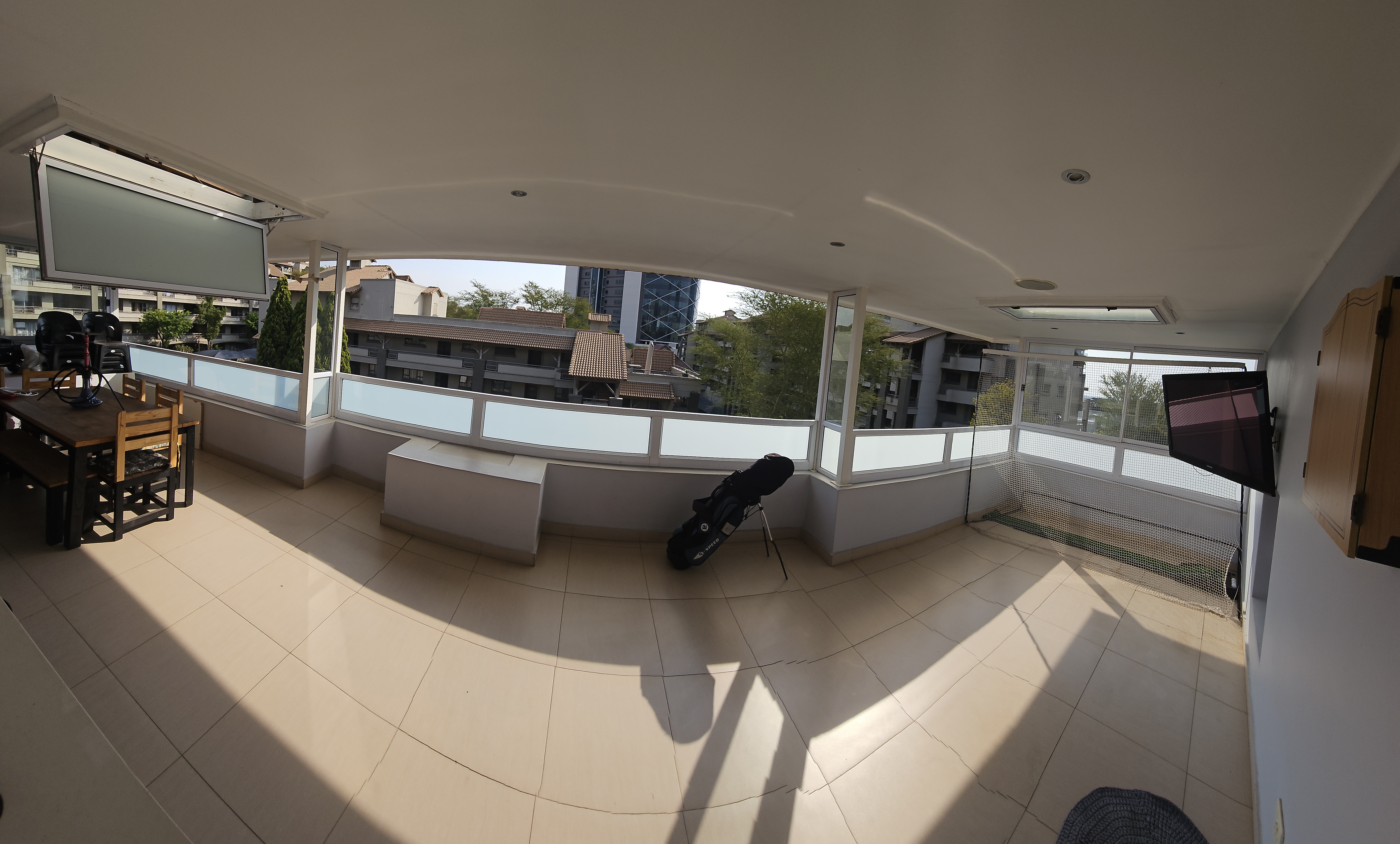 The compact yet efficient kitchen offers excellent cupboard and pantry space. At the same time, the unique iron staircase leads to an upper entertainment area—an enormous second balcony perfect for gatherings or relaxing under the stars with breathtaking views of Sandton's most iconic landmarks, including The Leonardo, The Michael Angelo, and Sandton City.