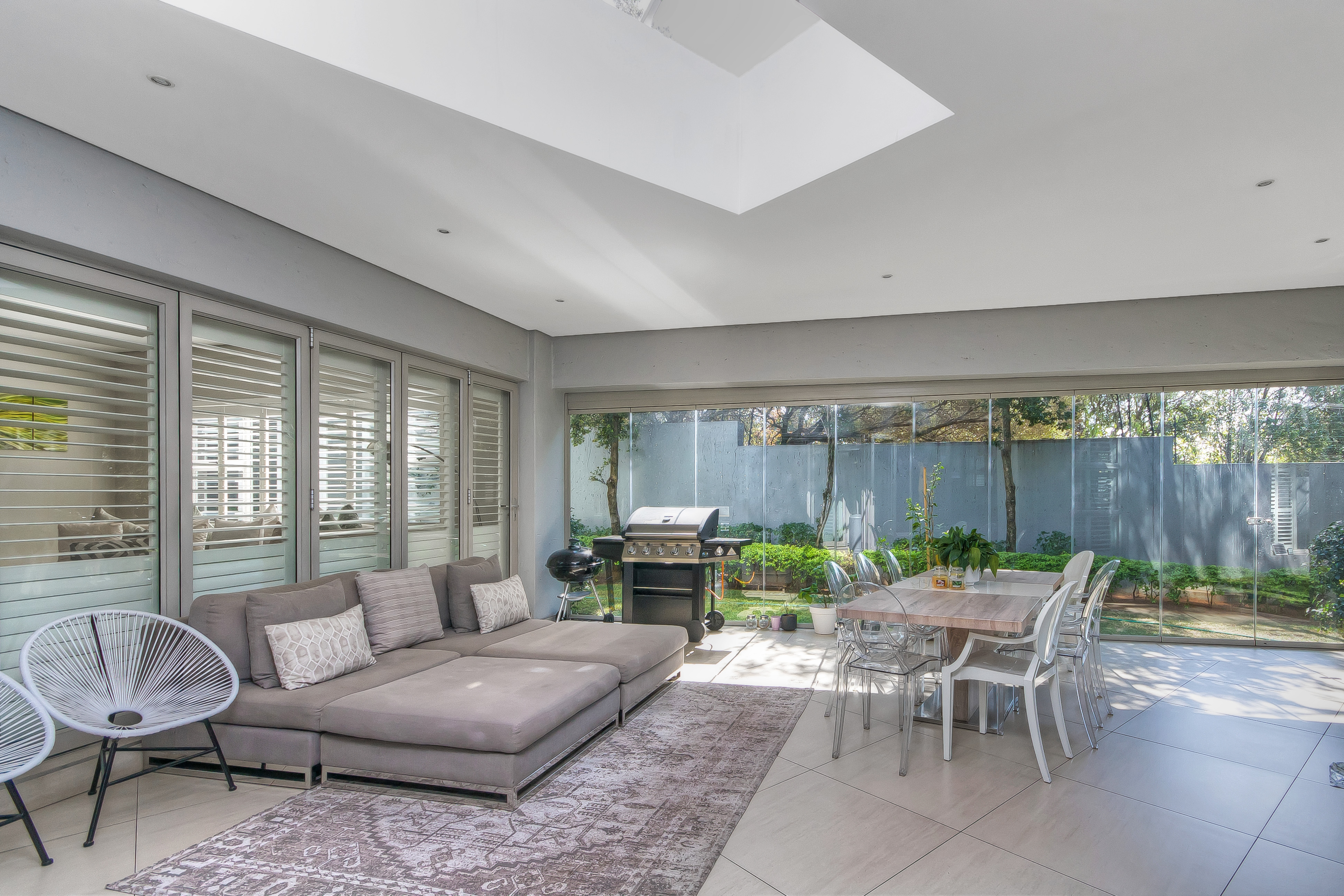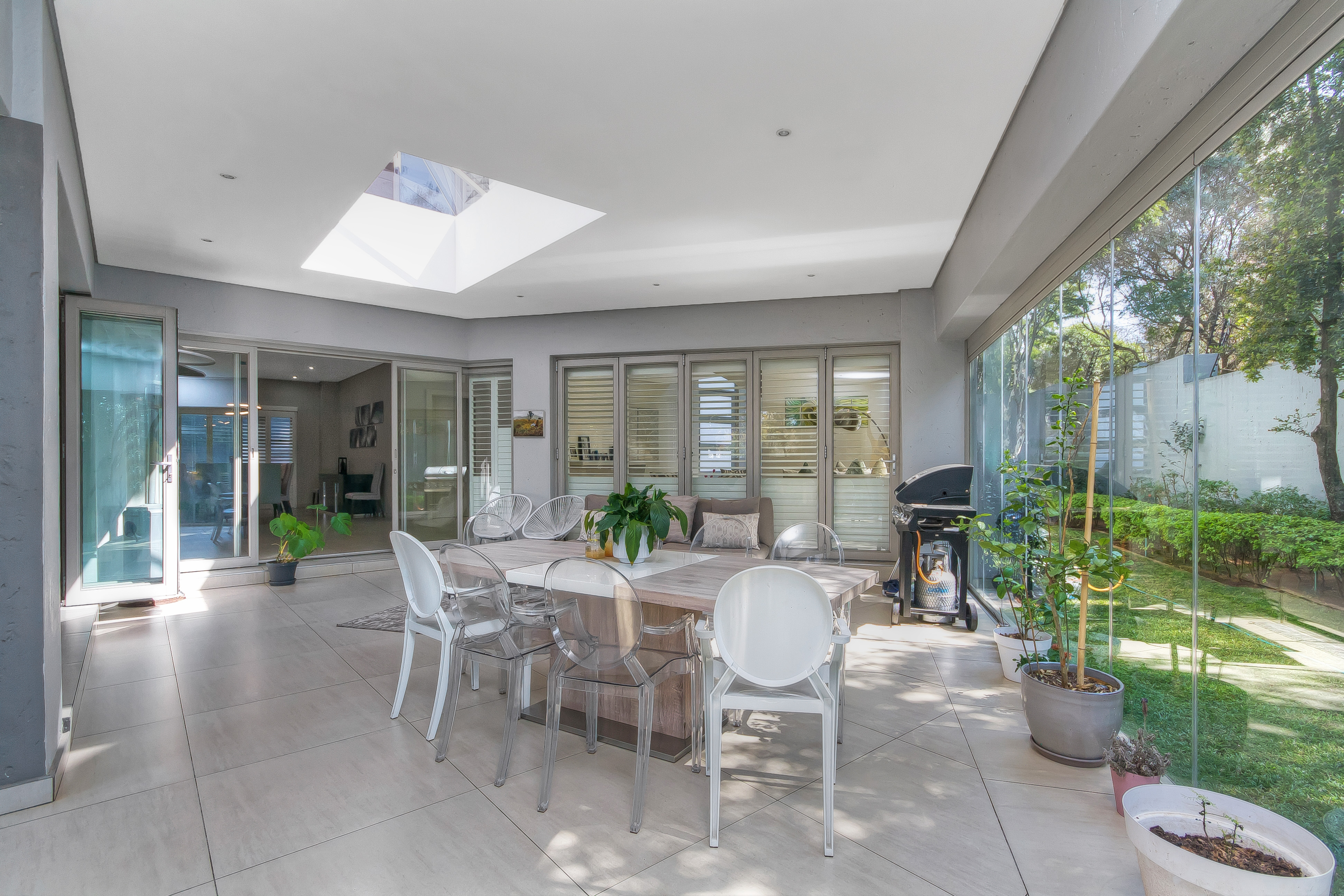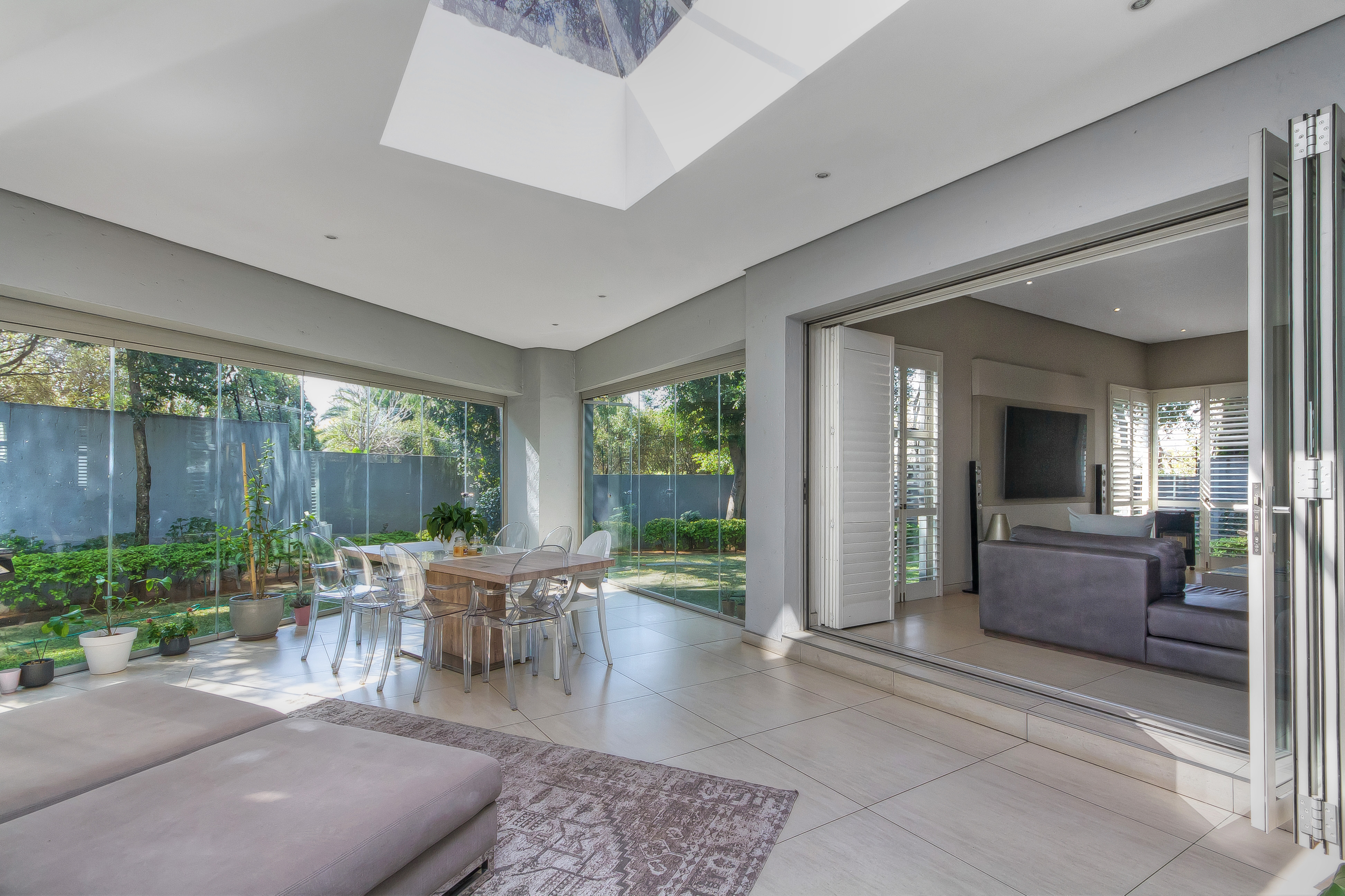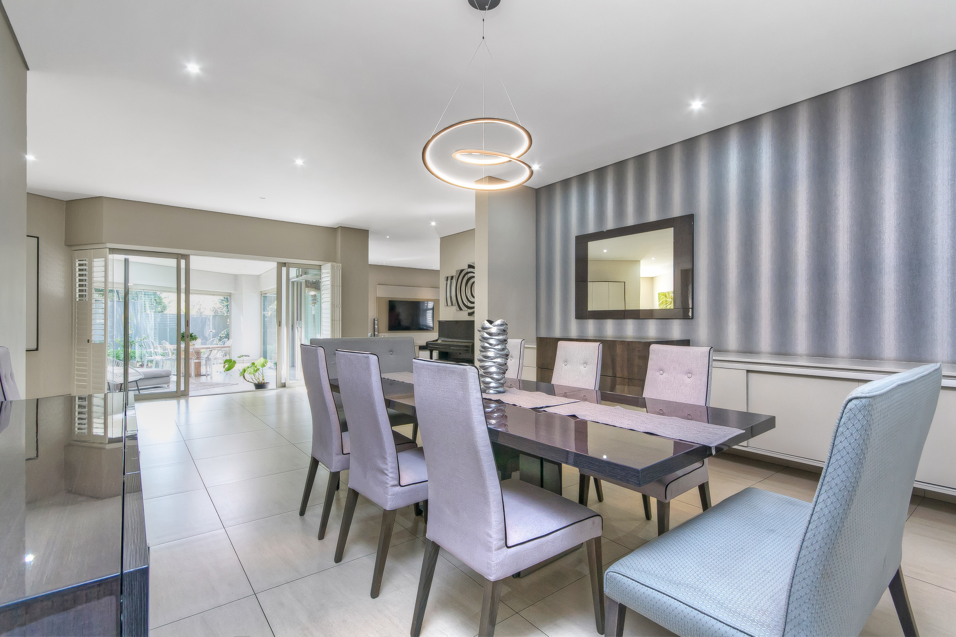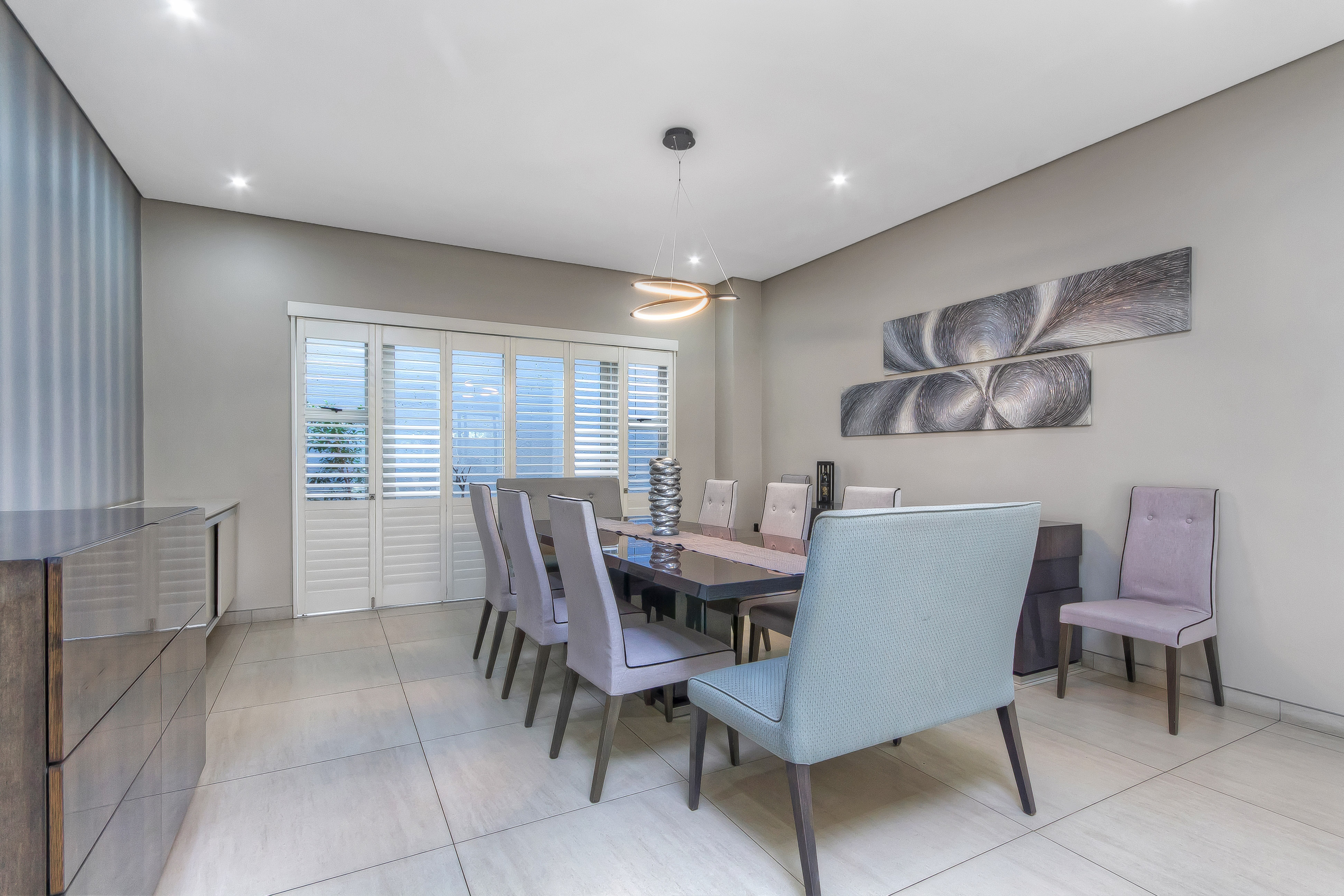 An extra large open formal dining and additional lounge area leading off from grand foyer entrance from the home , fit for royalty plus again leading through to the additional inside / outside glass encased living space , with fitted shutters and fold away doors ,which opens onto and leads to the garden area with greenery and the beauty of nature and a beautiful setting of a setting from the “hundred acre wood “, blending the home together with life and nature .