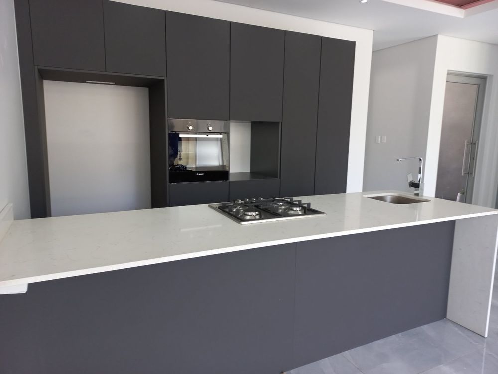 Kitchen sports a gas stove top built in oven, push to open cabinetry for ample storage, plus white and grey quartz countertops.