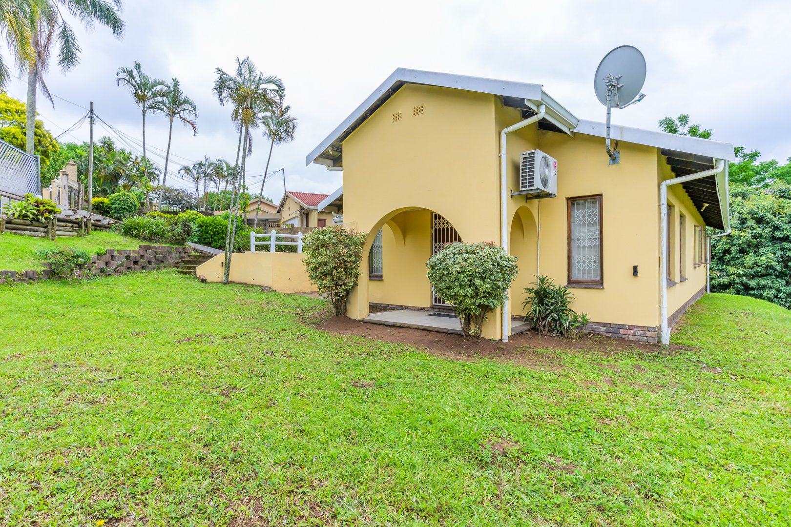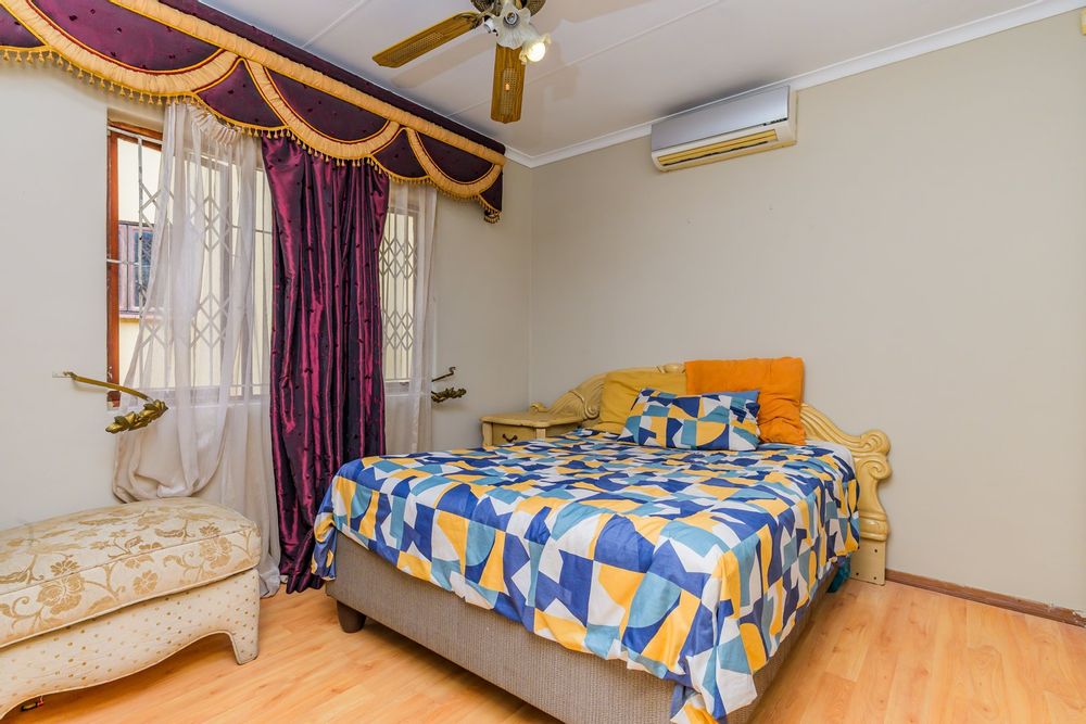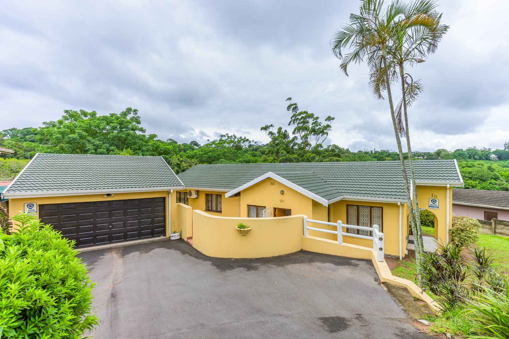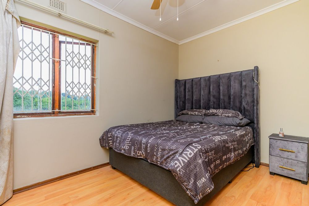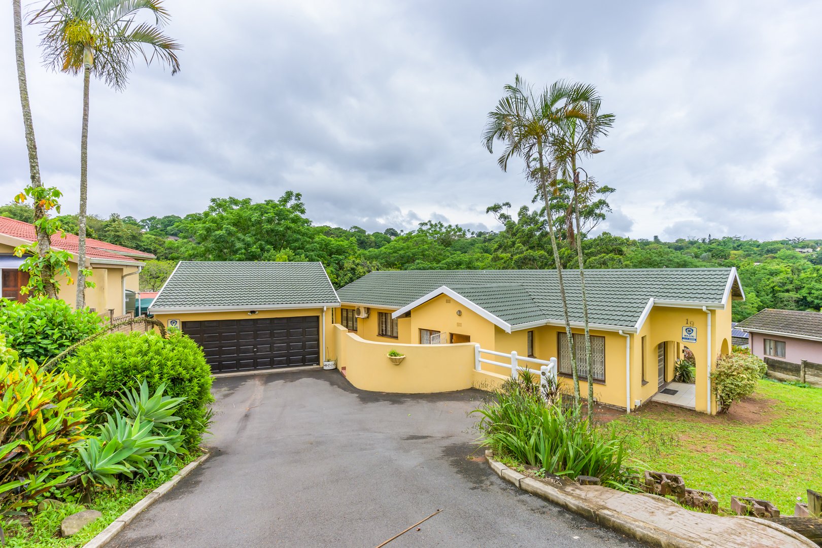 Charming single-story , nestled in a cul de sac in Moseley Park, Pinetown. This inviting property offers a distinctive curb appeal with its vibrant exterior and well-maintained garden, featuring tall palm trees and dense foliage. The paved driveway leads to a double automated garage, providing ample parking for up to four vehicles.