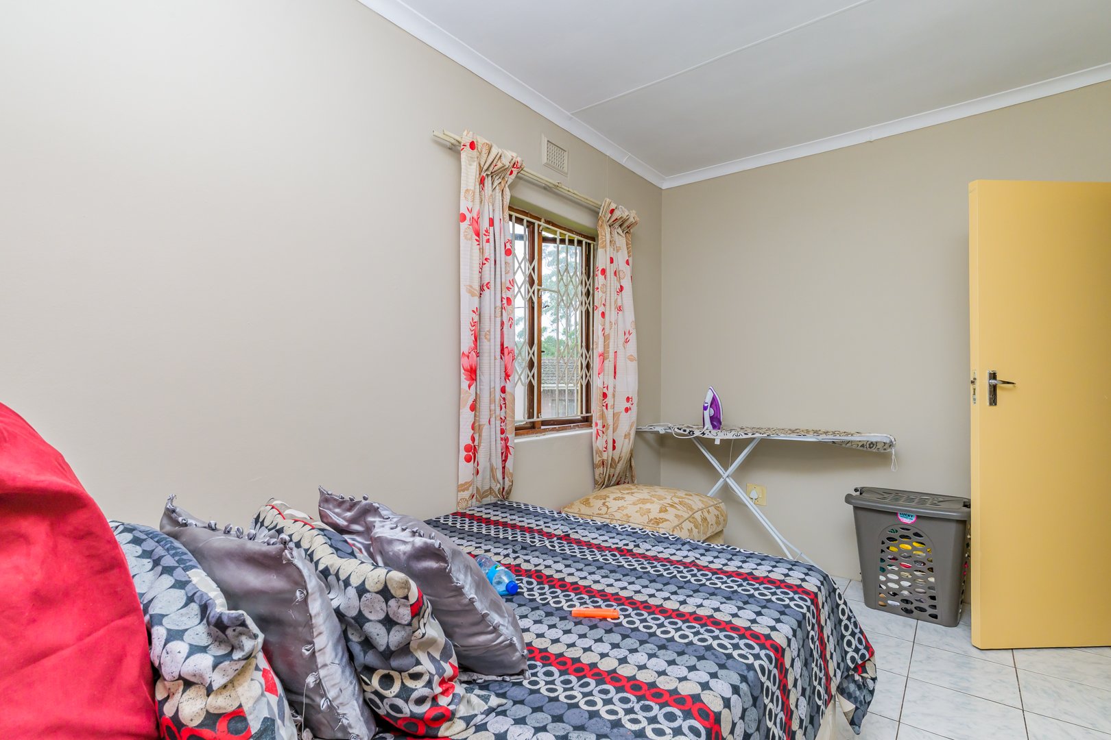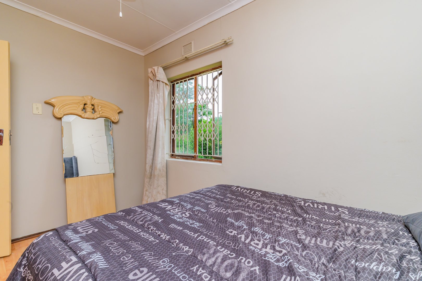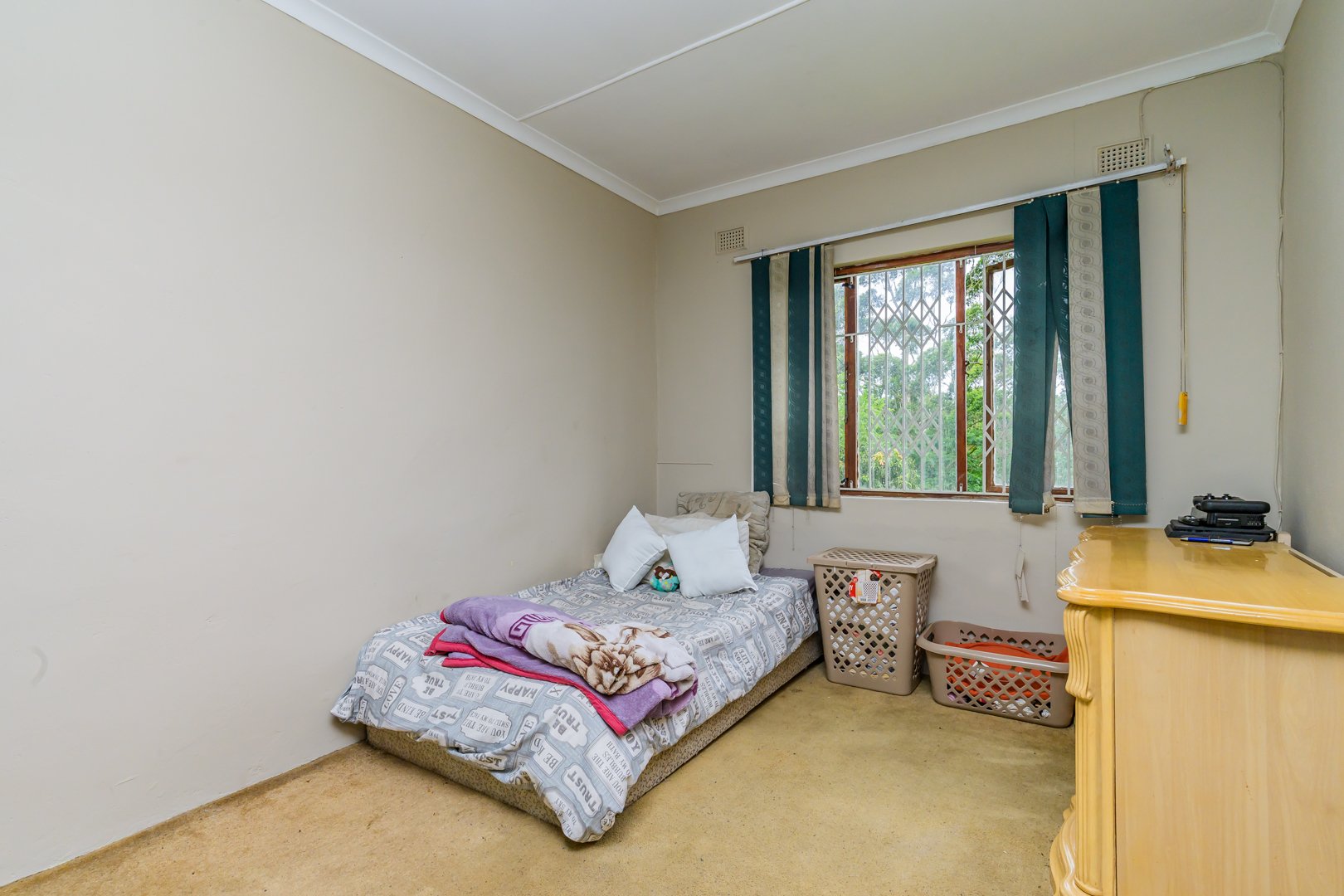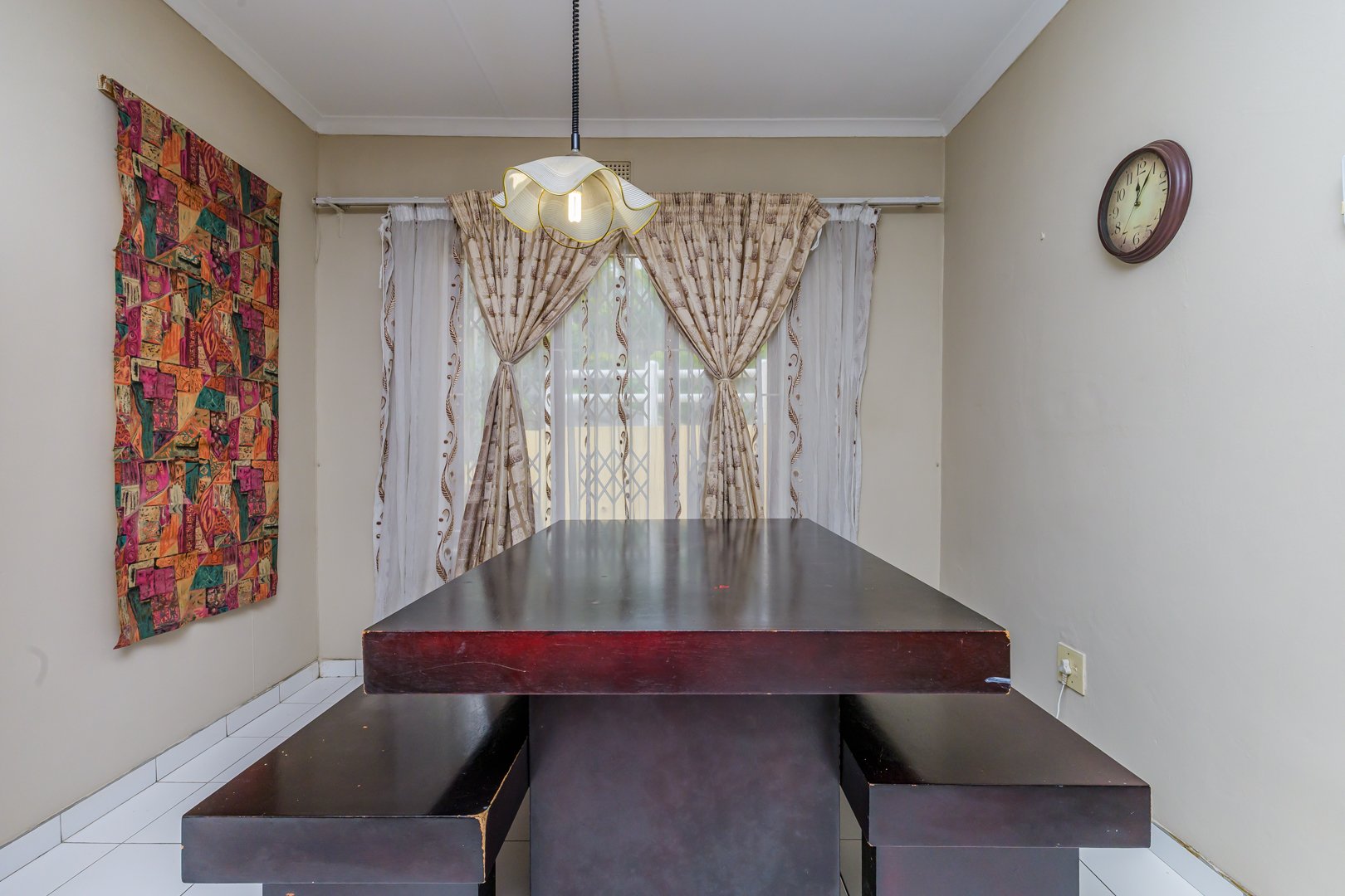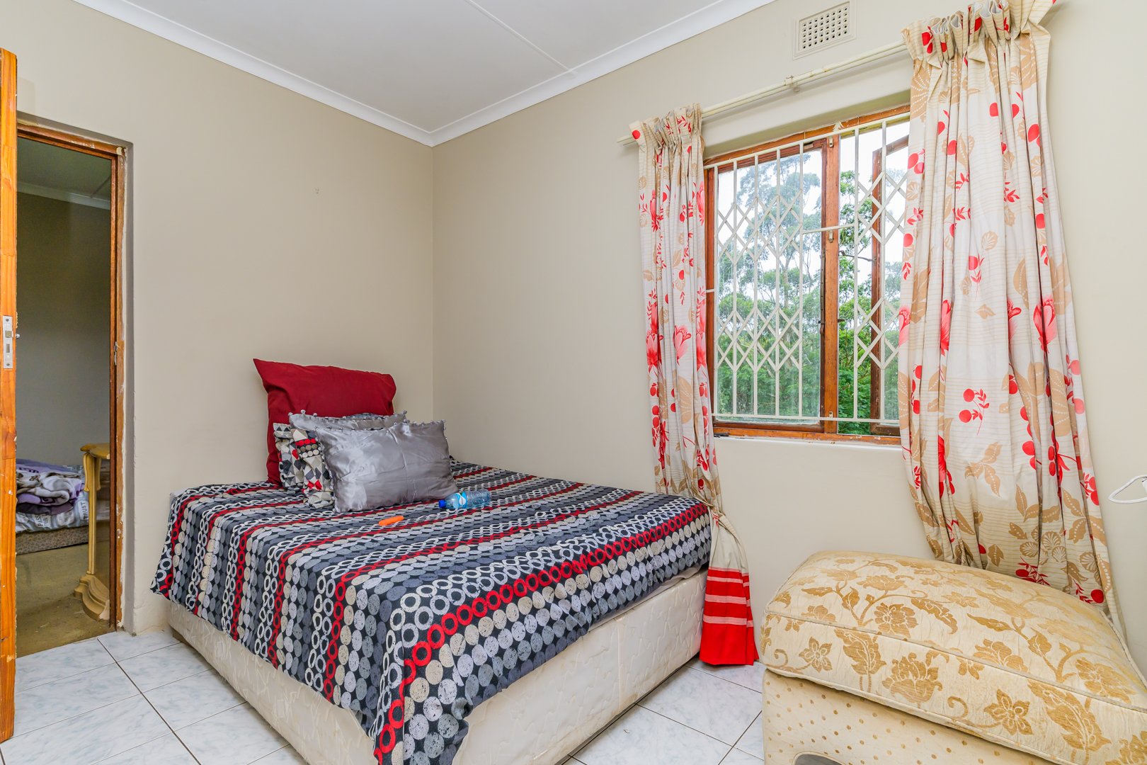 Charming single-story , nestled in a cul de sac in Moseley Park, Pinetown. This inviting property offers a distinctive curb appeal with its vibrant exterior and well-maintained garden, featuring tall palm trees and dense foliage. The paved driveway leads to a double automated garage, providing ample parking for up to four vehicles.