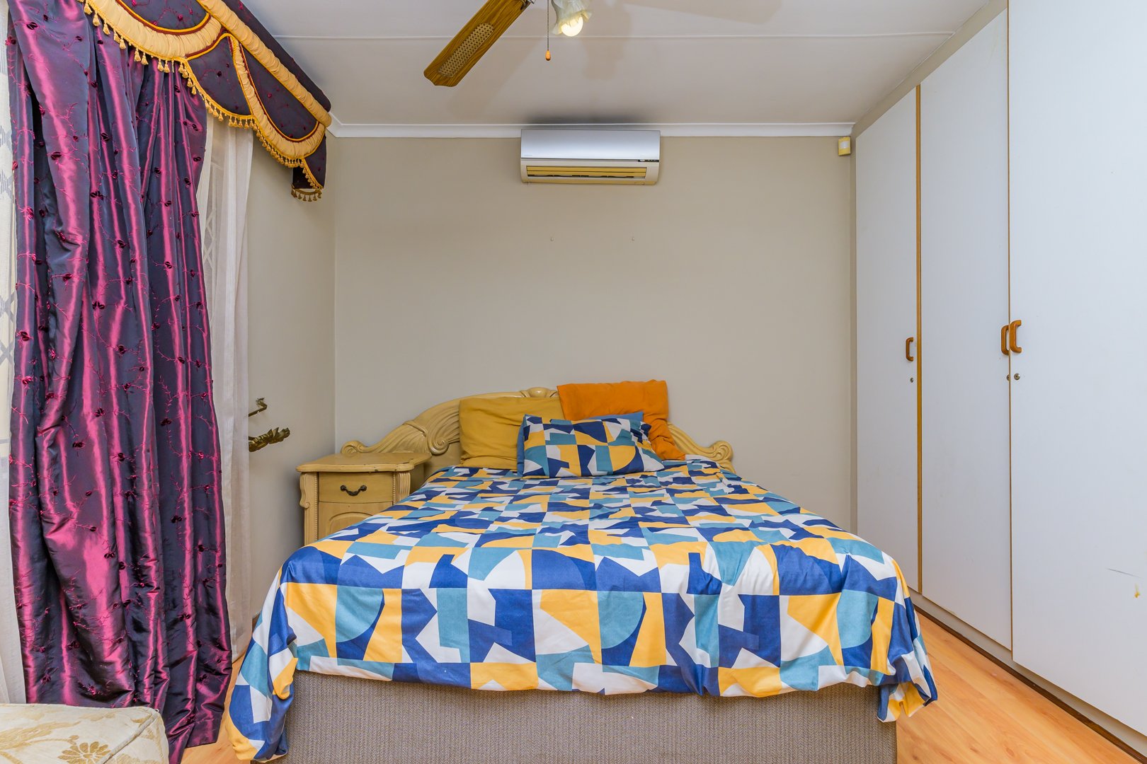 Step inside to discover a spacious interior designed for comfortable living. The home features a generous lounge and a dedicated dining room, both benefiting from abundant natural light through multiple windows. White tiled flooring extends throughout these areas, complemented by neutral wall colours, providing a versatile canvas. Climate control is ensured with ceiling fans and air conditioning units. The functional kitchen boasts white cabinetry, ample counter space, and a built-in under counter oven and hob.