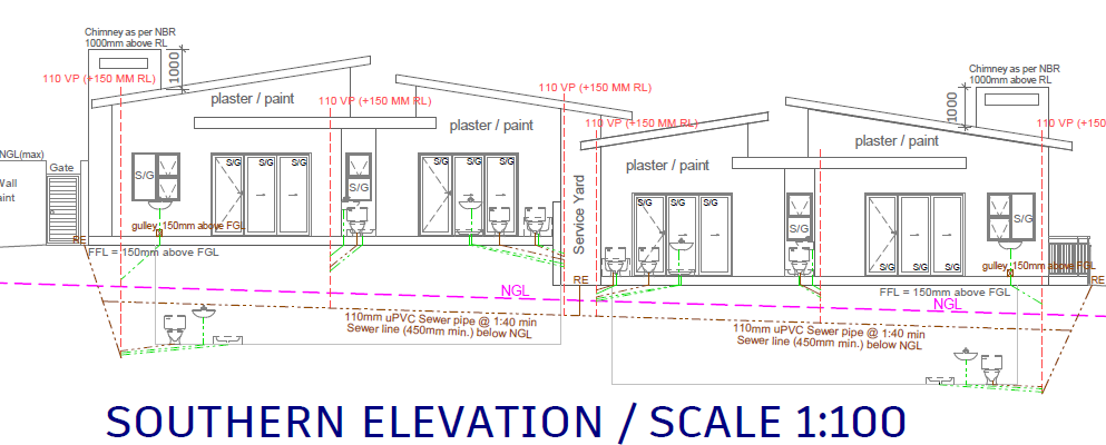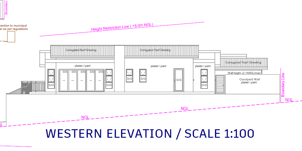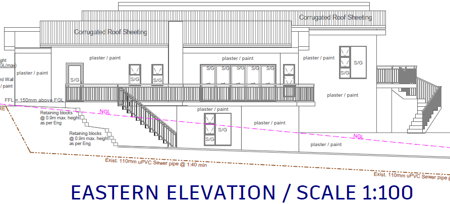 The building is a Duet that is two mirrored units with a shared wall and slightly offset in its footprint. Each unit has two different sections of angled roof divided by a duct that runs right through for exterior windows, the building is two levels, a lower floor double garage for each unit to towards the interior shared wall a staircase in the center of each unit and an apartment to the exterior of each. The main living spaces on the upper floor. The level of the ground is sloped and dug out so that the Eastern unit has ground floor parking and a first floor that is on the same level as the Western unit but the Western unit has basement parking and a ground floor upstairs. The units can be customised at this stage or interested parties may choose colour schemes and finishing.