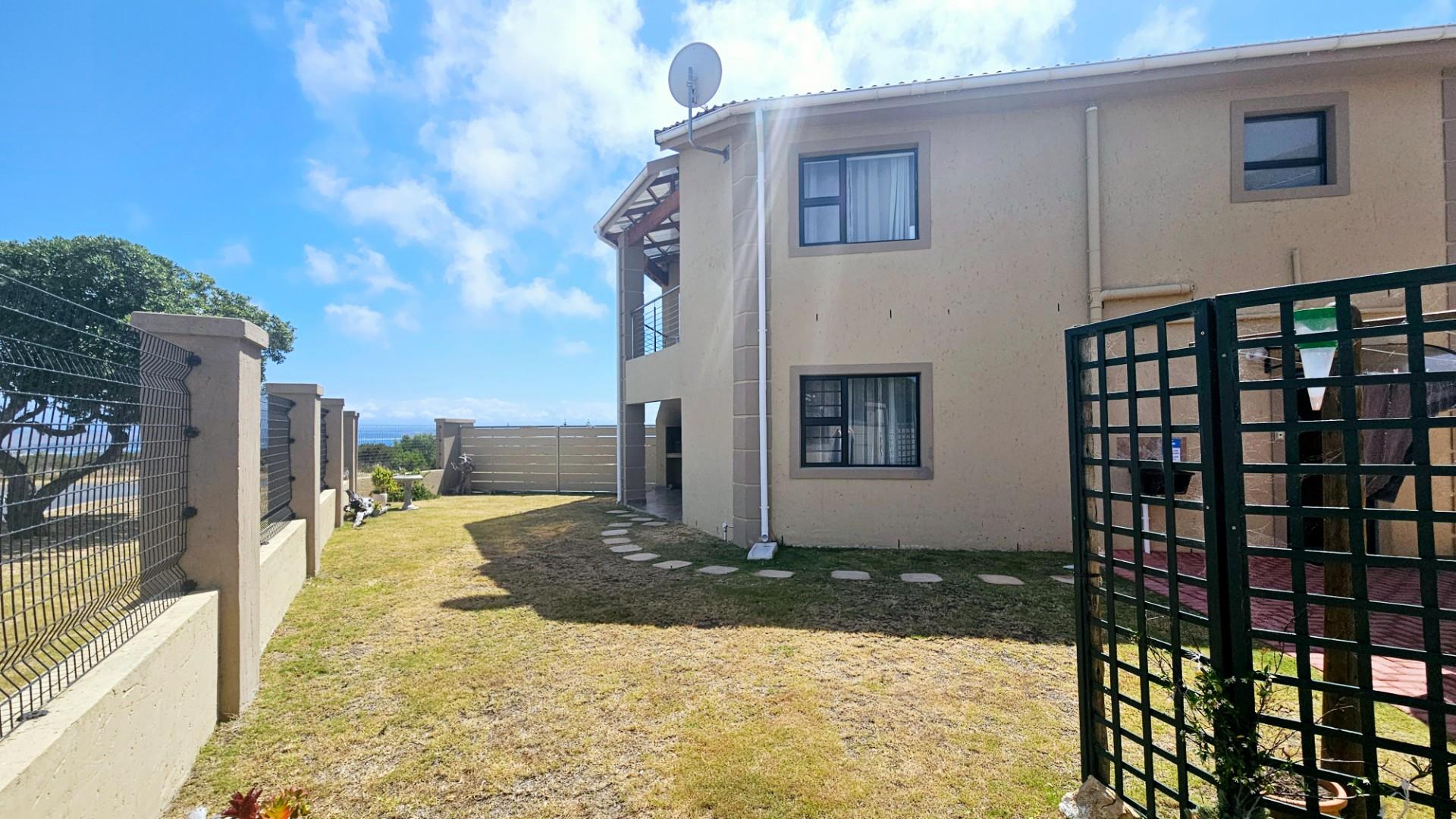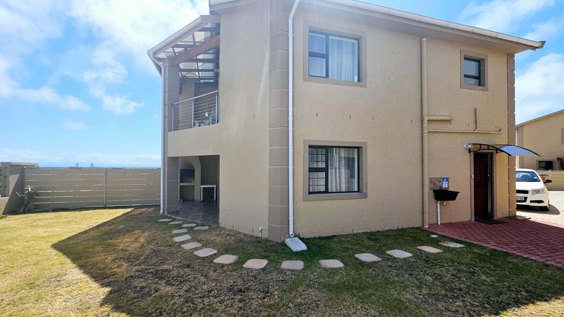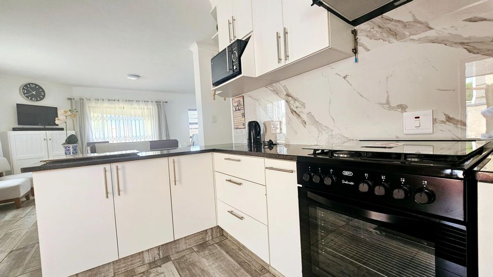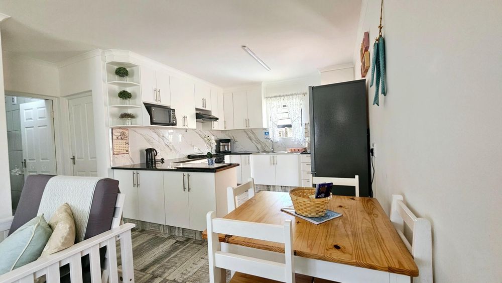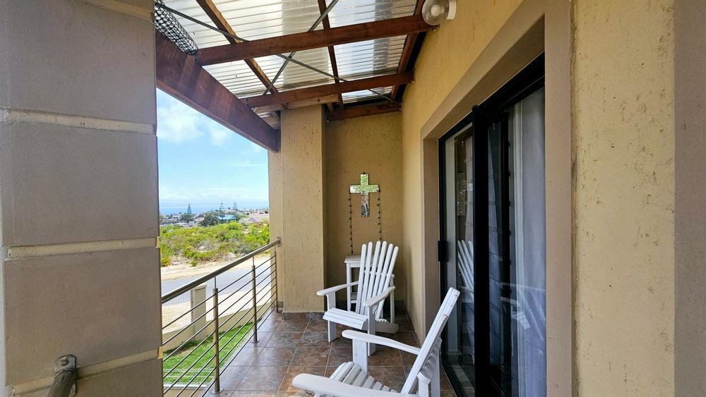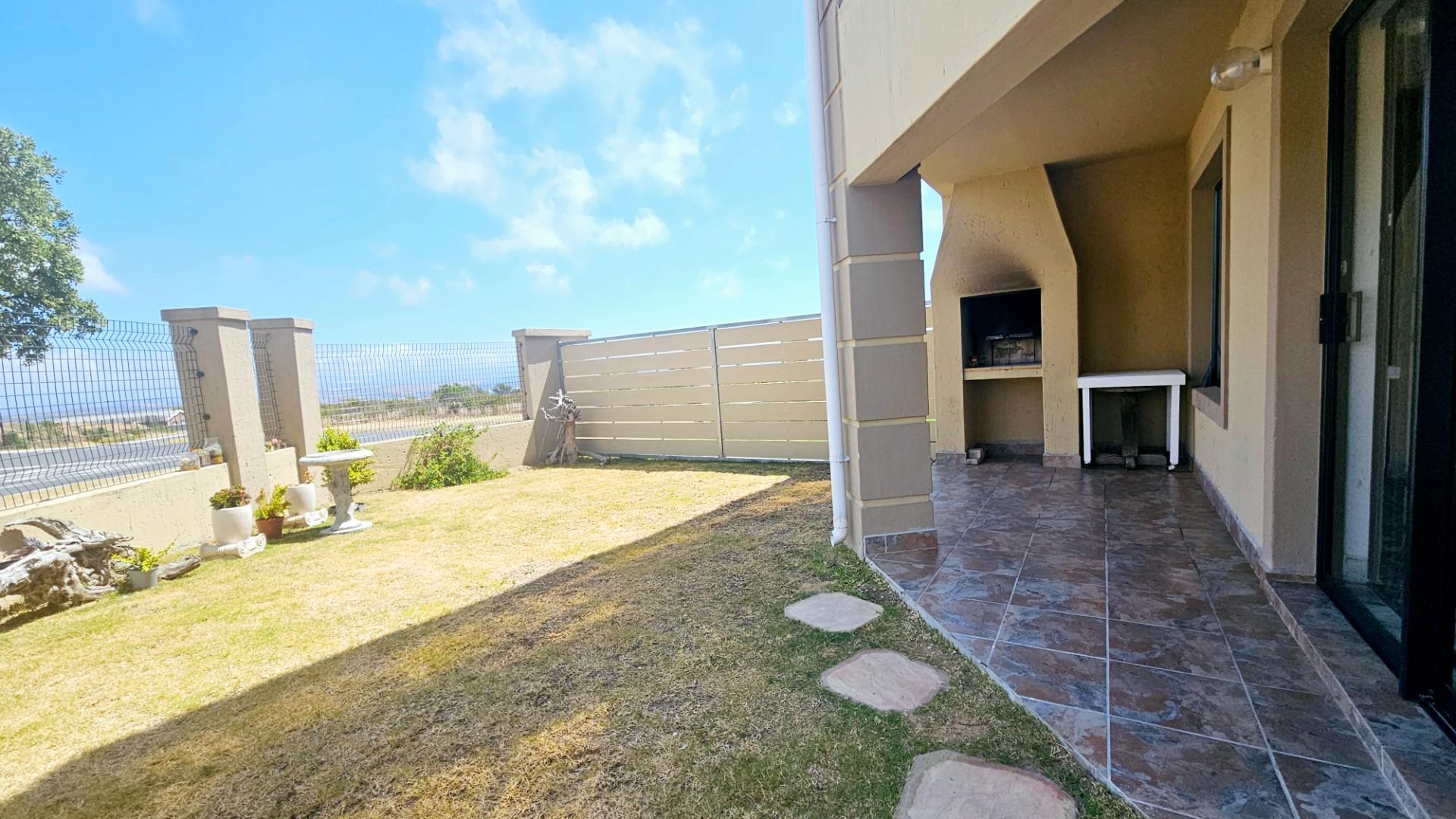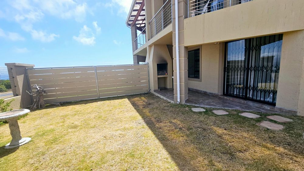 The home features three spacious bedrooms and two modern bathrooms, as well as a guest toilet conveniently located on the ground floor. The open-plan kitchen and living area create a warm and welcoming atmosphere, leading out to a covered patio with a built-in braai and a private, pet-friendly garden ideal for up to two small pets. Upstairs, a second covered patio is accessible from two of the bedrooms and offers lovely ocean views — the perfect setting to relax and enjoy Mossel Bay’s beautiful coastal climate.
