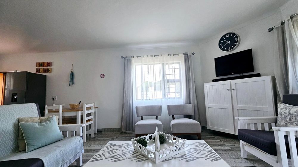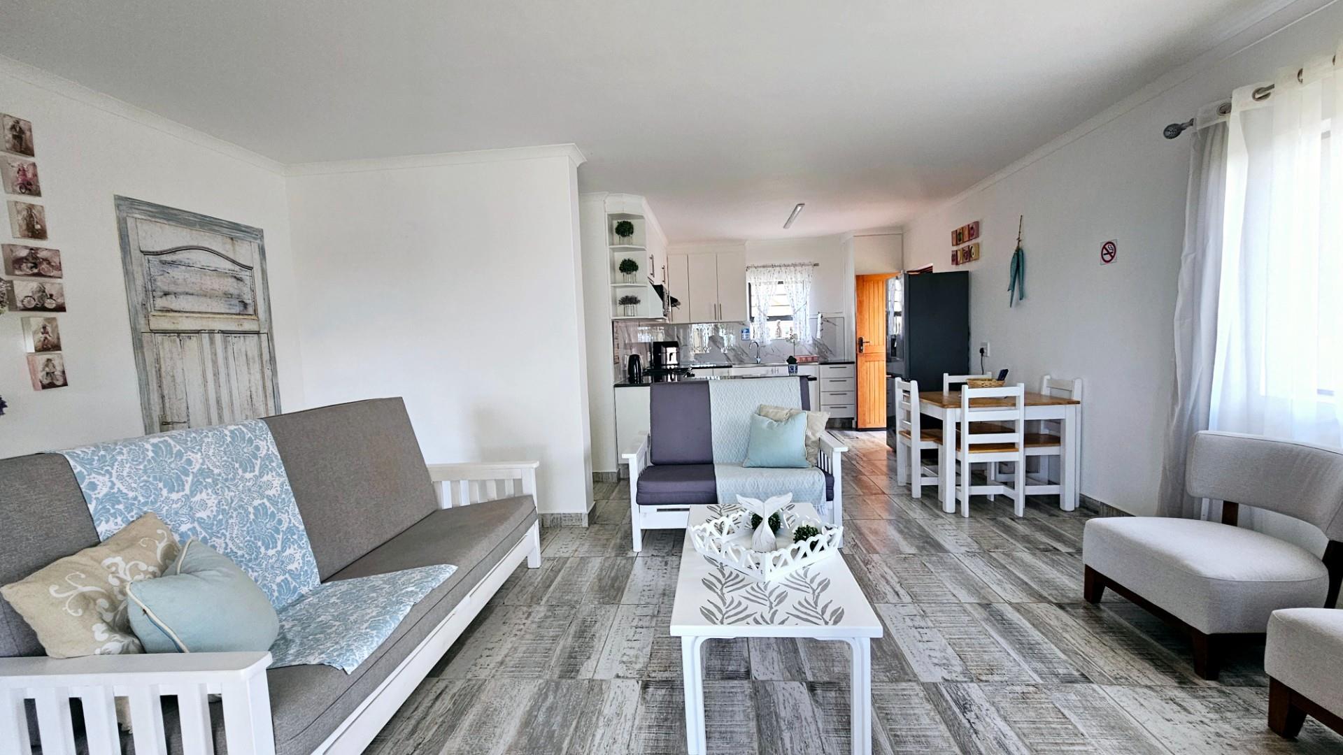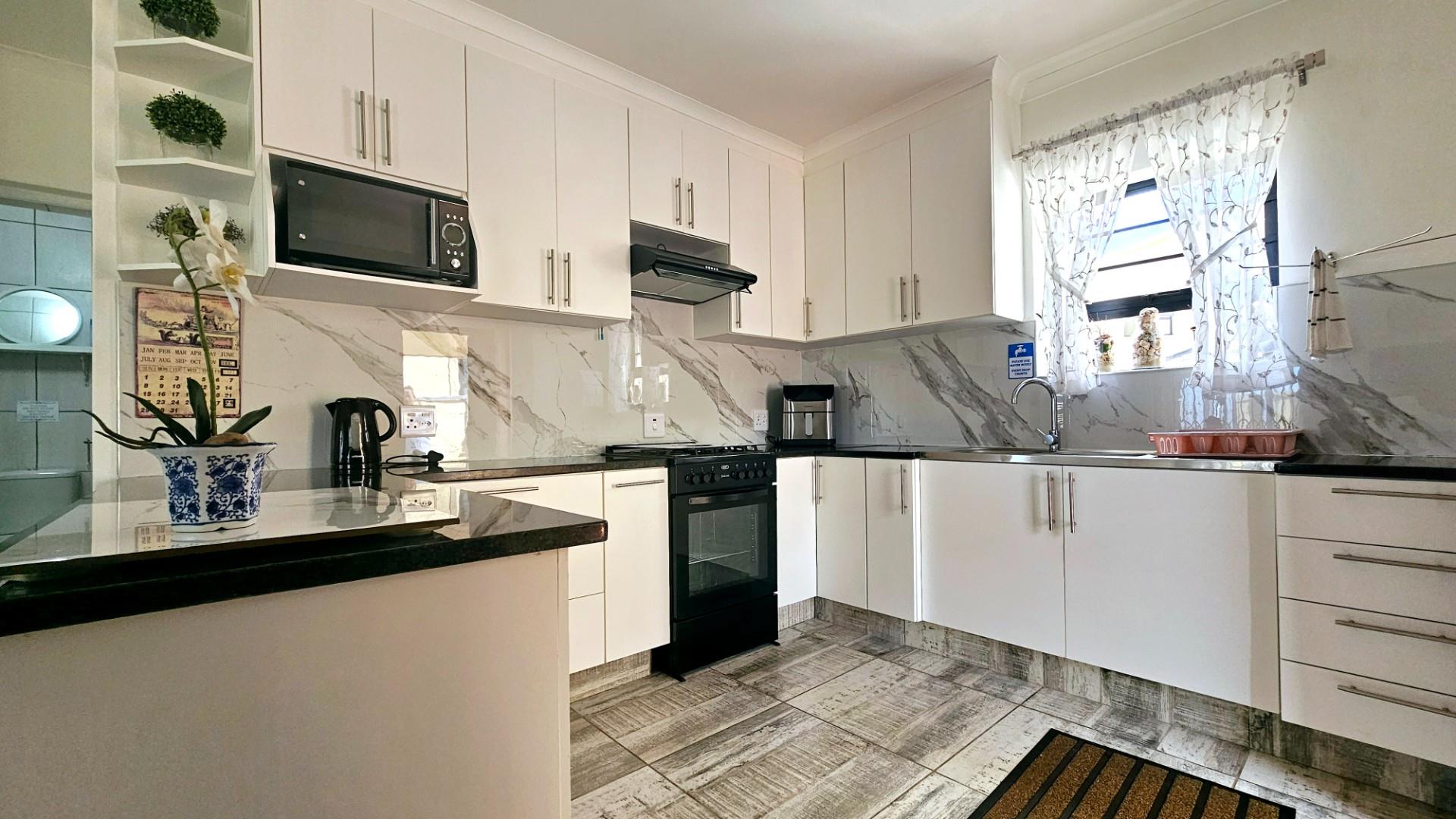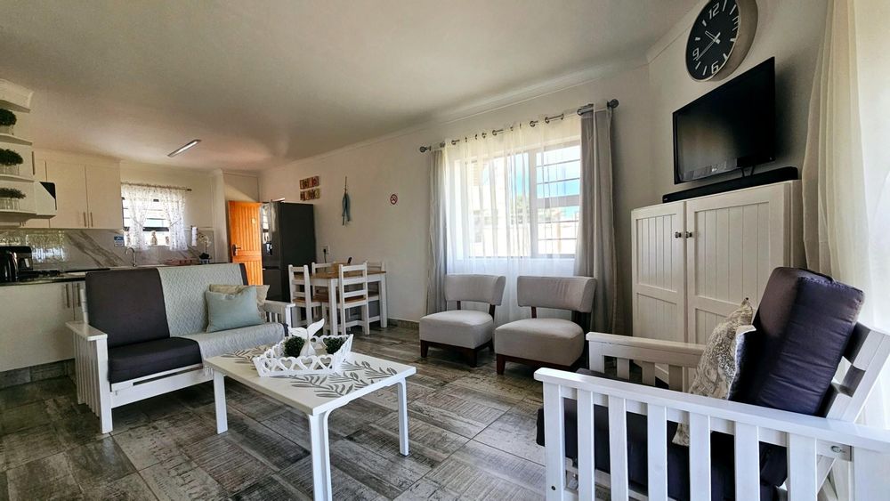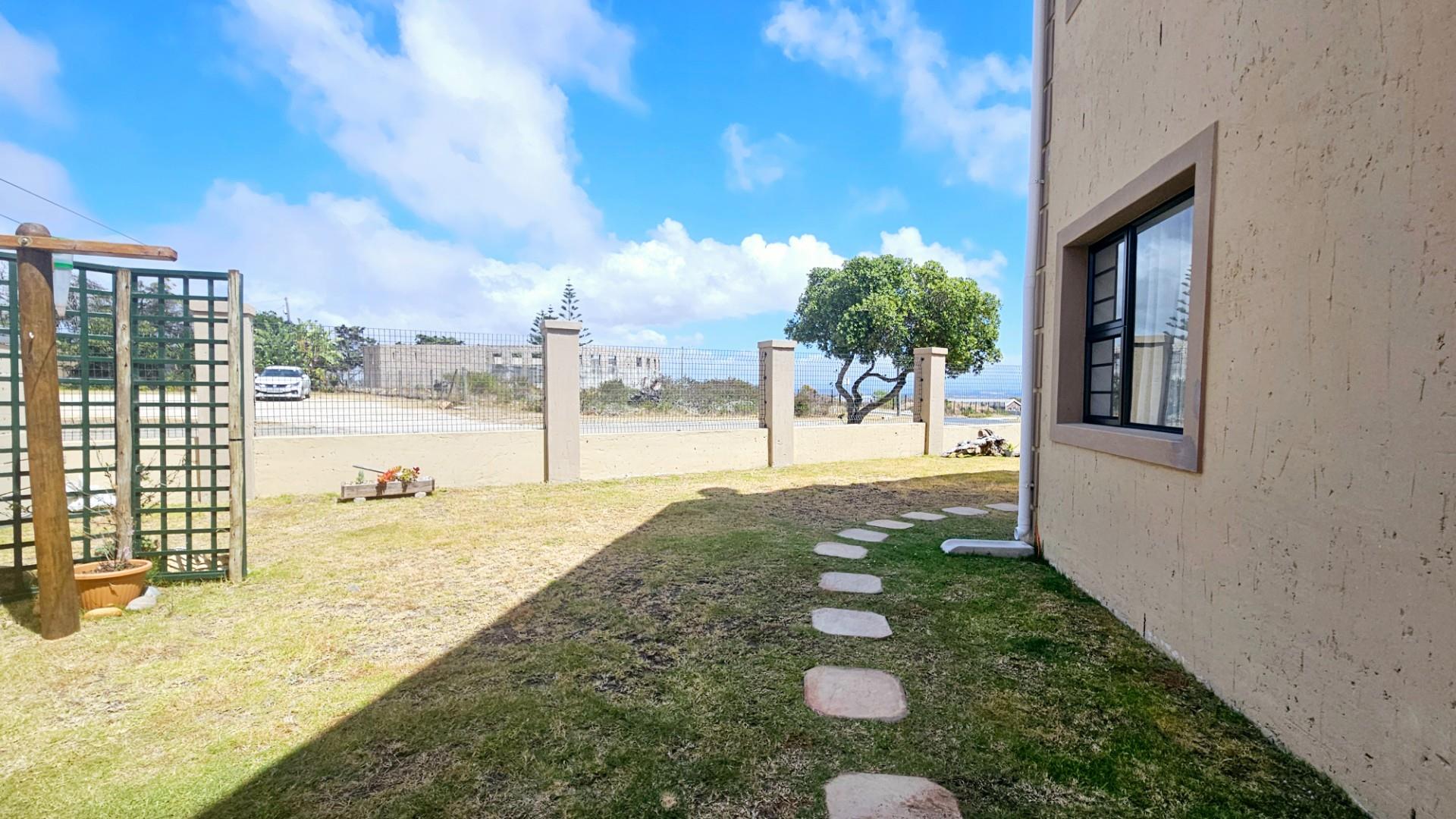 The home features three spacious bedrooms and two modern bathrooms, as well as a guest toilet conveniently located on the ground floor. The open-plan kitchen and living area create a warm and welcoming atmosphere, leading out to a covered patio with a built-in braai and a private, pet-friendly garden ideal for up to two small pets. Upstairs, a second covered patio is accessible from two of the bedrooms and offers lovely ocean views — the perfect setting to relax and enjoy Mossel Bay’s beautiful coastal climate.