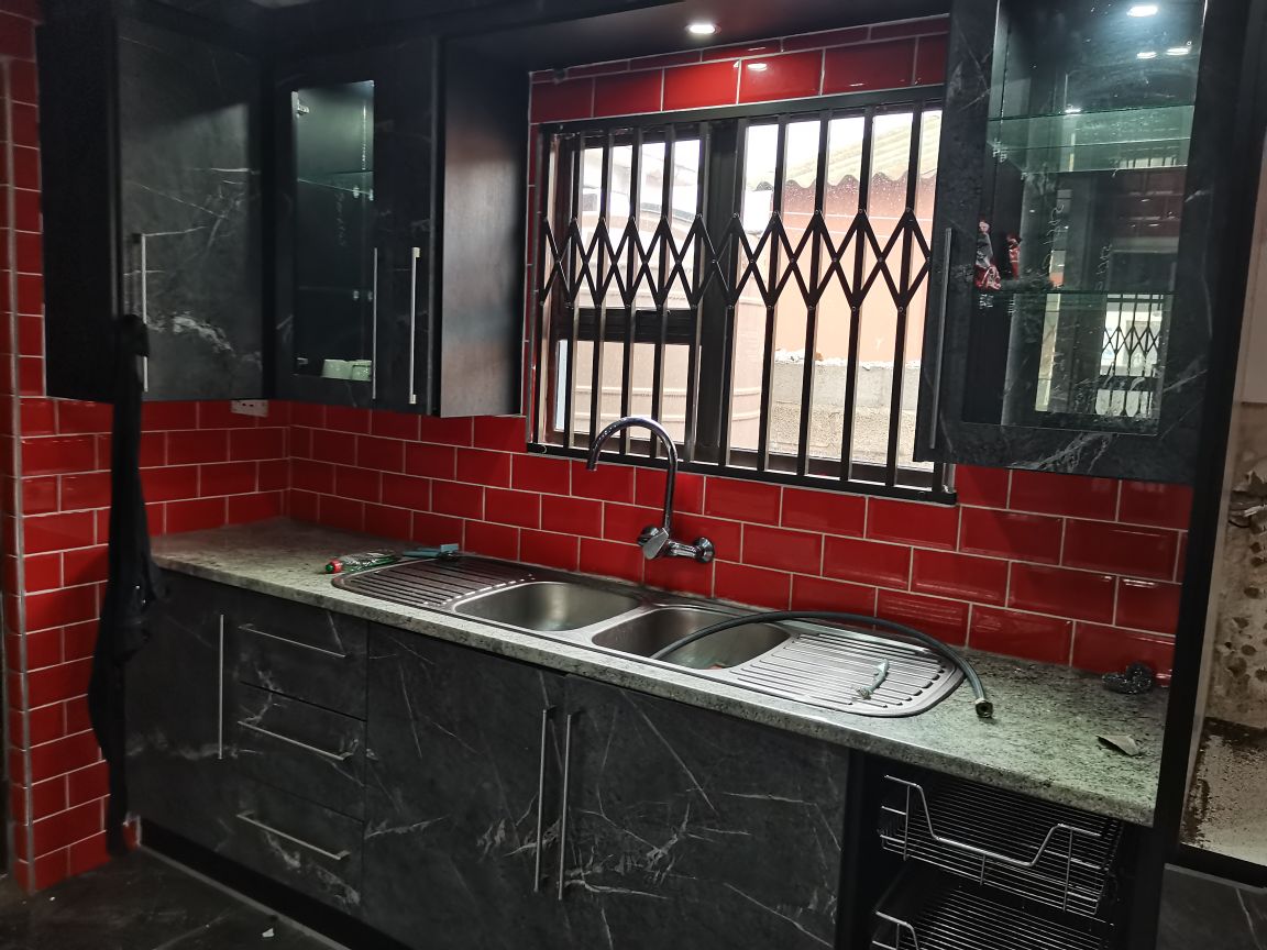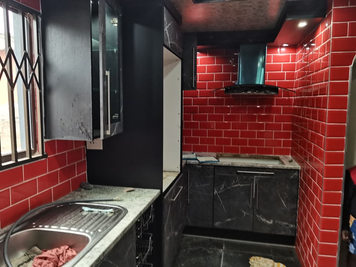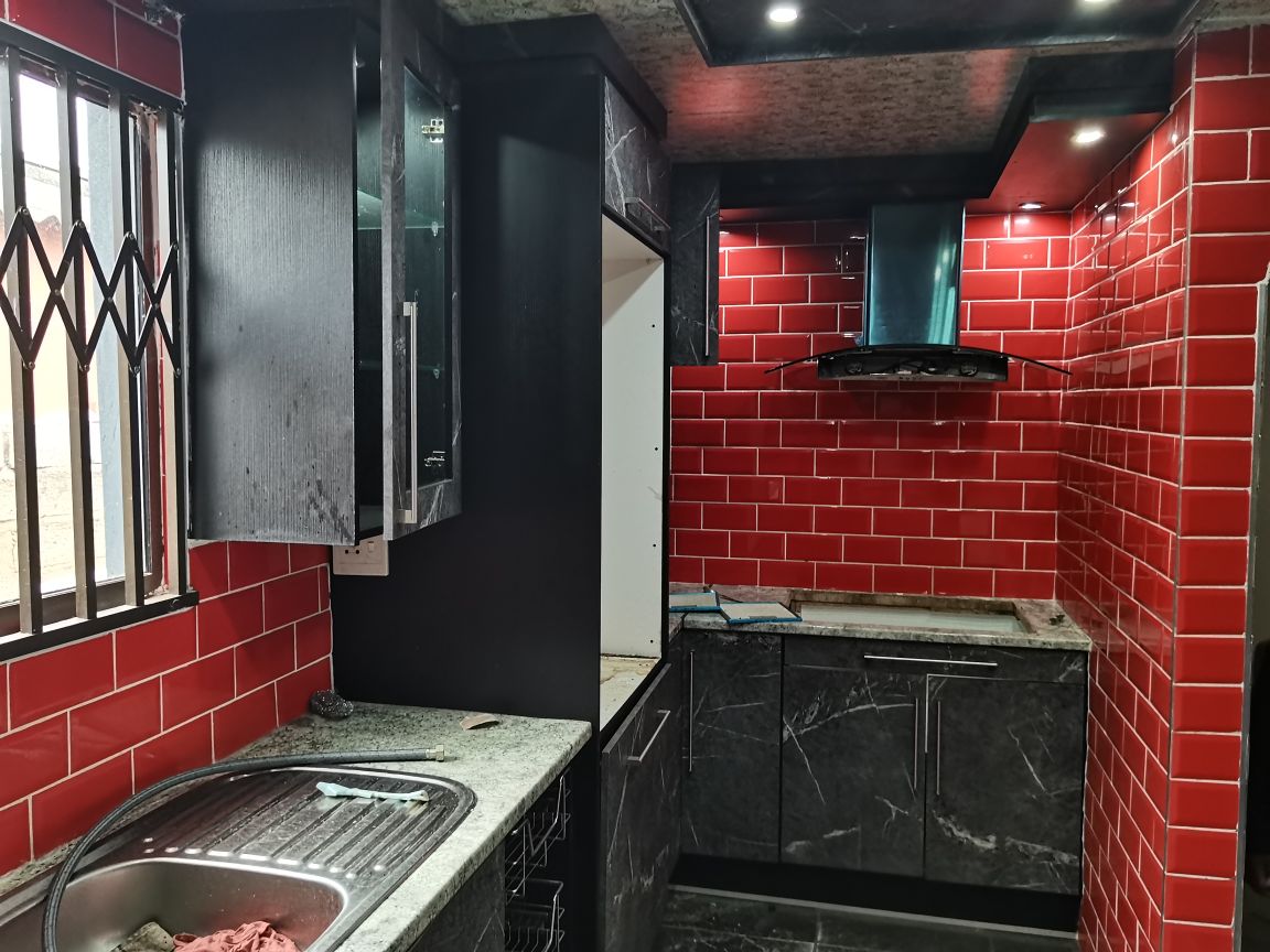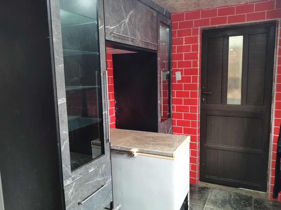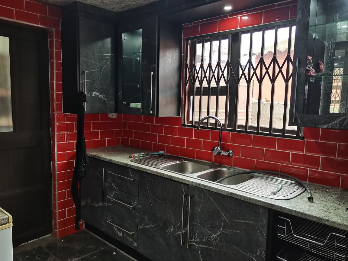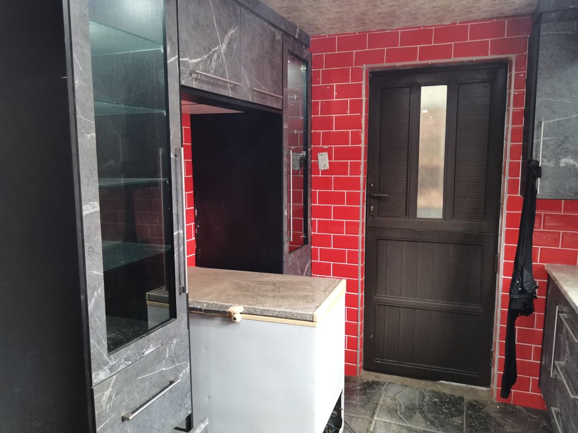 Kitchen with beautiful built-in cupboards, aluminum door and windows with burglar bars and walls are tiled.