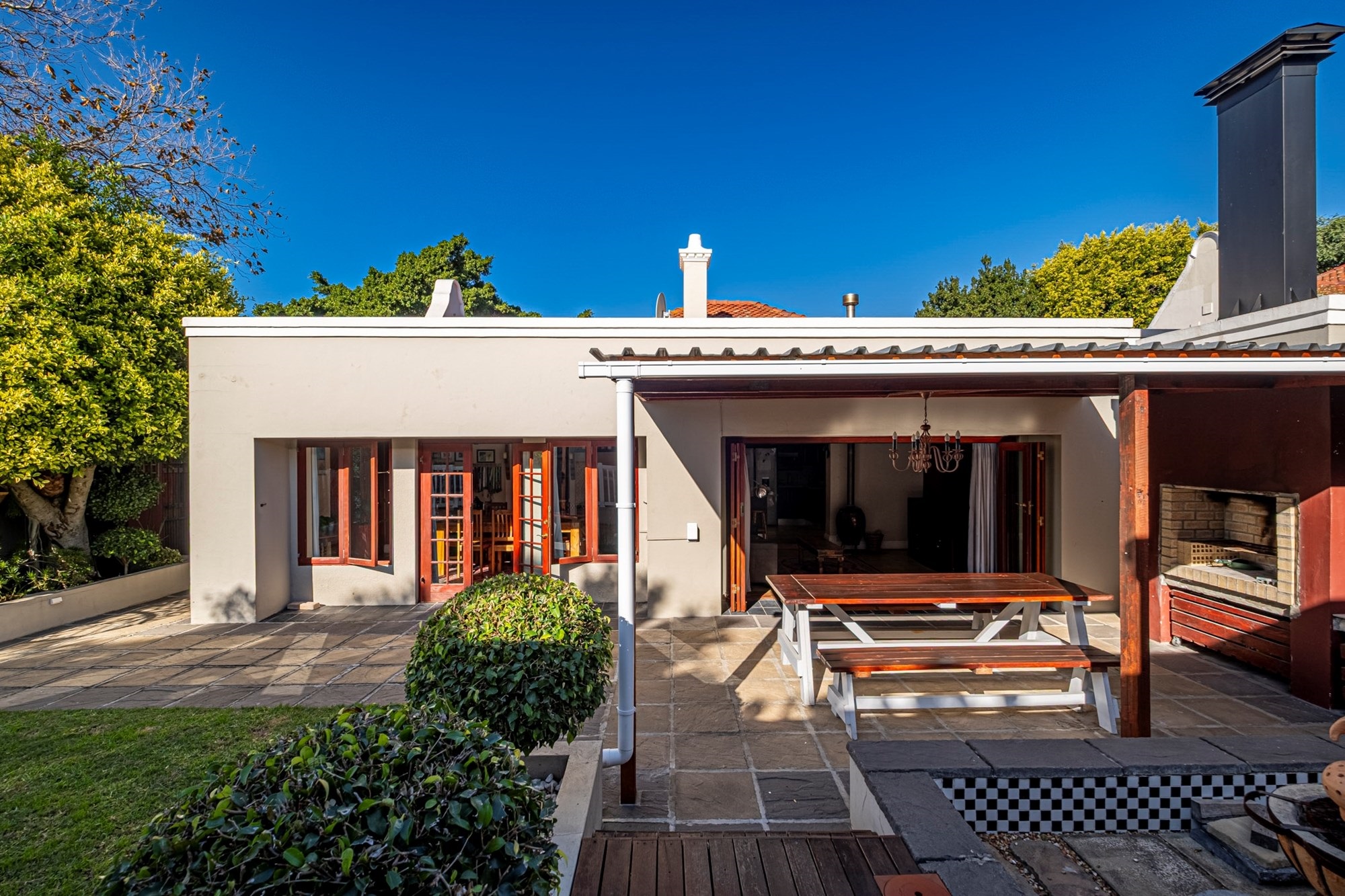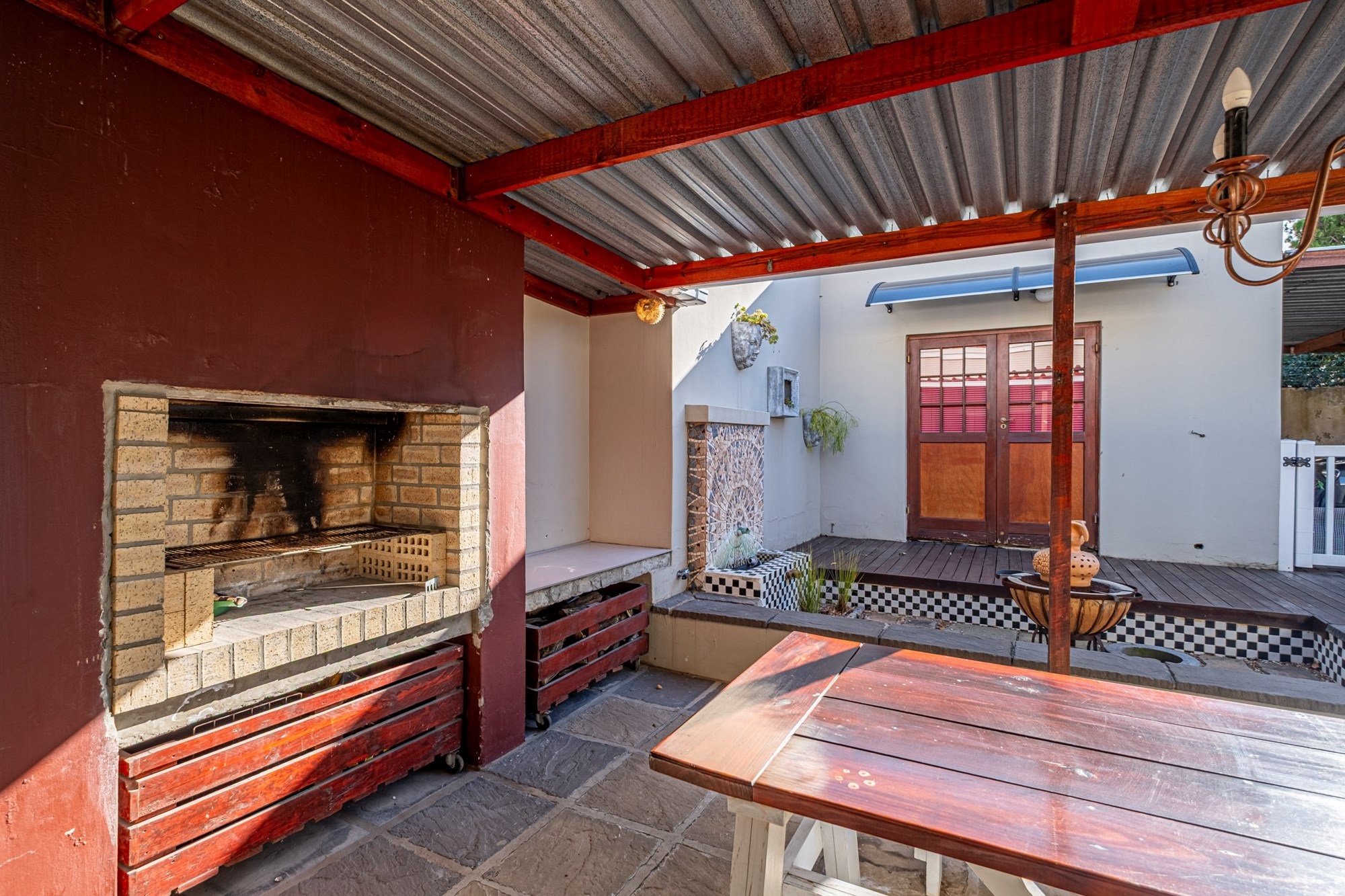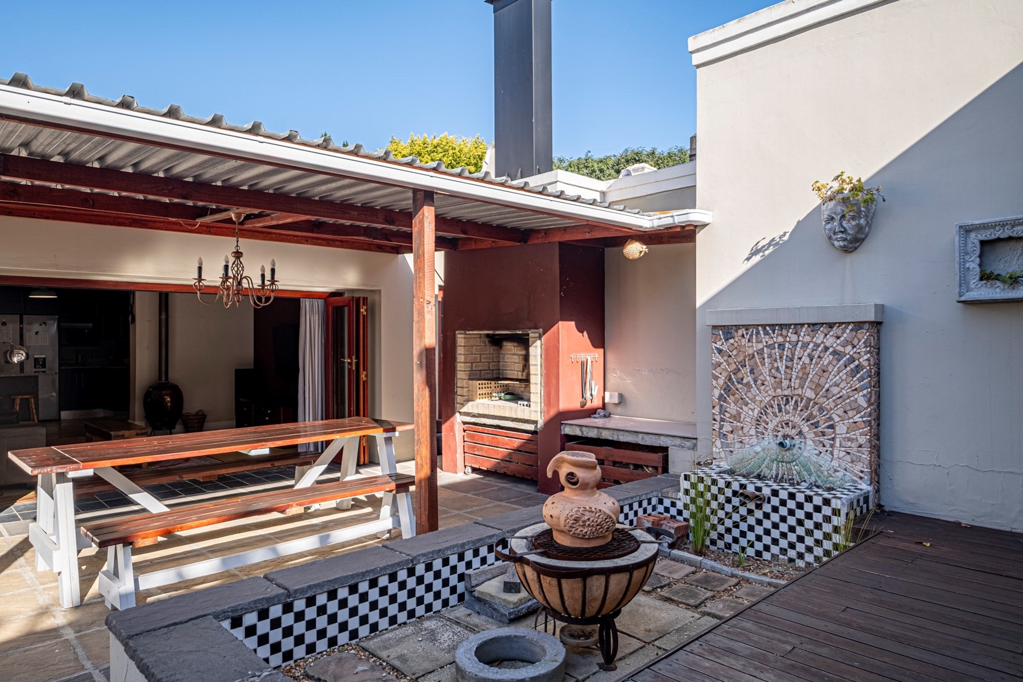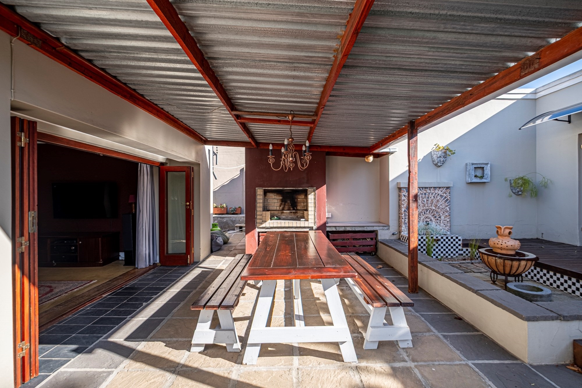 Outdoor Entertainment: The covered patio, complete with a built-in braai, offers an ideal setting for year-round outdoor gatherings.