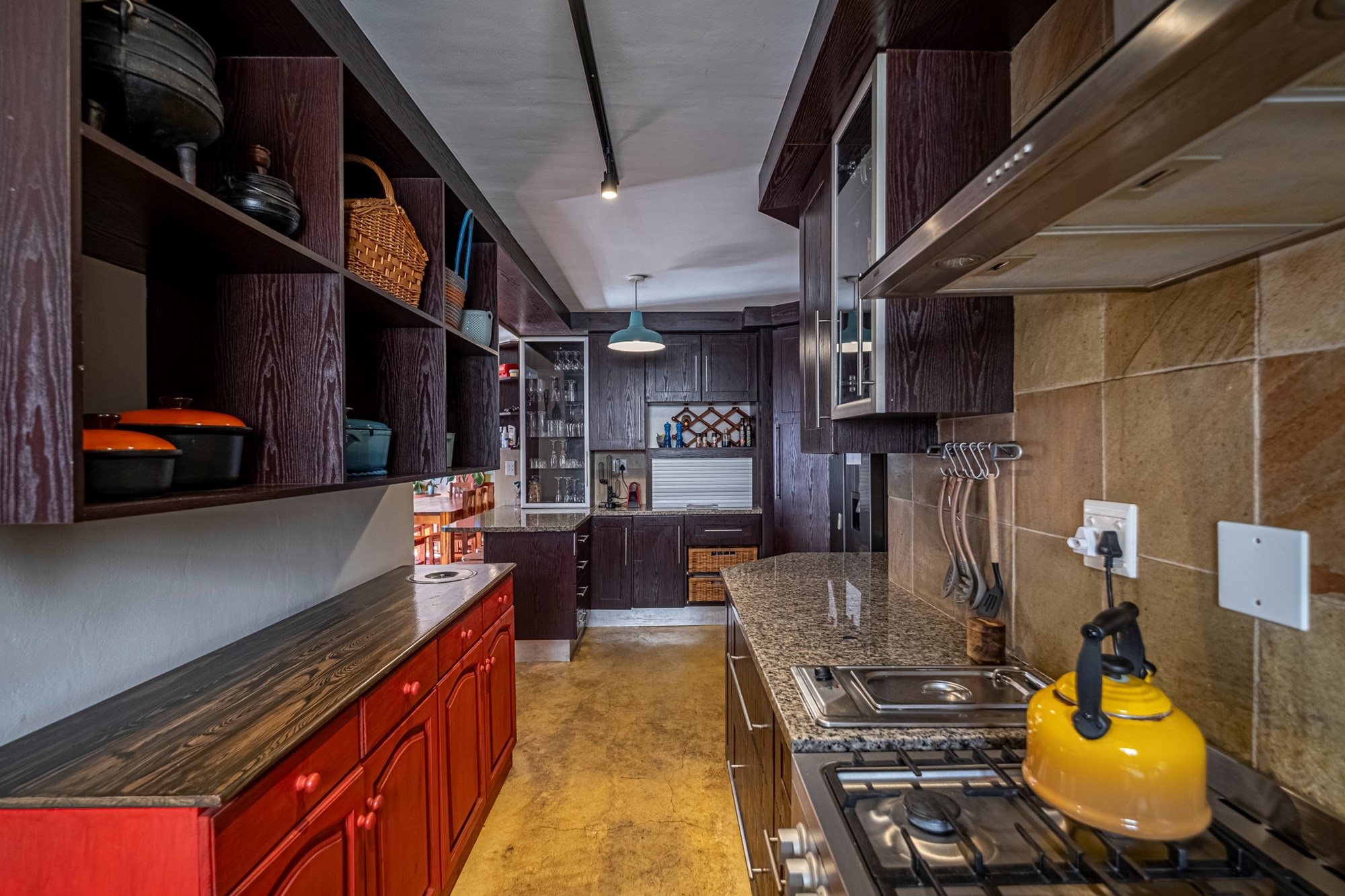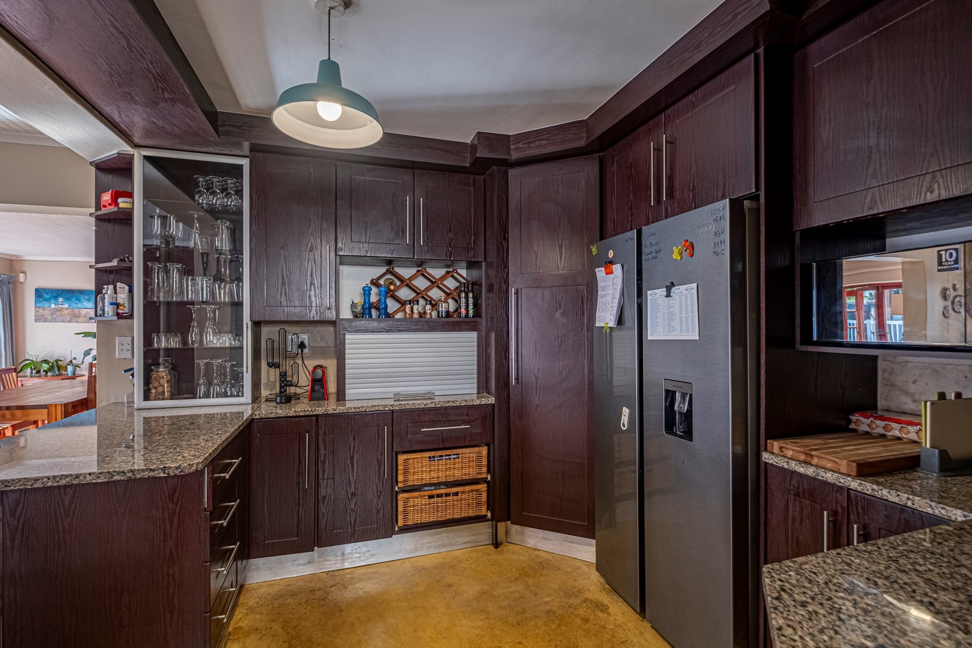 Dining & Kitchen: A dining room leads into a well-appointed kitchen boasting granite countertops, a gas stove, and a separate scullery, catering to culinary enthusiasts.