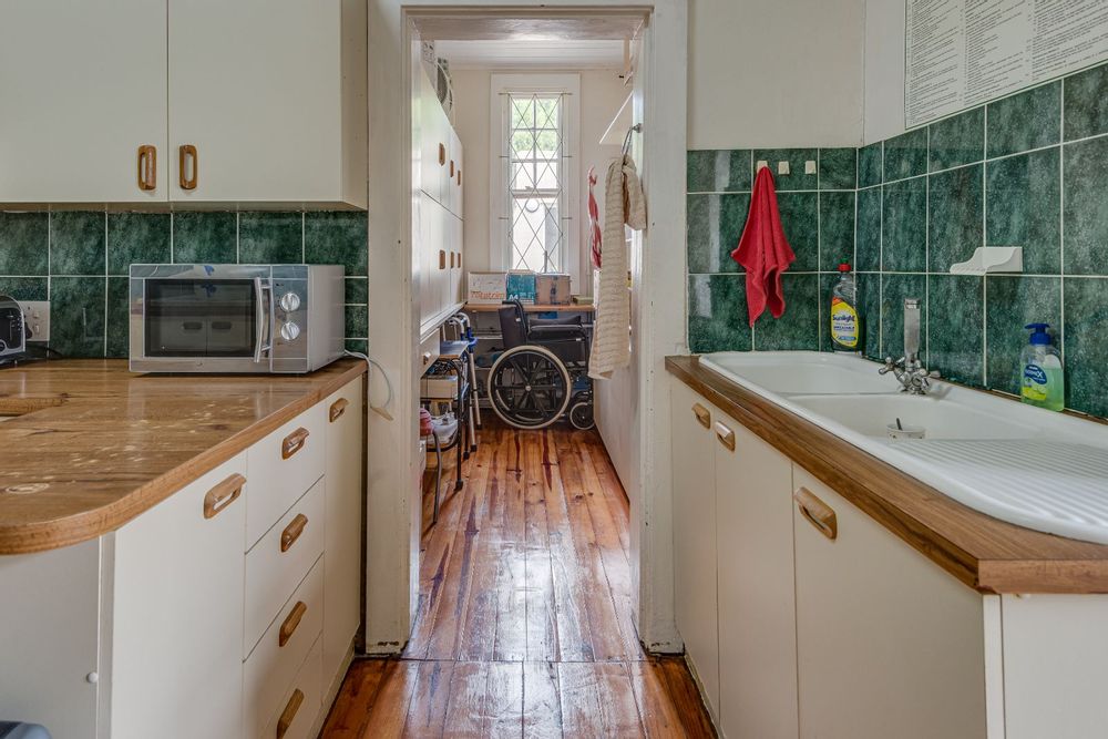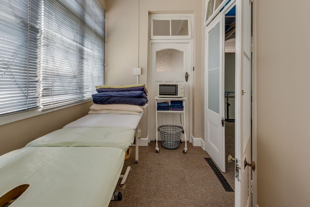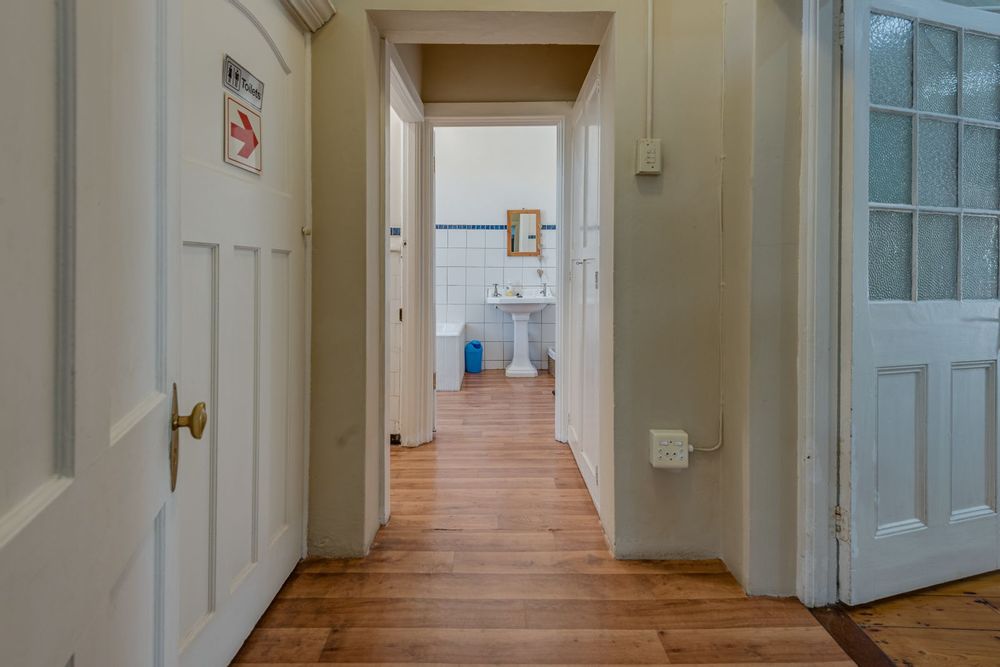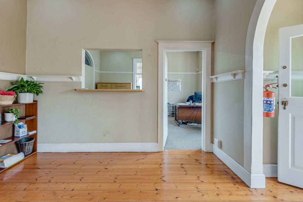 Step inside and you’ll find original wooden floors throughout and a spacious, light-filled entrance hall. The front room, with its striking bay window, makes for an inviting reception area. To the left are three generously sized rooms, currently used as consulting rooms, and to the right, a very large room – once the open-plan lounge and dining space – now serves as a gym.