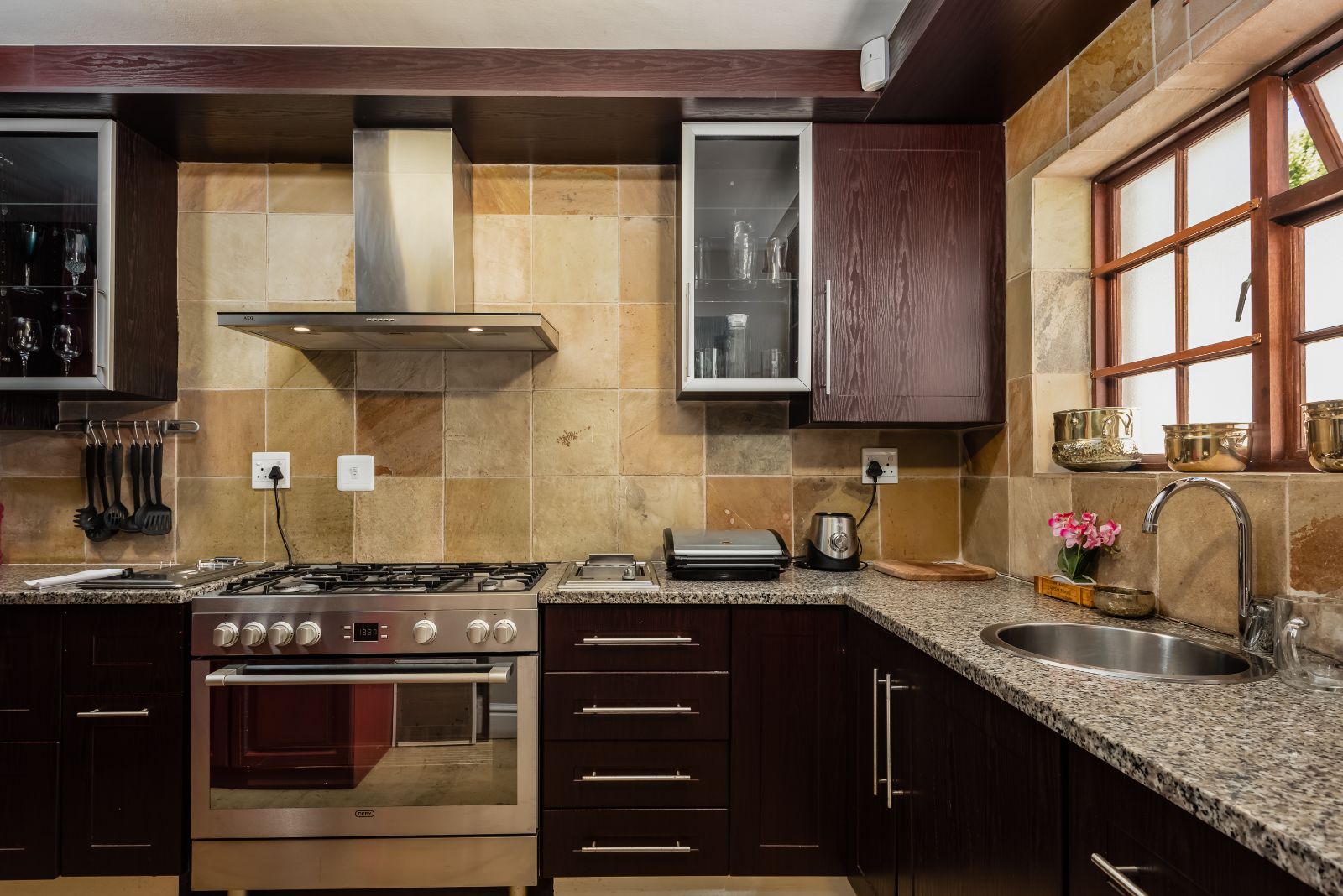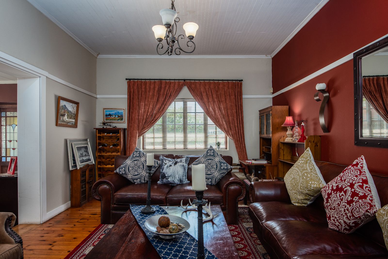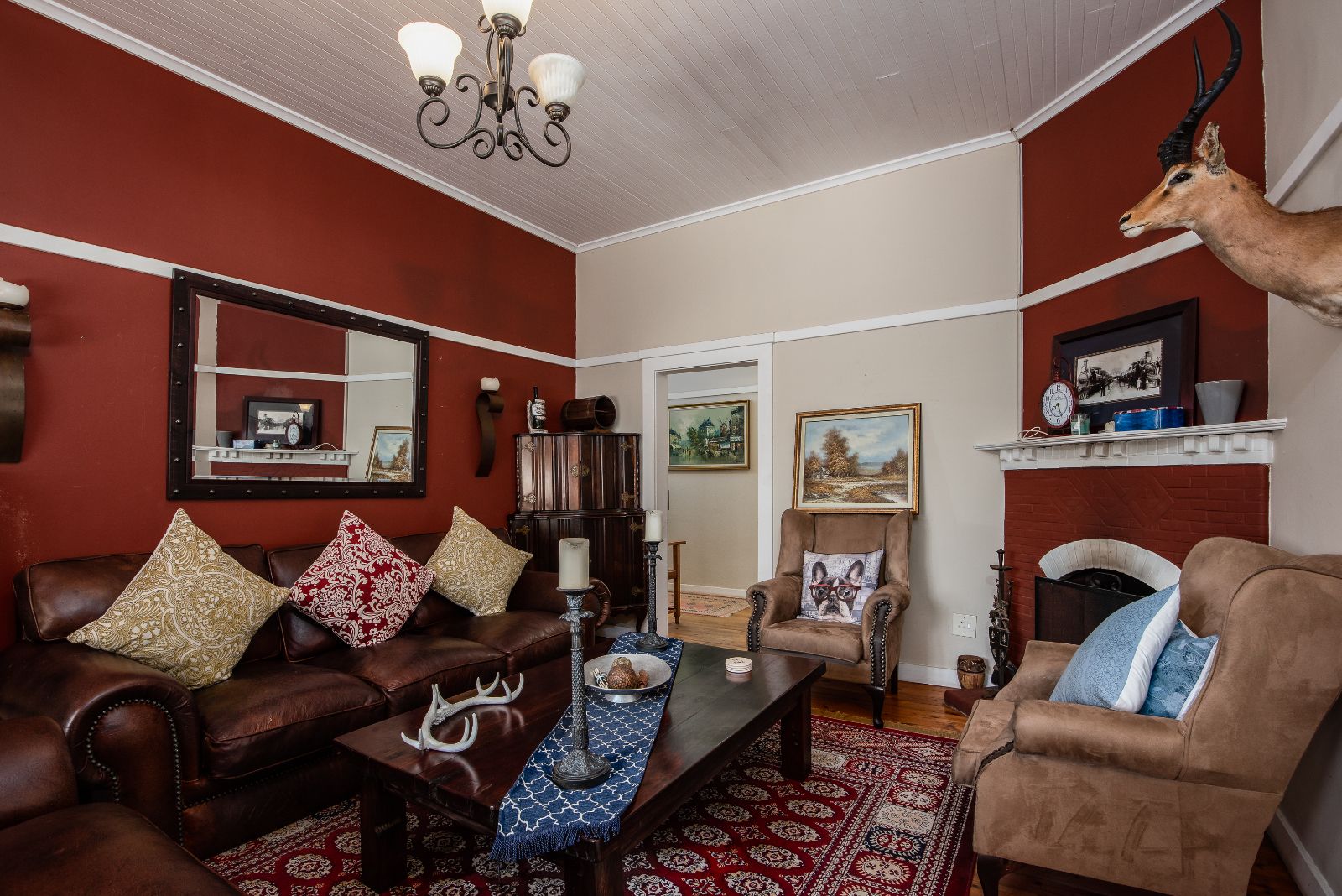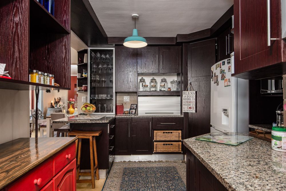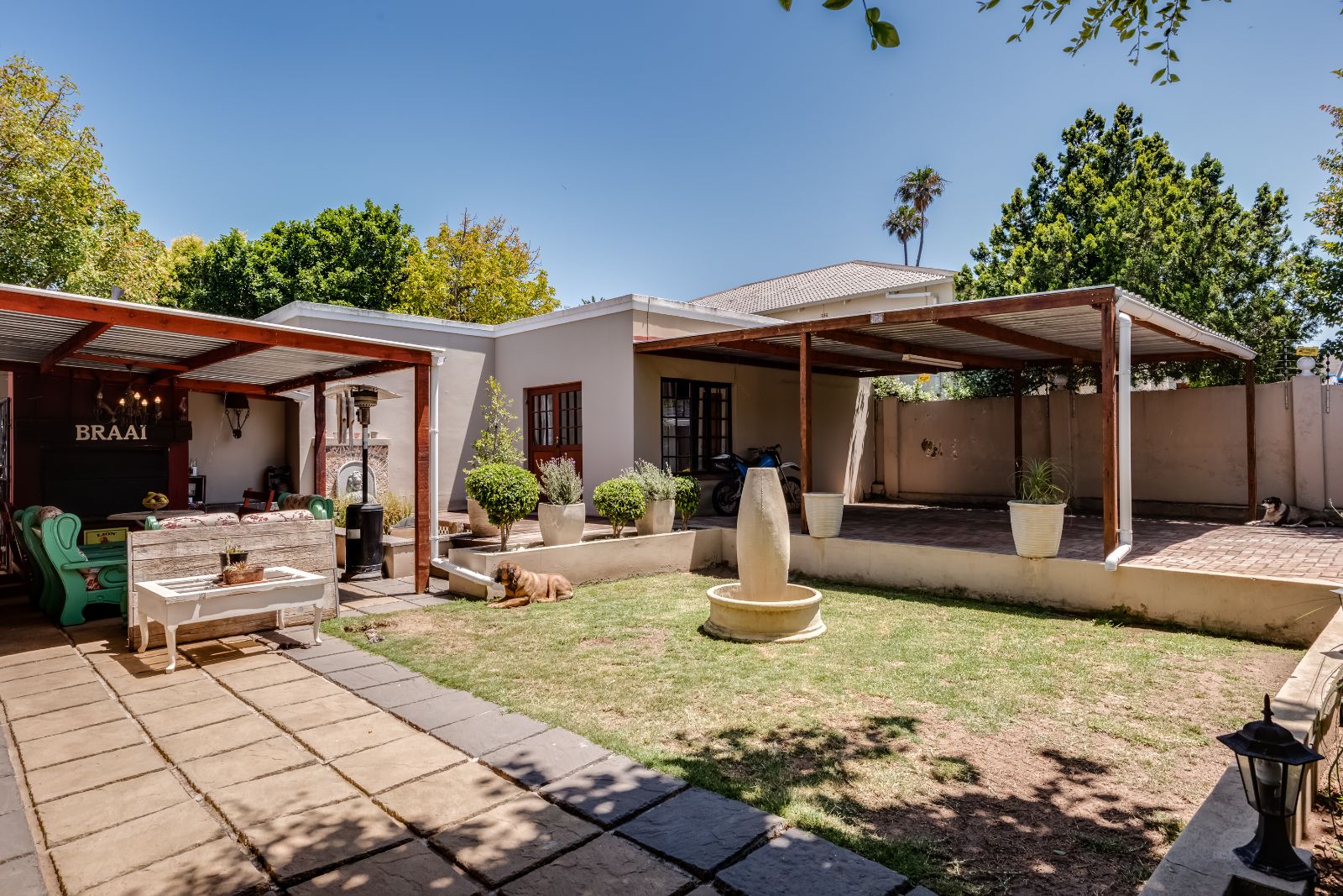 The gourmet kitchen boasts granite tops, a gas stove, separate built-in griller and deep fryer, plus a scullery and laundry for convenience. Perfect for entertaining, the dining room opens through French doors onto a covered patio with built-in braai, while the lounge and TV room each have working fireplaces for cosy evenings.