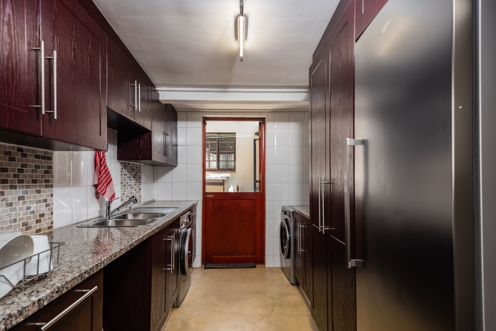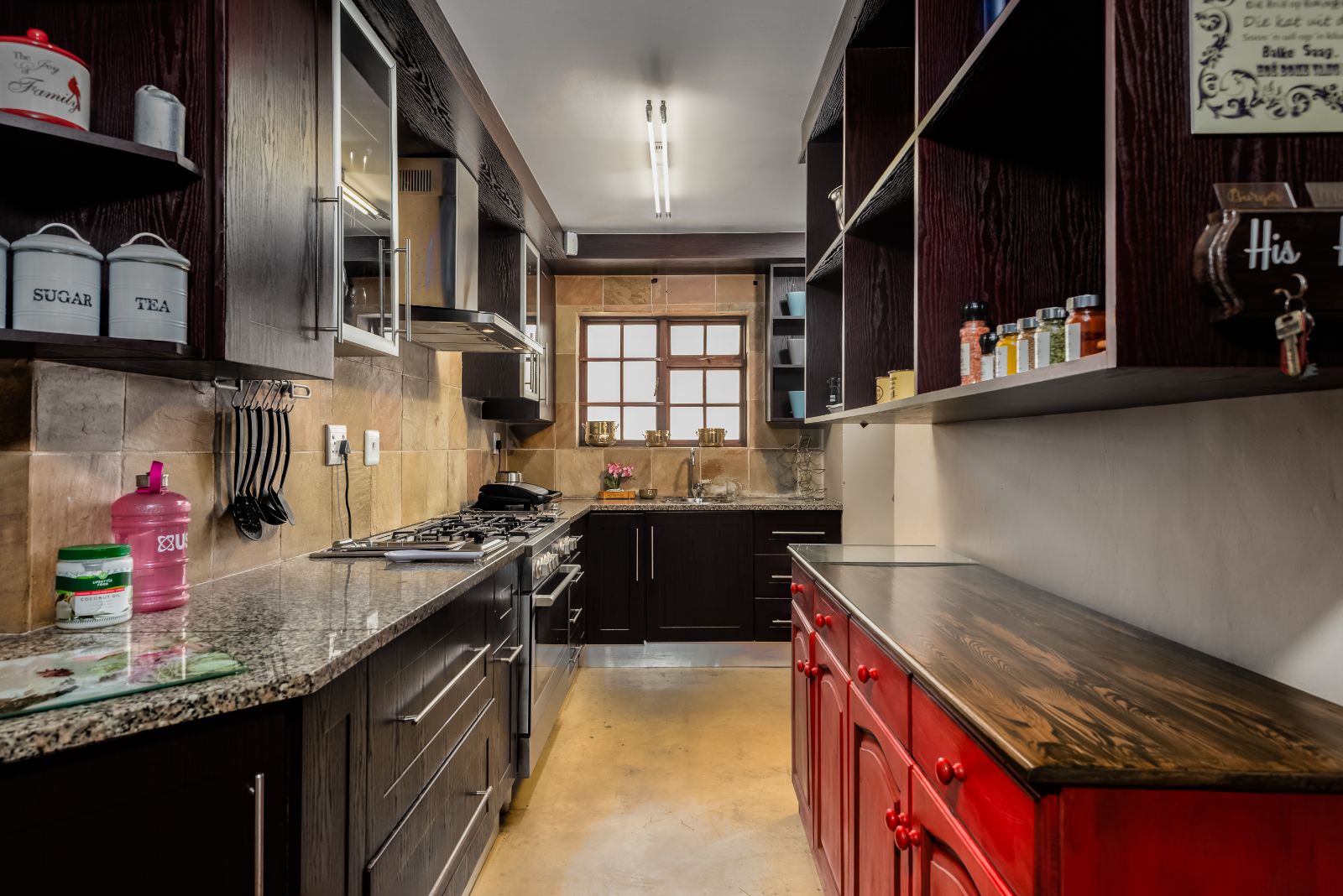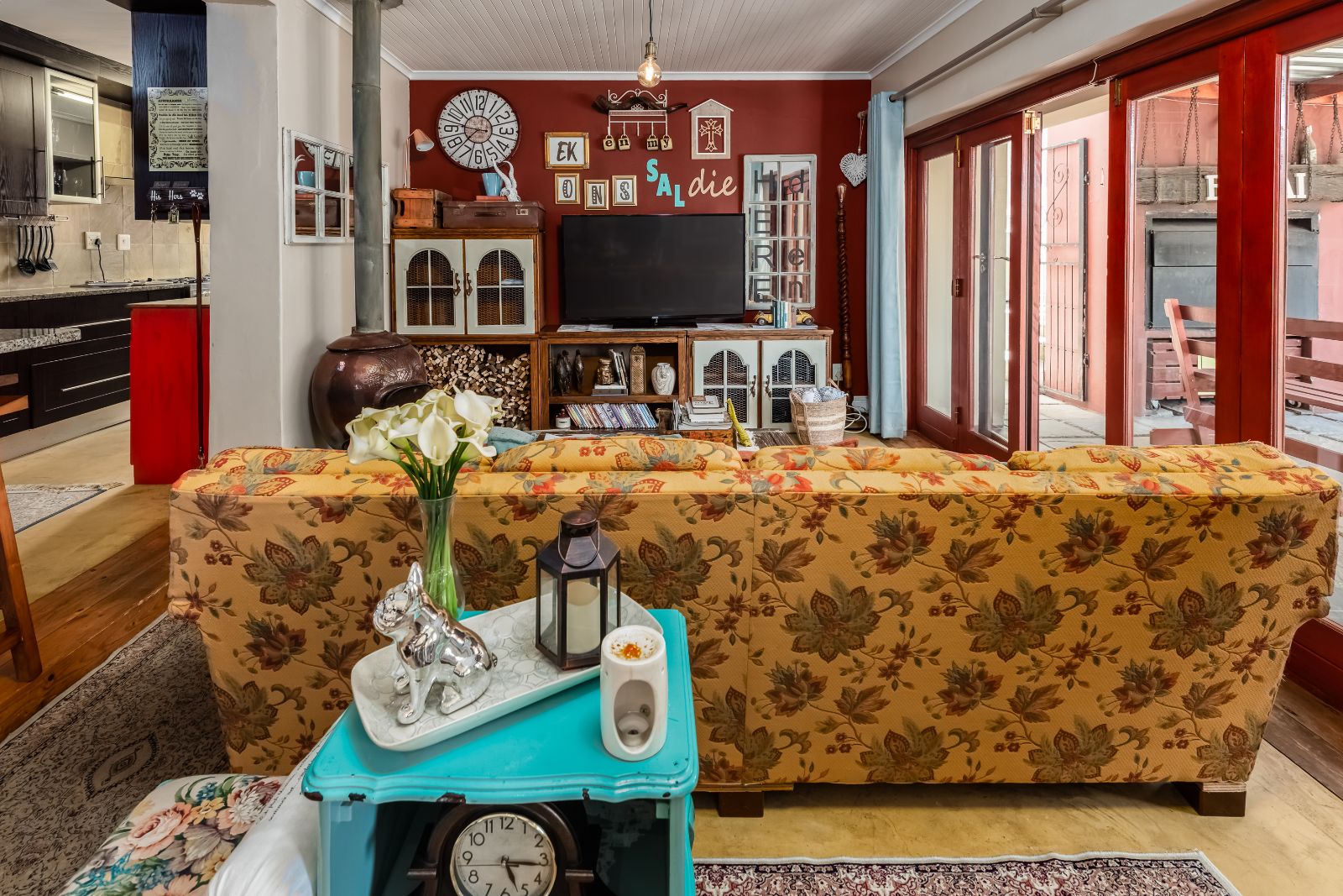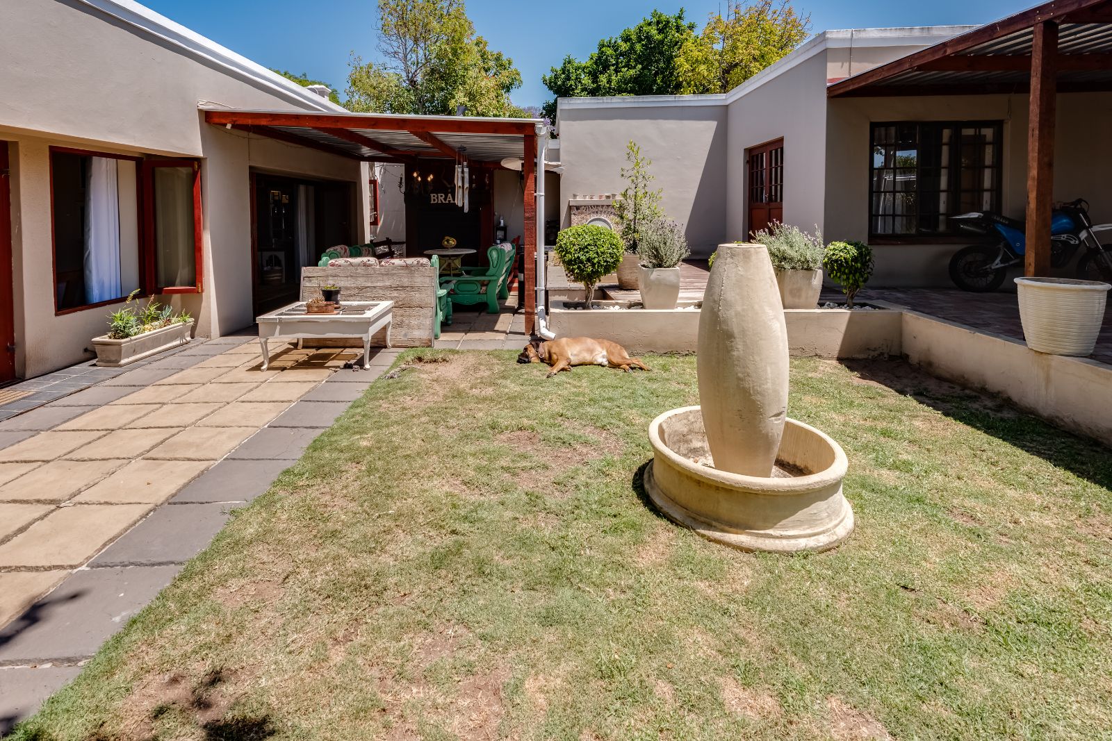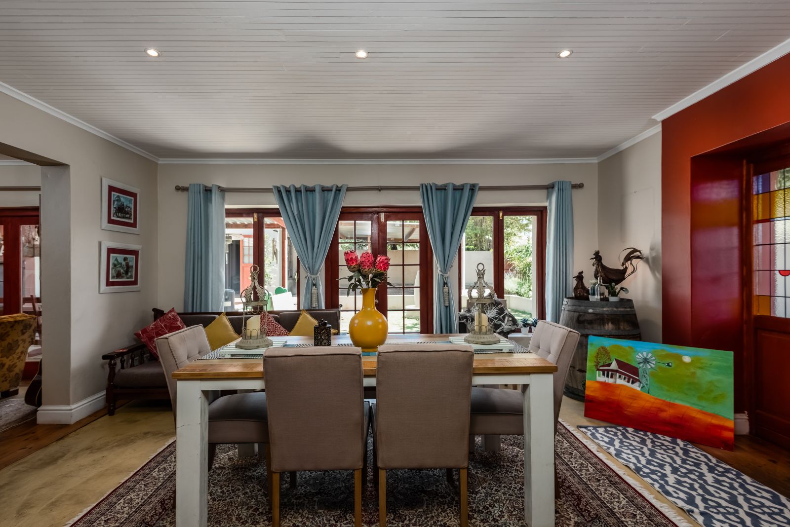 The gourmet kitchen boasts granite tops, a gas stove, separate built-in griller and deep fryer, plus a scullery and laundry for convenience. Perfect for entertaining, the dining room opens through French doors onto a covered patio with built-in braai, while the lounge and TV room each have working fireplaces for cosy evenings.