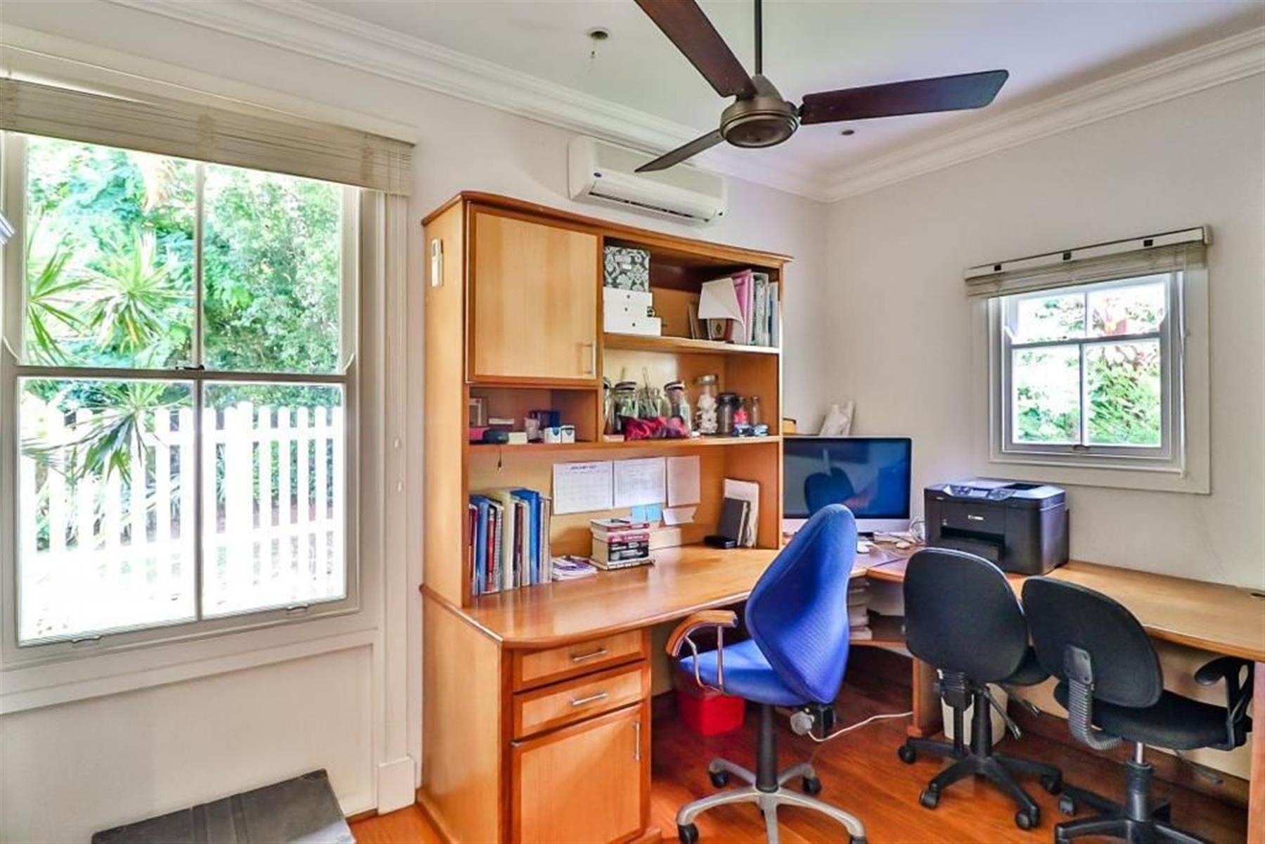 Two additional bedrooms are located downstairs, sharing a stylish bathroom, and a built-in study provides the perfect space for work or study.