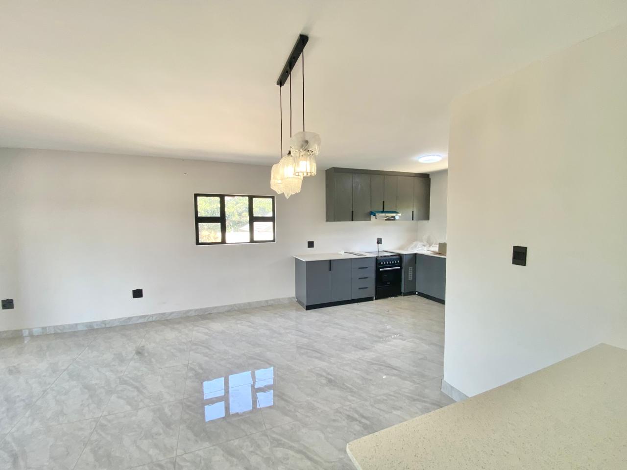 The apartment features two spacious bedrooms with fully fitted built-in cupboards and curtains throughout. The main bedroom includes an en-suite bathroom, complemented by a modern communal bathroom. The open-plan living space flows into a stylish kitchen fitted with a gas stove, solar geyser, and quality finishes—perfect for comfortable, contemporary living.