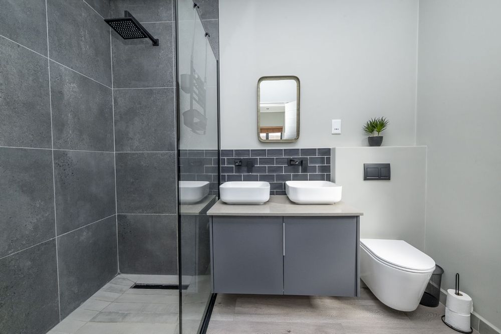 *Main bedroom: Vinyl flooring, walk-in closet, en-suite with walk-in shower, double vanity, floating shelves, and tiled to the roof – opens to a large private balcony