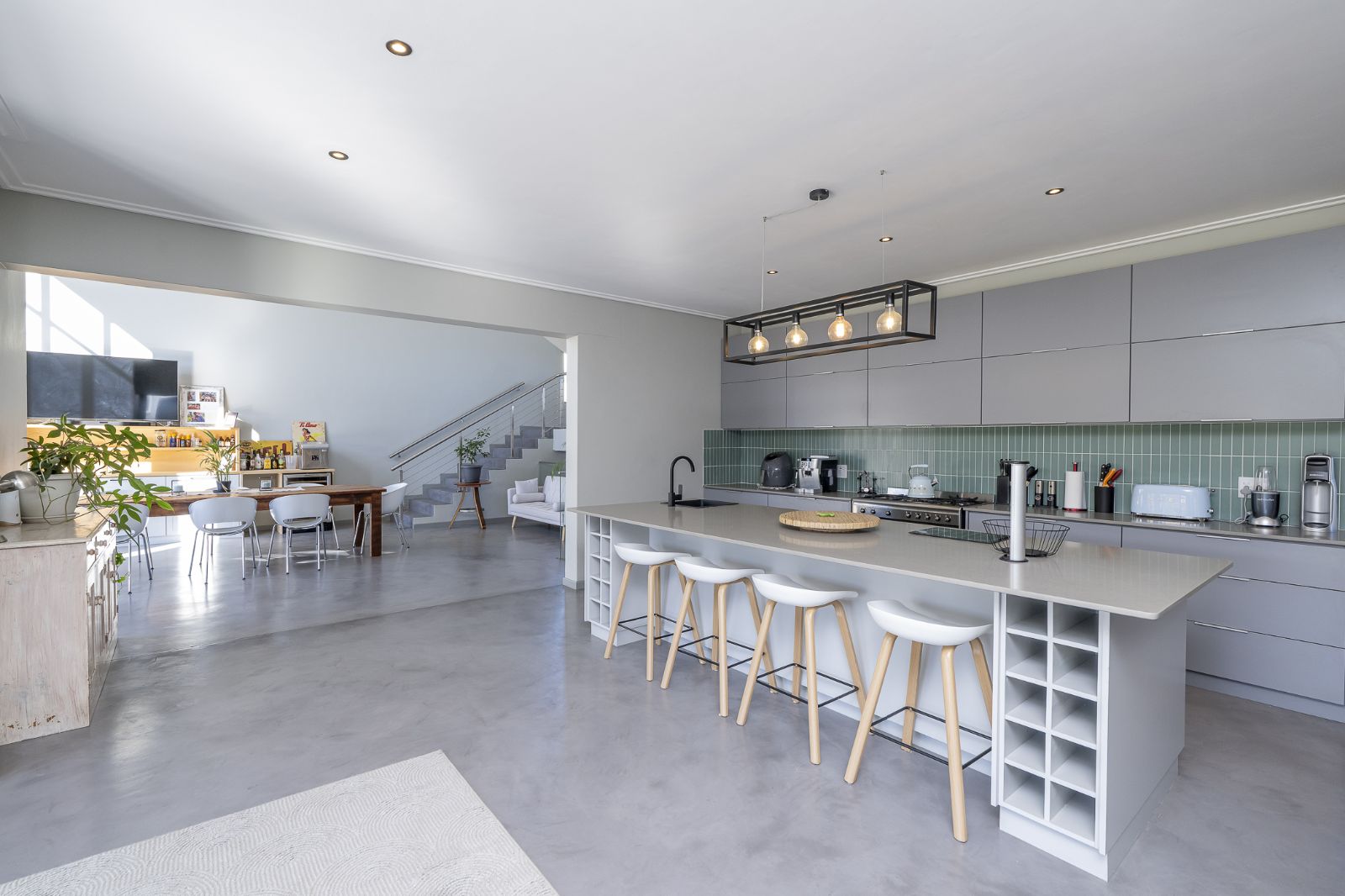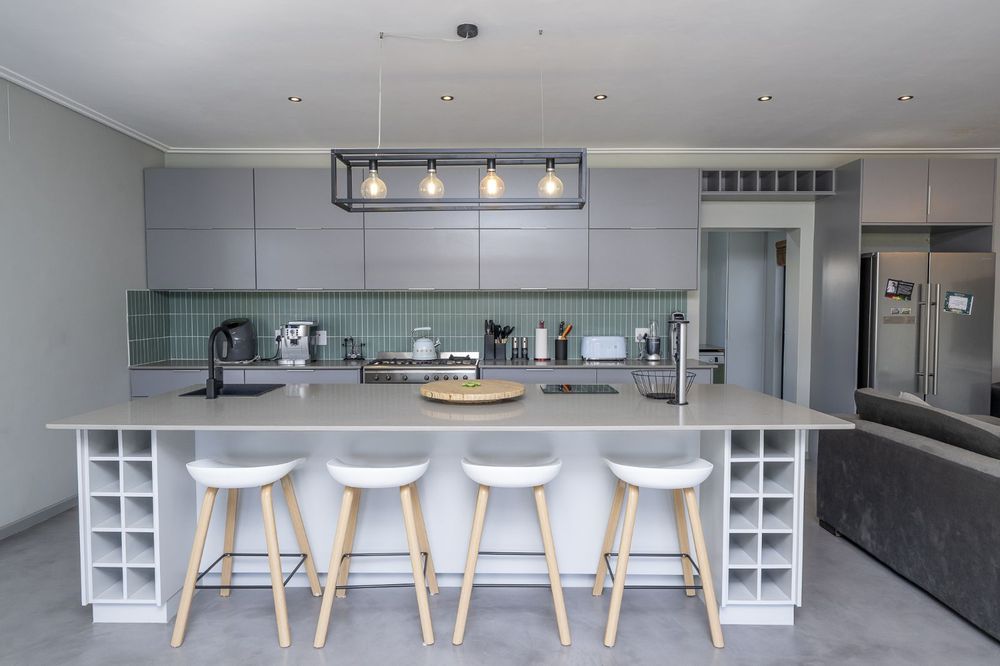 *Modern open-plan kitchen with alpha Quartz countertops, island with basin and breakfast nook, built-in wine racks, and soft-close cabinetry