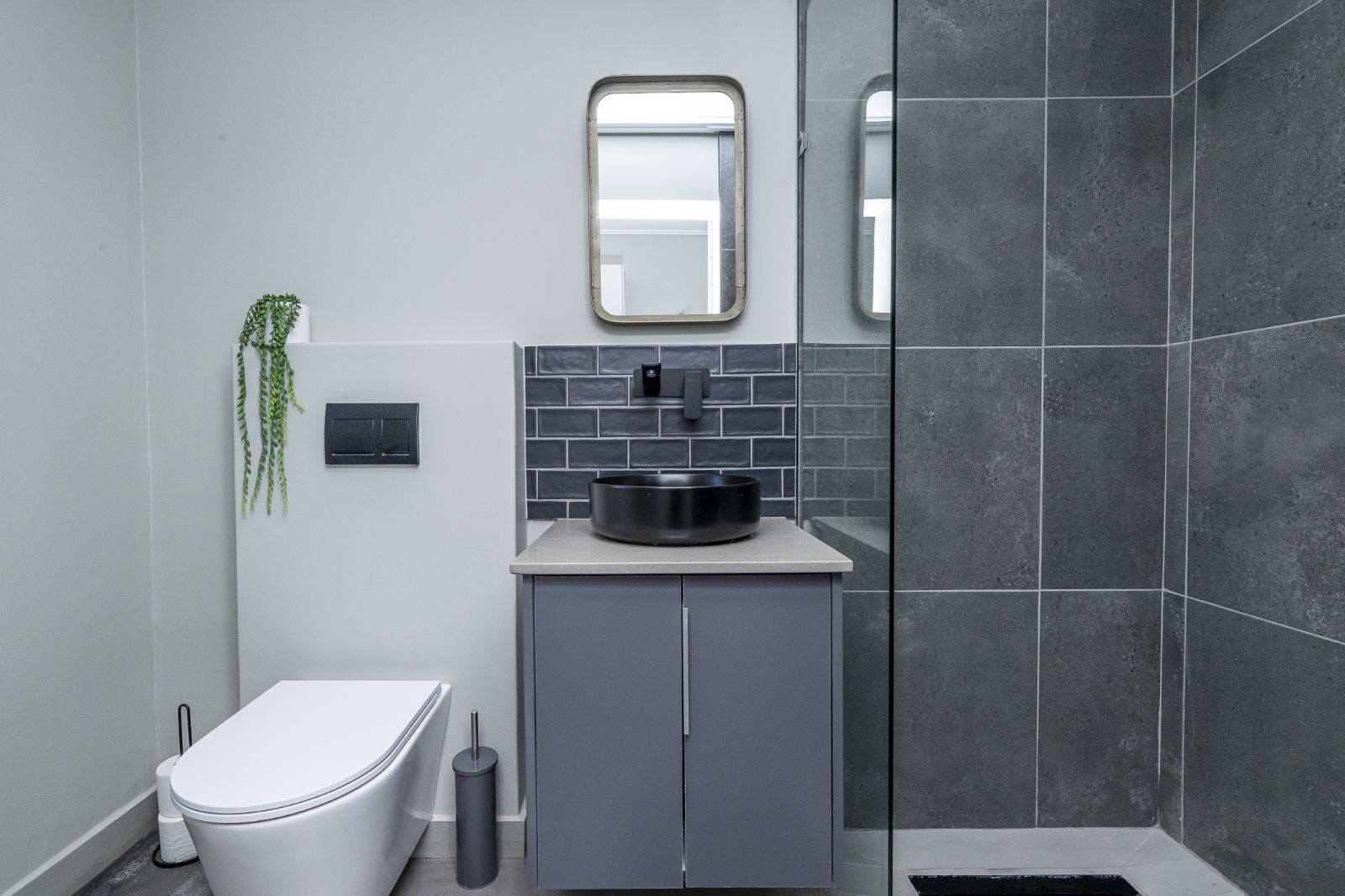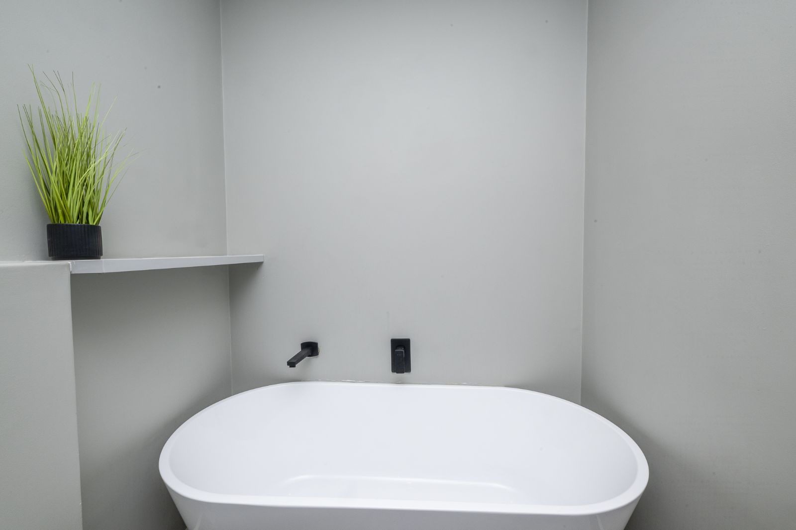 *Family bathroom: Features an elegant oval bath, shower, toilet, and basin – vinyl flooring and shower tiled to roof