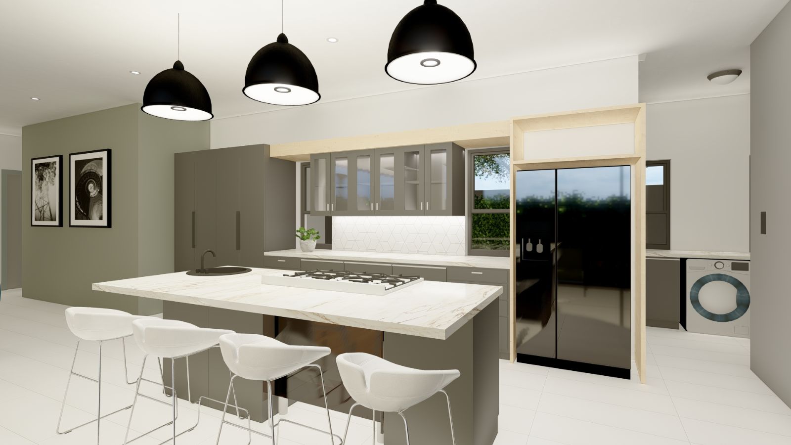 Kitchen with breakfast nook, gas hob, extractor fan, scullery, and dedicated plumbing for washing machine and dishwasher