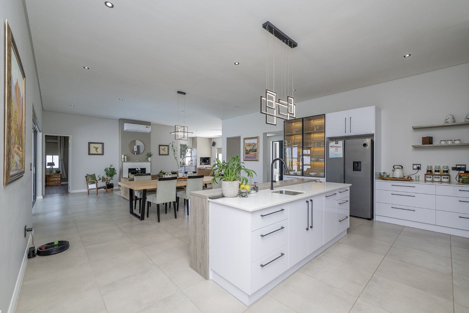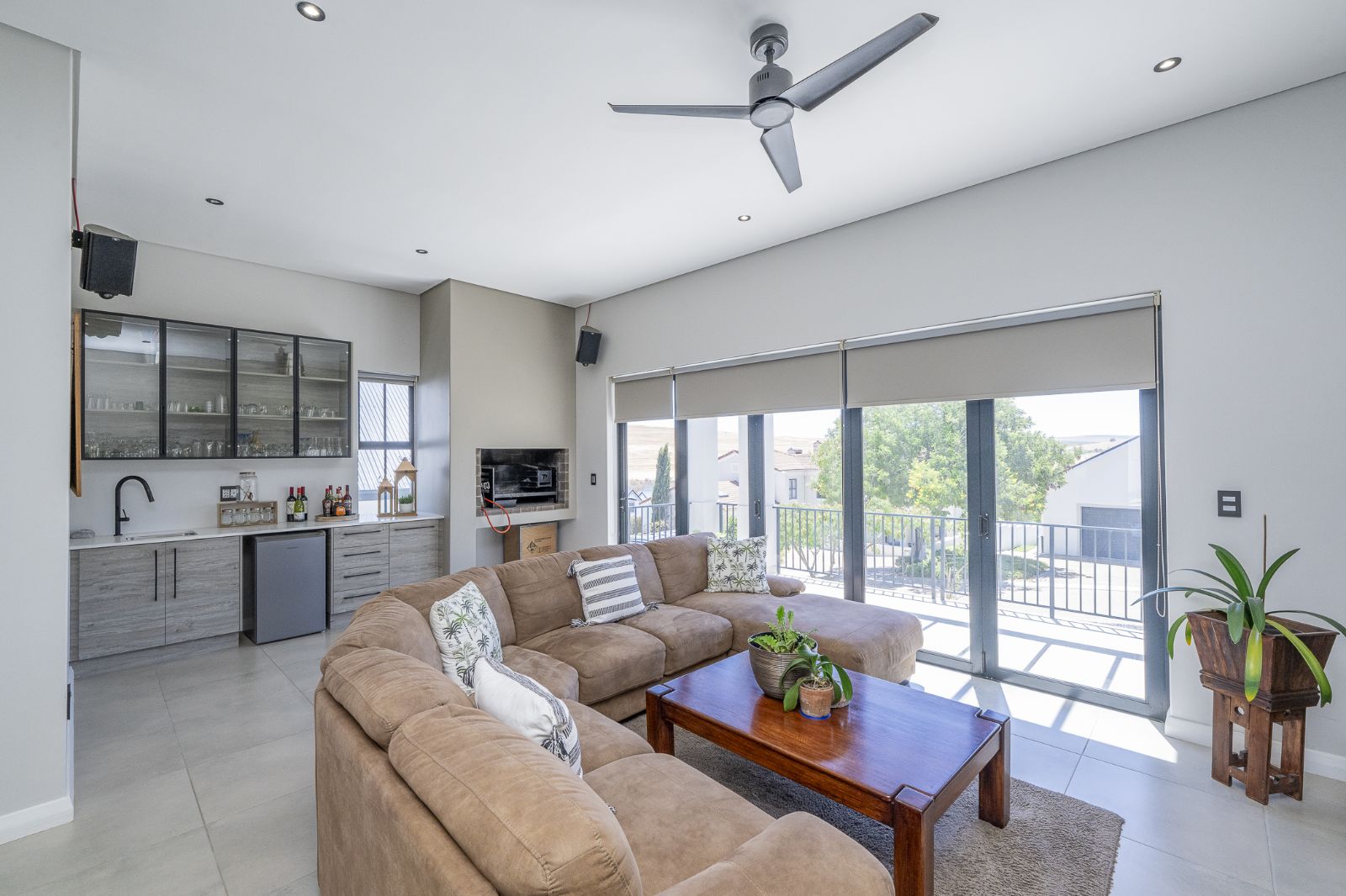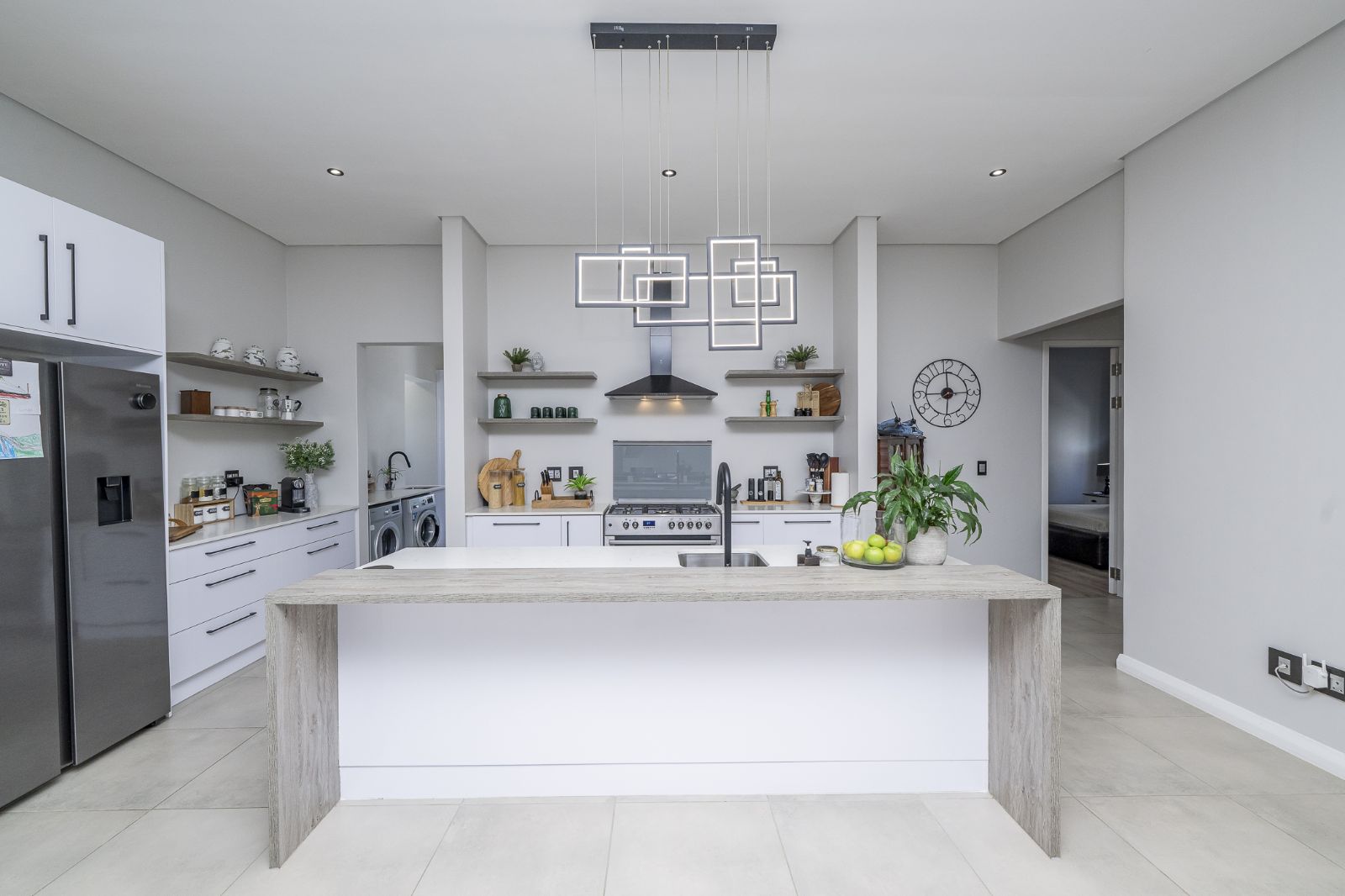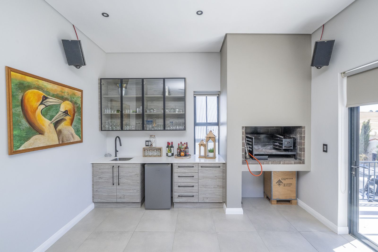 Perfect for entertaining, the home offers an extra-deep built-in braai area with cupboards for glassware and space for a fridge, opening via sliding doors onto a large patio overlooking the swimming pool. The paved outdoor area with planter boxes provides space to add an additional outside braai, all surrounded by a low-maintenance garden
