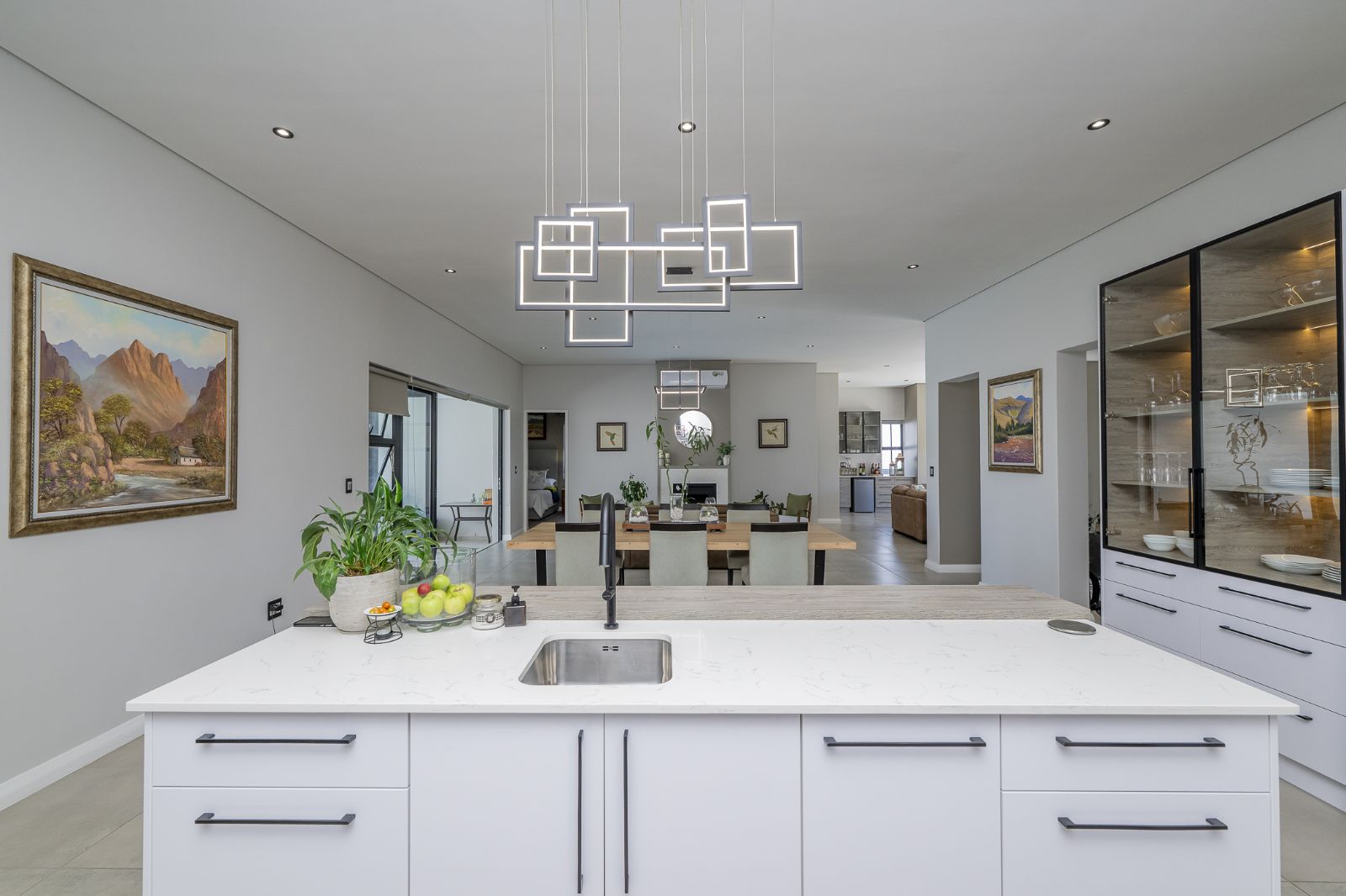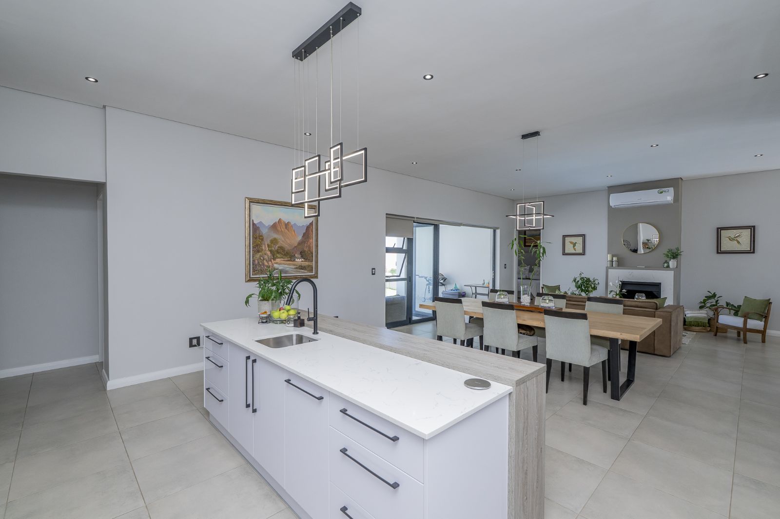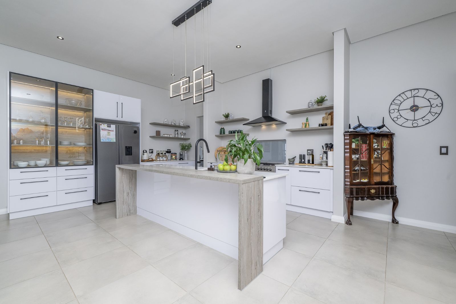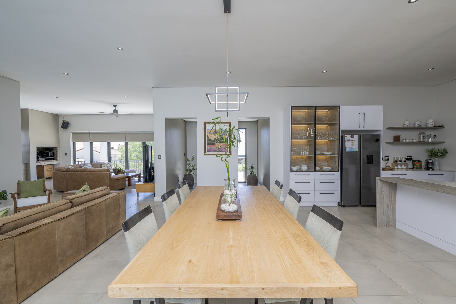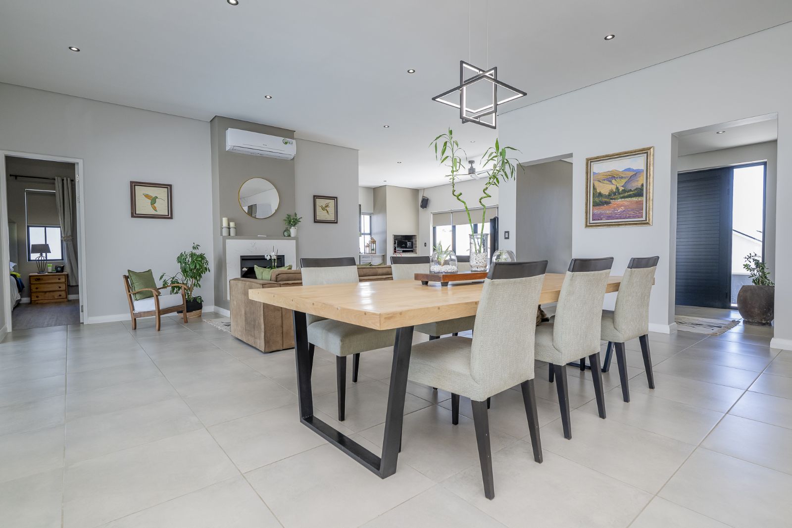 Perfect for entertaining, the home offers an extra-deep built-in braai area with cupboards for glassware and space for a fridge, opening via sliding doors onto a large patio overlooking the swimming pool. The paved outdoor area with planter boxes provides space to add an additional outside braai, all surrounded by a low-maintenance garden