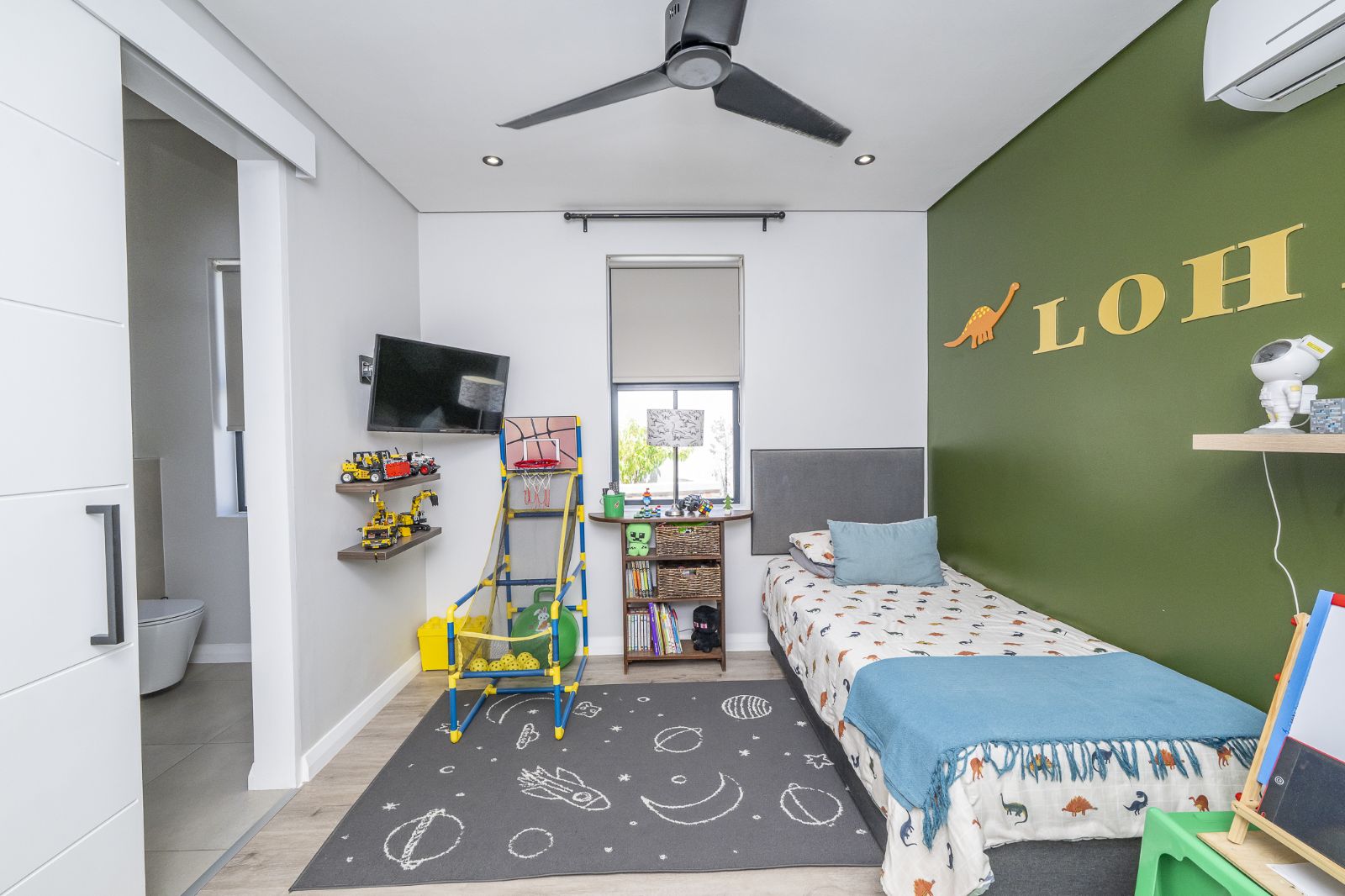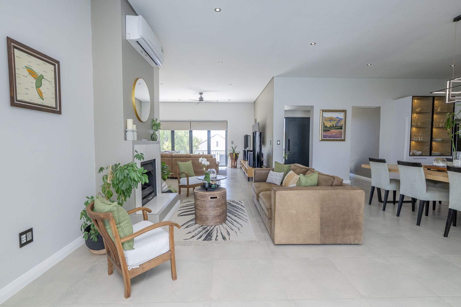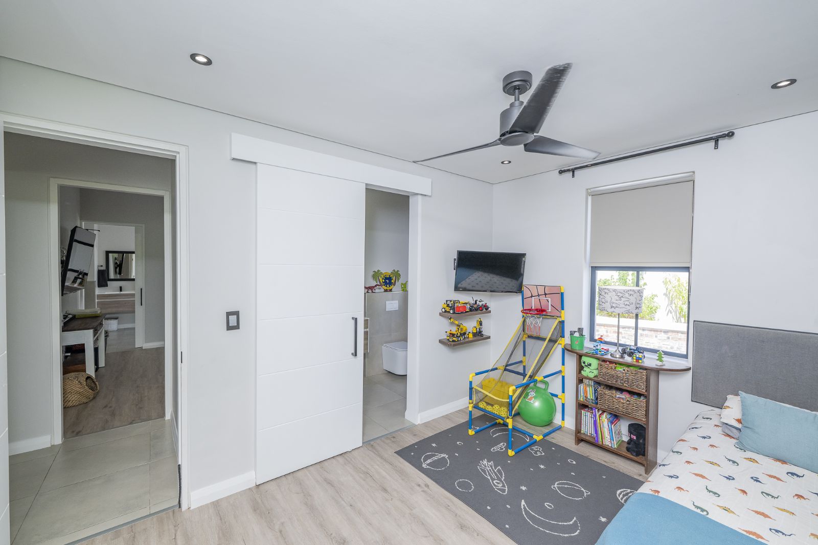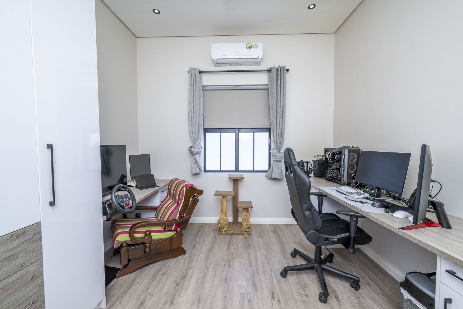 Perfect for entertaining, the home offers an extra-deep built-in braai area with cupboards for glassware and space for a fridge, opening via sliding doors onto a large patio overlooking the swimming pool. The paved outdoor area with planter boxes provides space to add an additional outside braai, all surrounded by a low-maintenance garden