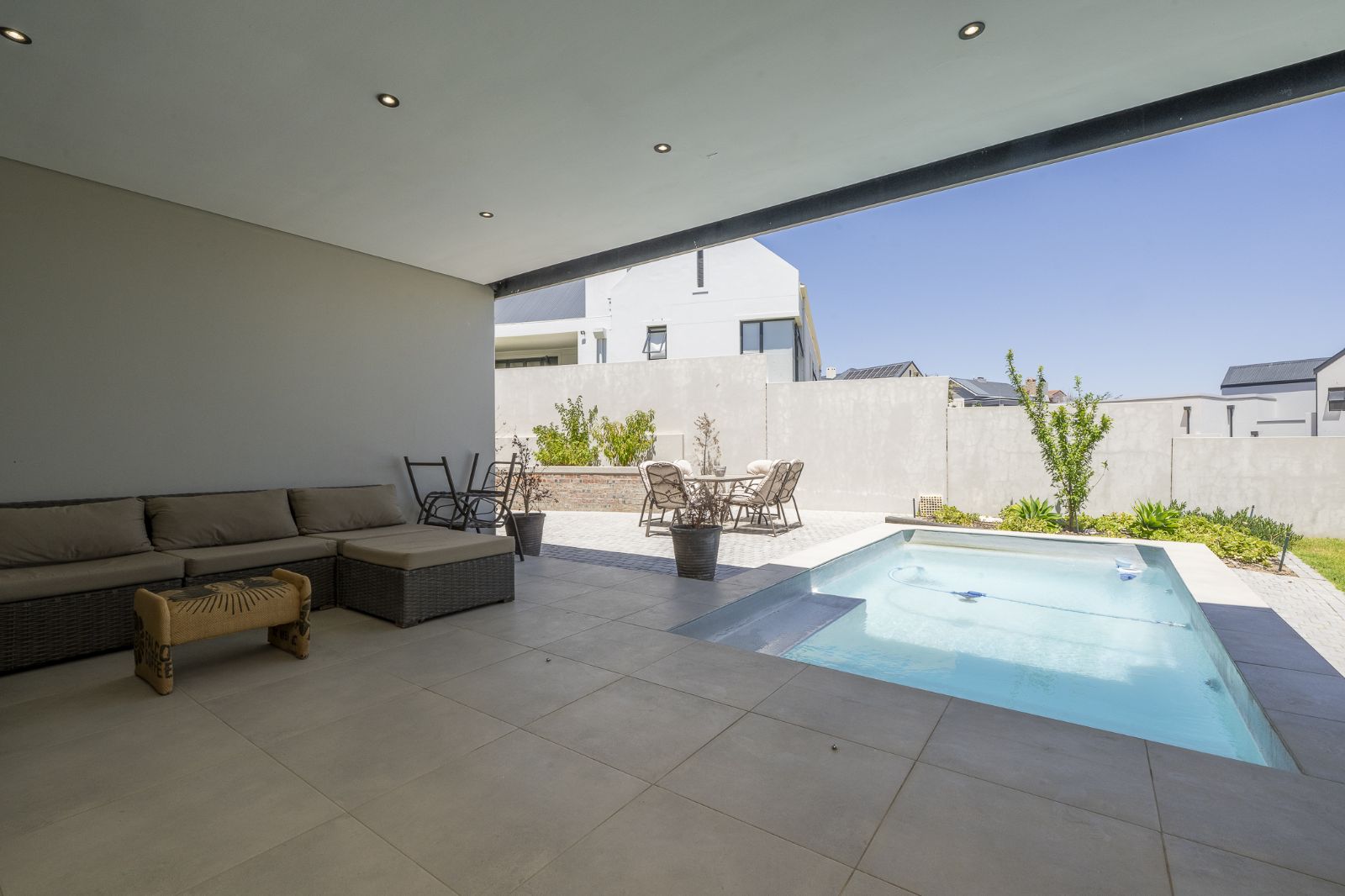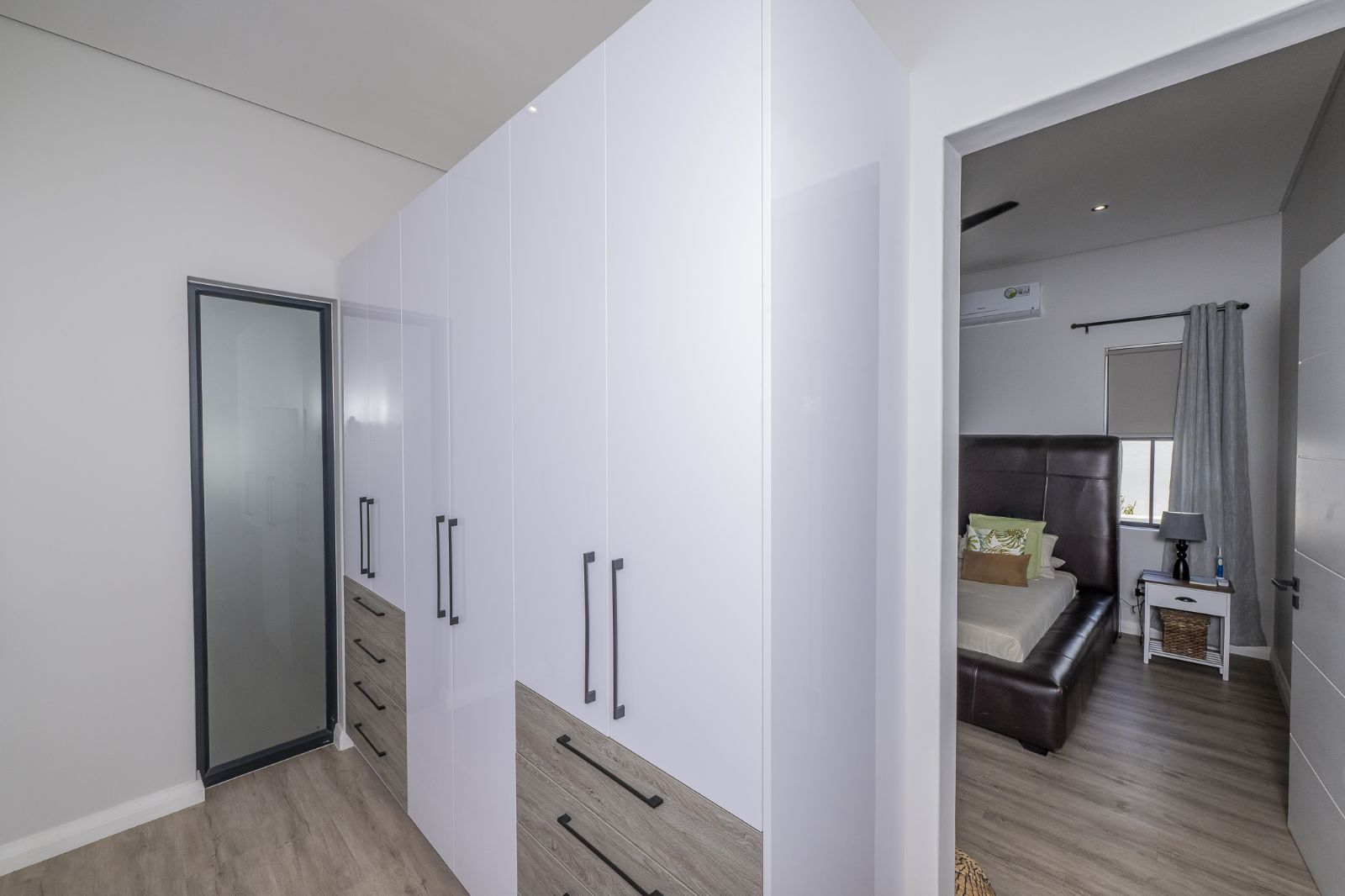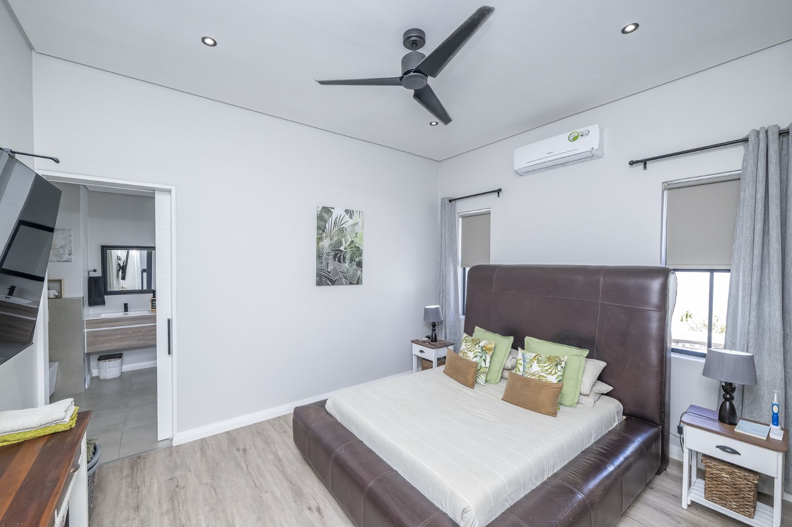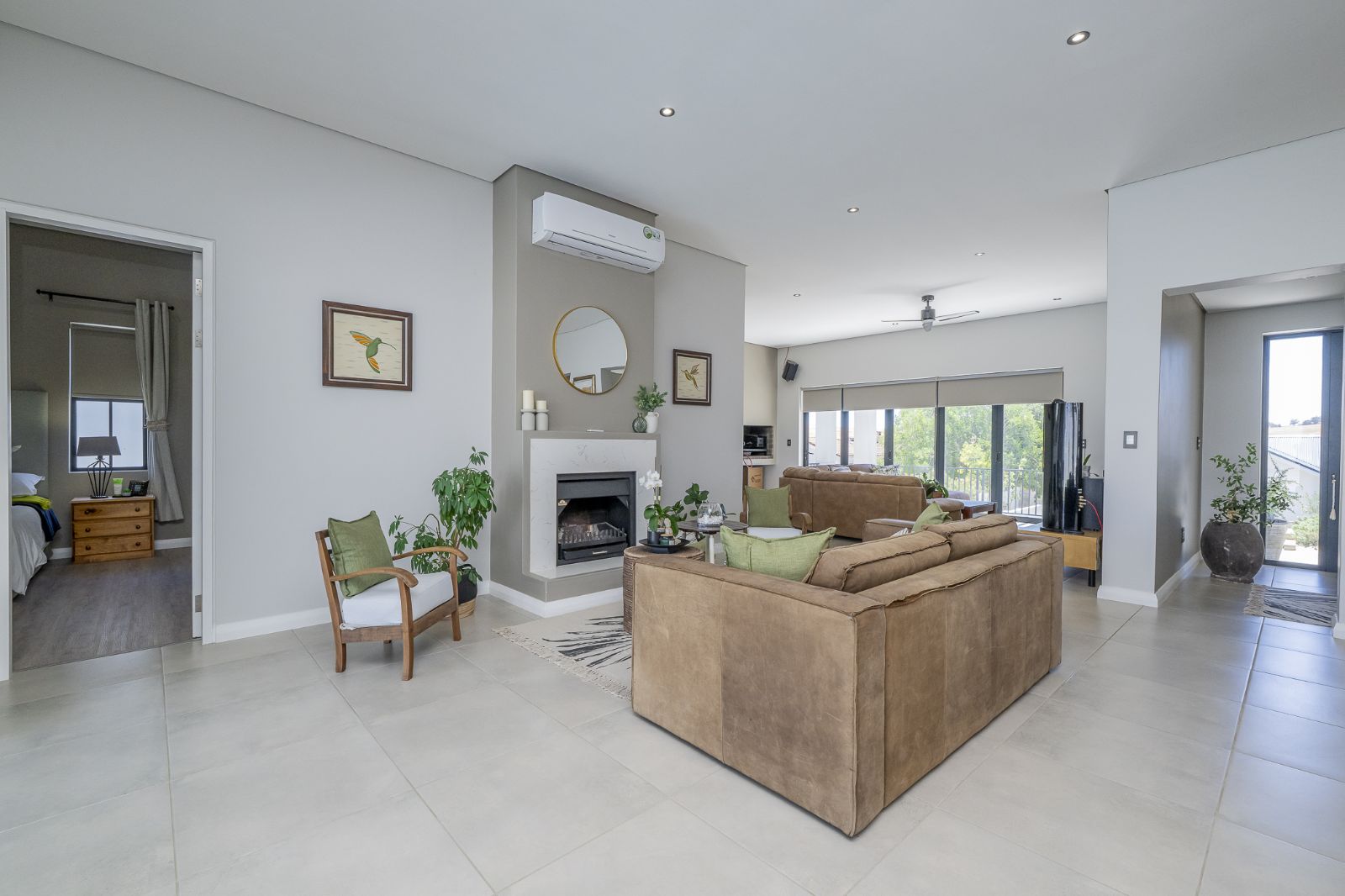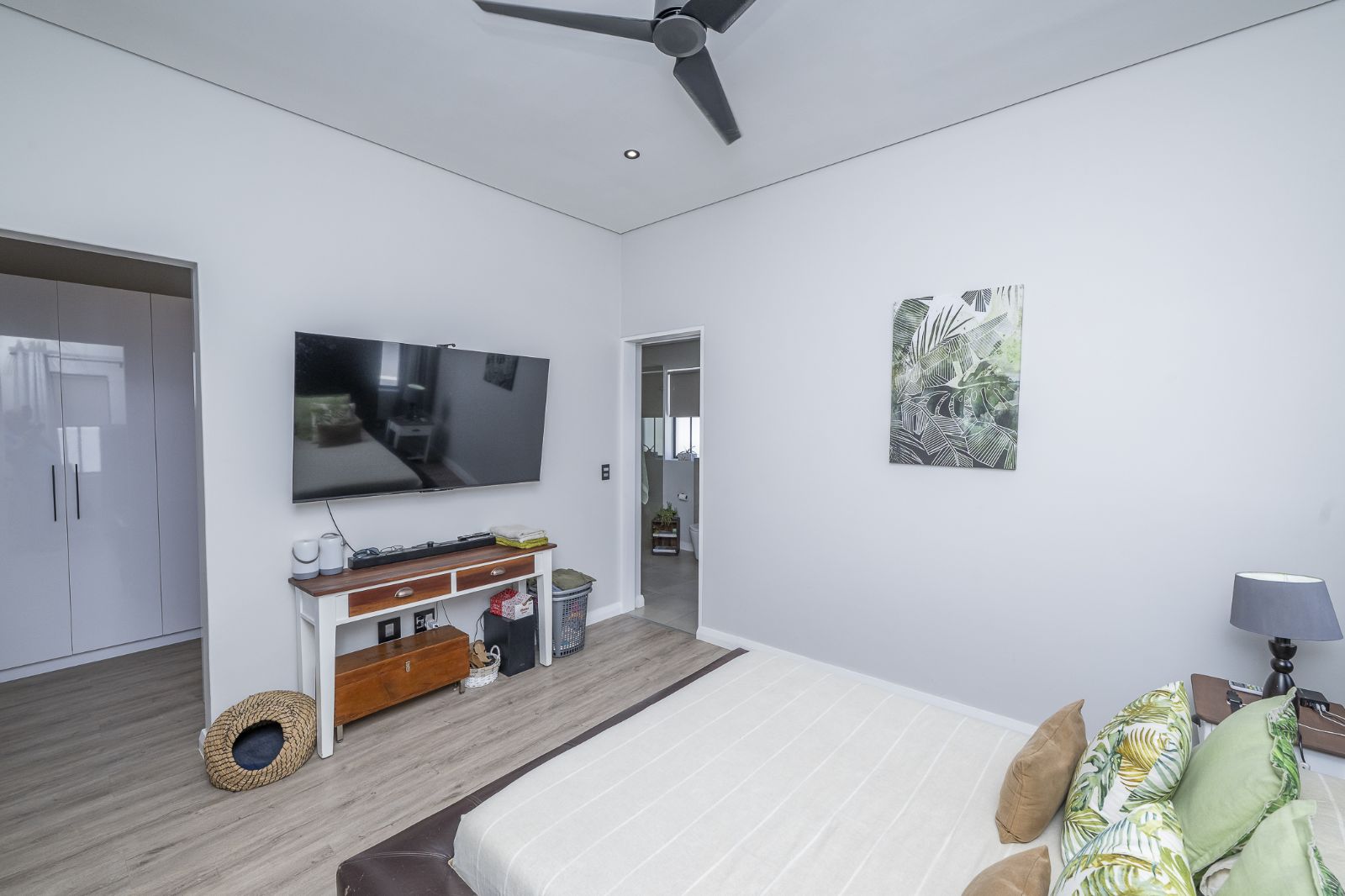 Perfect for entertaining, the home offers an extra-deep built-in braai area with cupboards for glassware and space for a fridge, opening via sliding doors onto a large patio overlooking the swimming pool. The paved outdoor area with planter boxes provides space to add an additional outside braai, all surrounded by a low-maintenance garden