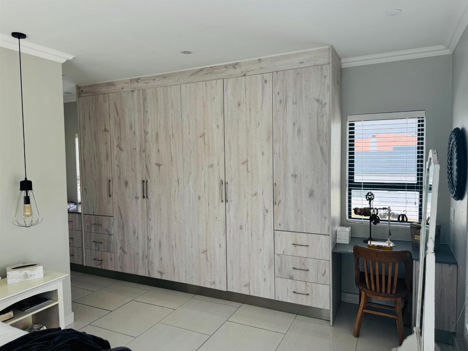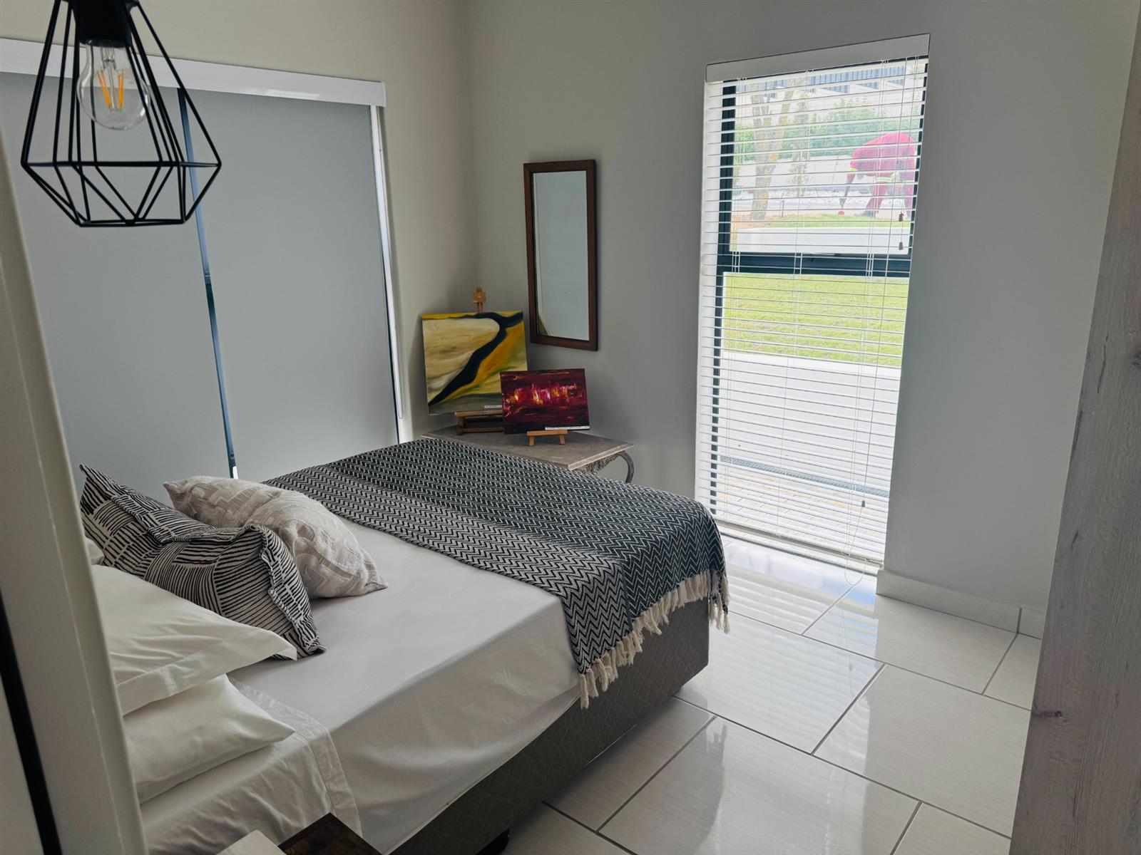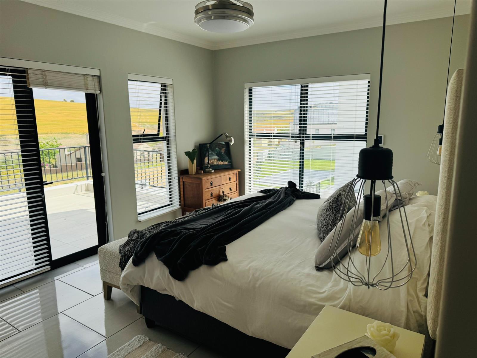 The main bedroom features “his and hers” facilities, ample built-in cupboards, and beautiful views over the wheat fields. The second bedroom includes an en-suite bathroom, while the third bedroom has direct outdoor access and a guest bathroom, perfect for visitors or extended family. All bedrooms have stylish ceiling-hung pendant lights serving as bedside lighting, and the main bedroom also includes a ceiling fan.