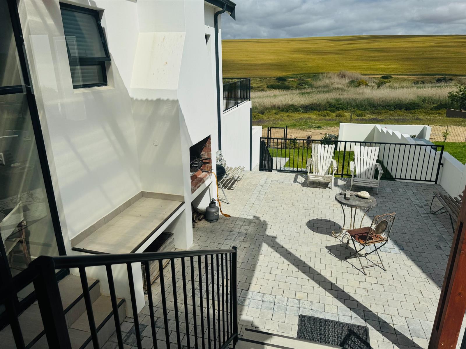 The upper level features a spacious open-plan living area with an indoor braai (barbeque) and stunning views of the outdoor entertainment area and surrounding farmlands. The outdoor braai area already has foundations in place should the new owner wish to enclose or extend it further.