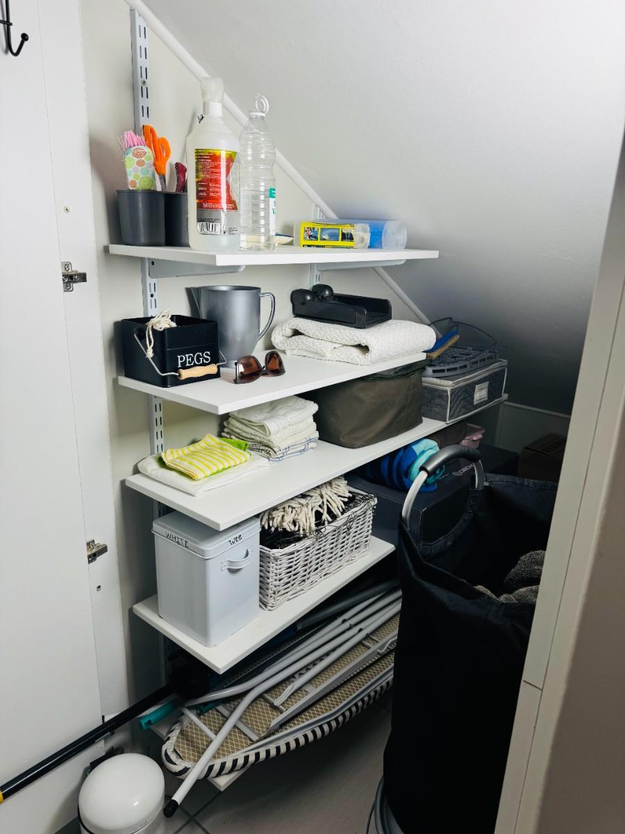 There are three garages: a double garage (with smart cellphone-controlled doors) and a larger single garage suitable for a caravan or boat. Adjacent to the garages is a laundry area for a washing machine and tumble dryer, as well as an additional storage room beneath the staircase.
