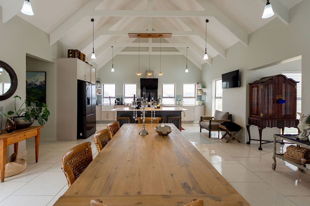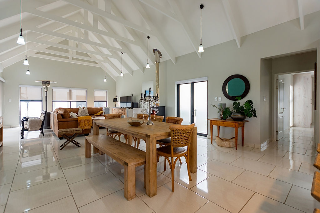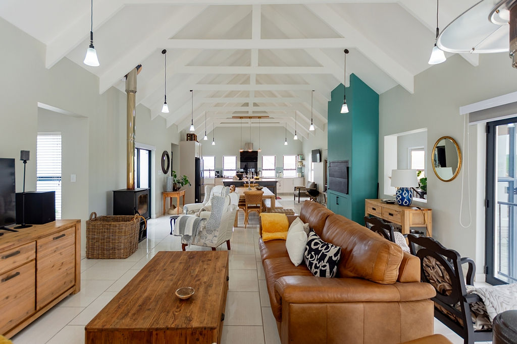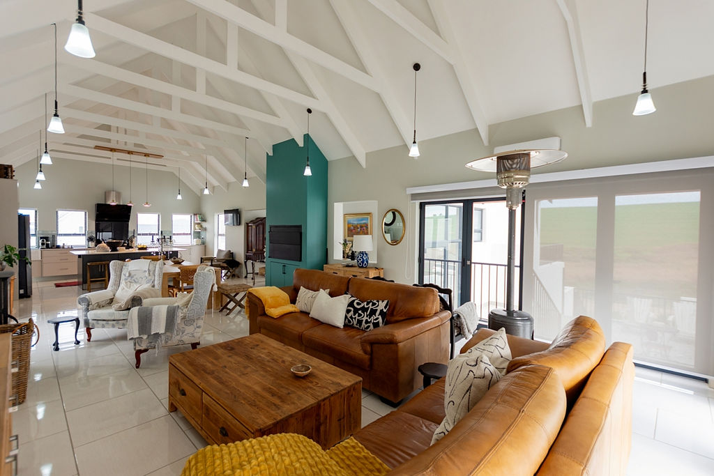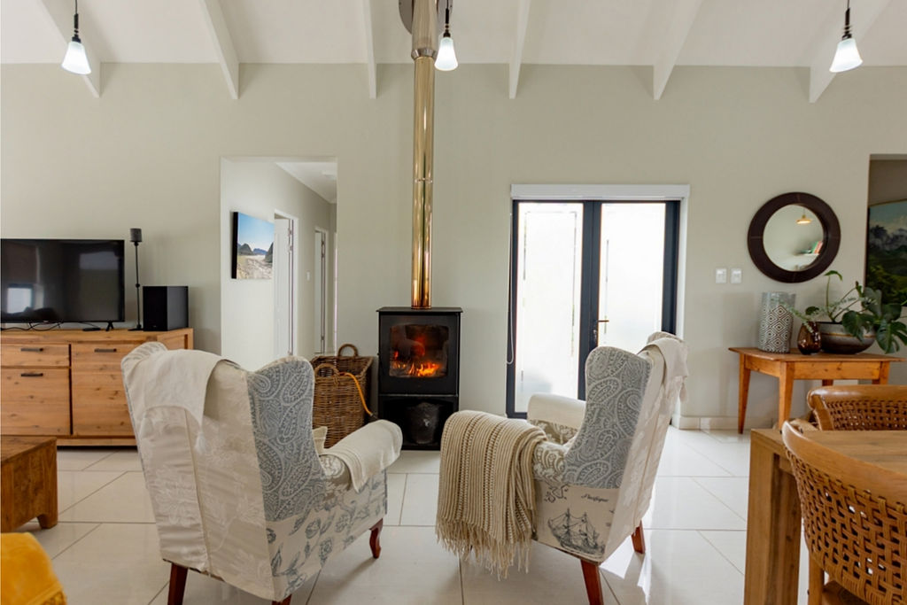 The open plan living area comes with built-in braai as well as cosy fireplace. It opens up with stacker doors onto a huge veranda overlooking the spectacular view.