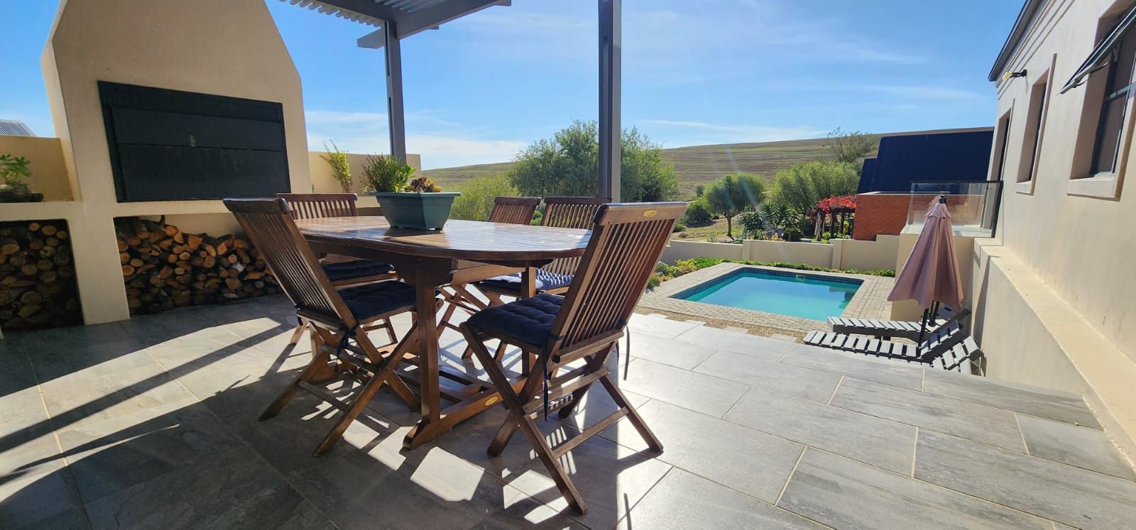 The patio with a built-in braai is perfect for year-round entertaining. Relax with friends and family while taking in the peaceful natural scenery.