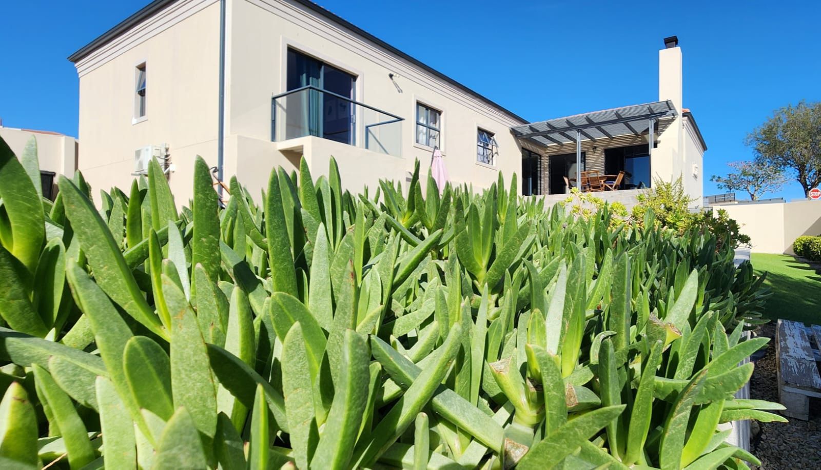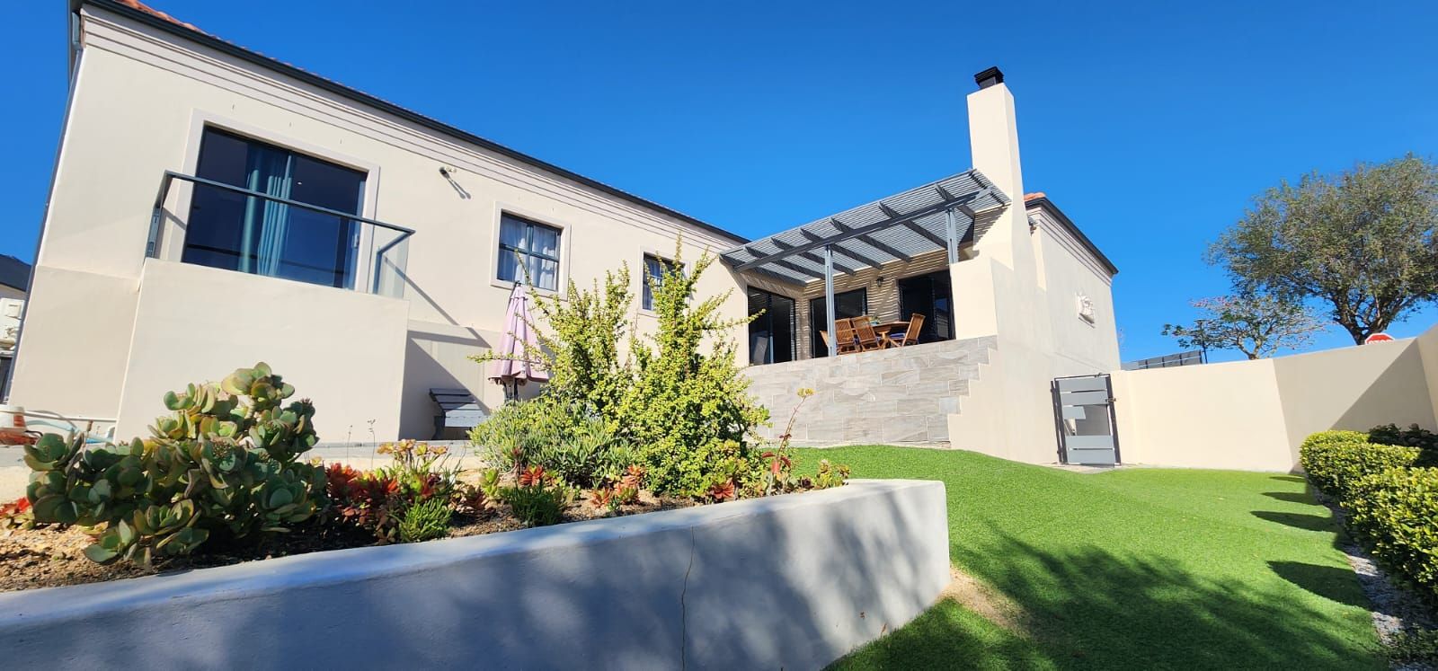 A well-established garden, manicured greenery, and artificial lawn ensure a visually appealing yet low-maintenance outdoor space.