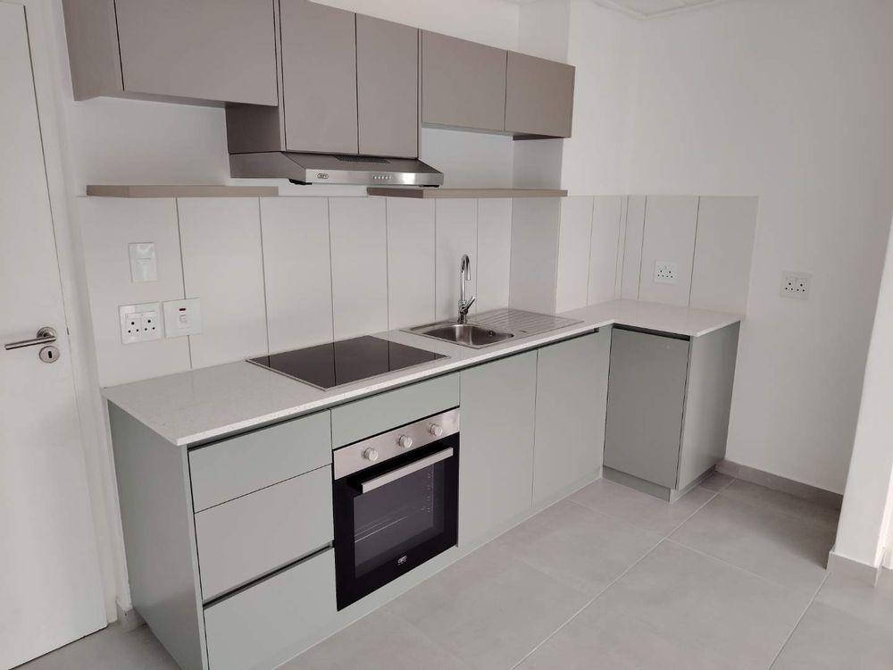The stylish kitchen is fitted with an oven and hob and plenty cupboards. The open plan living area leads to an open balcony.