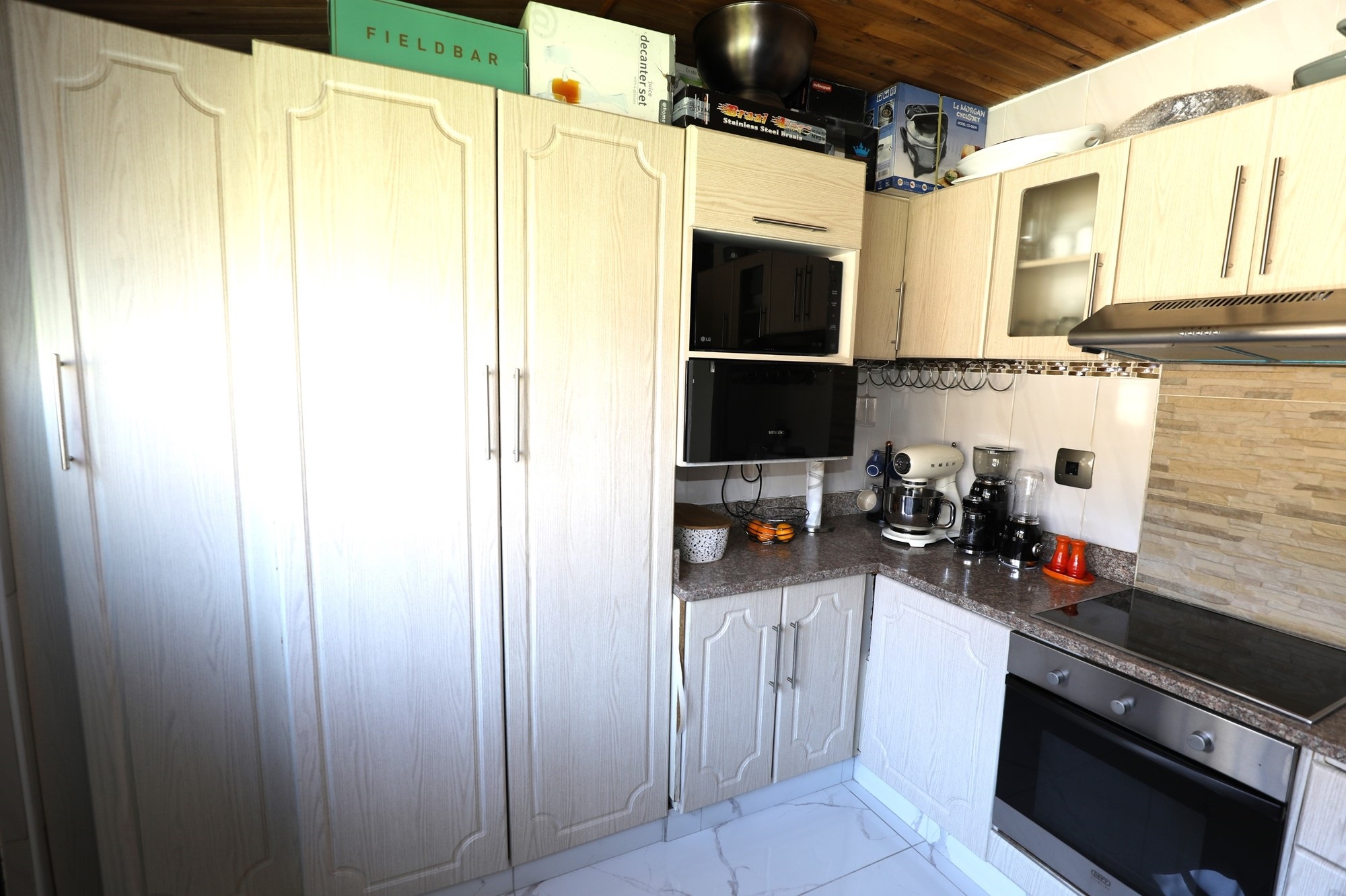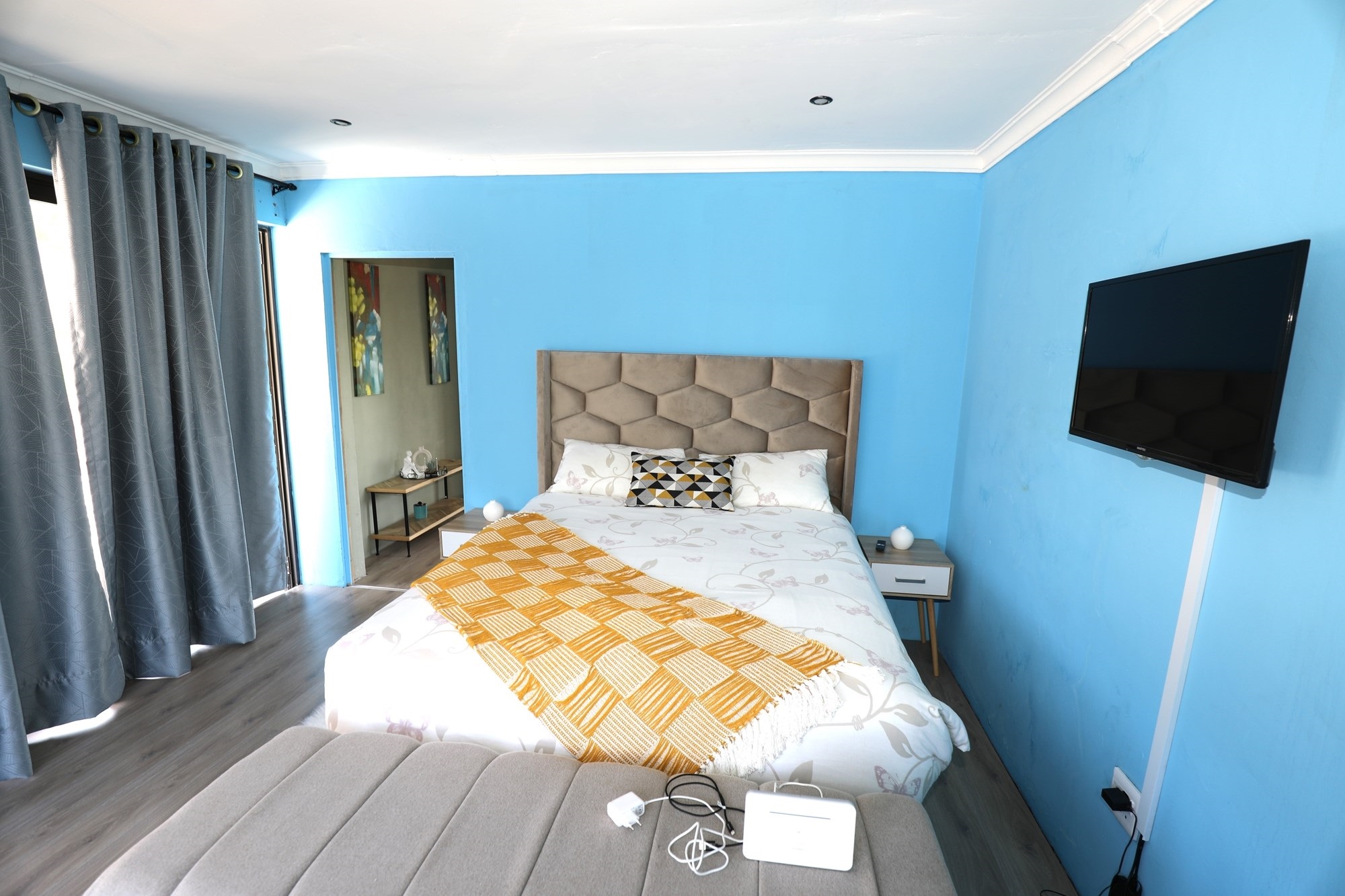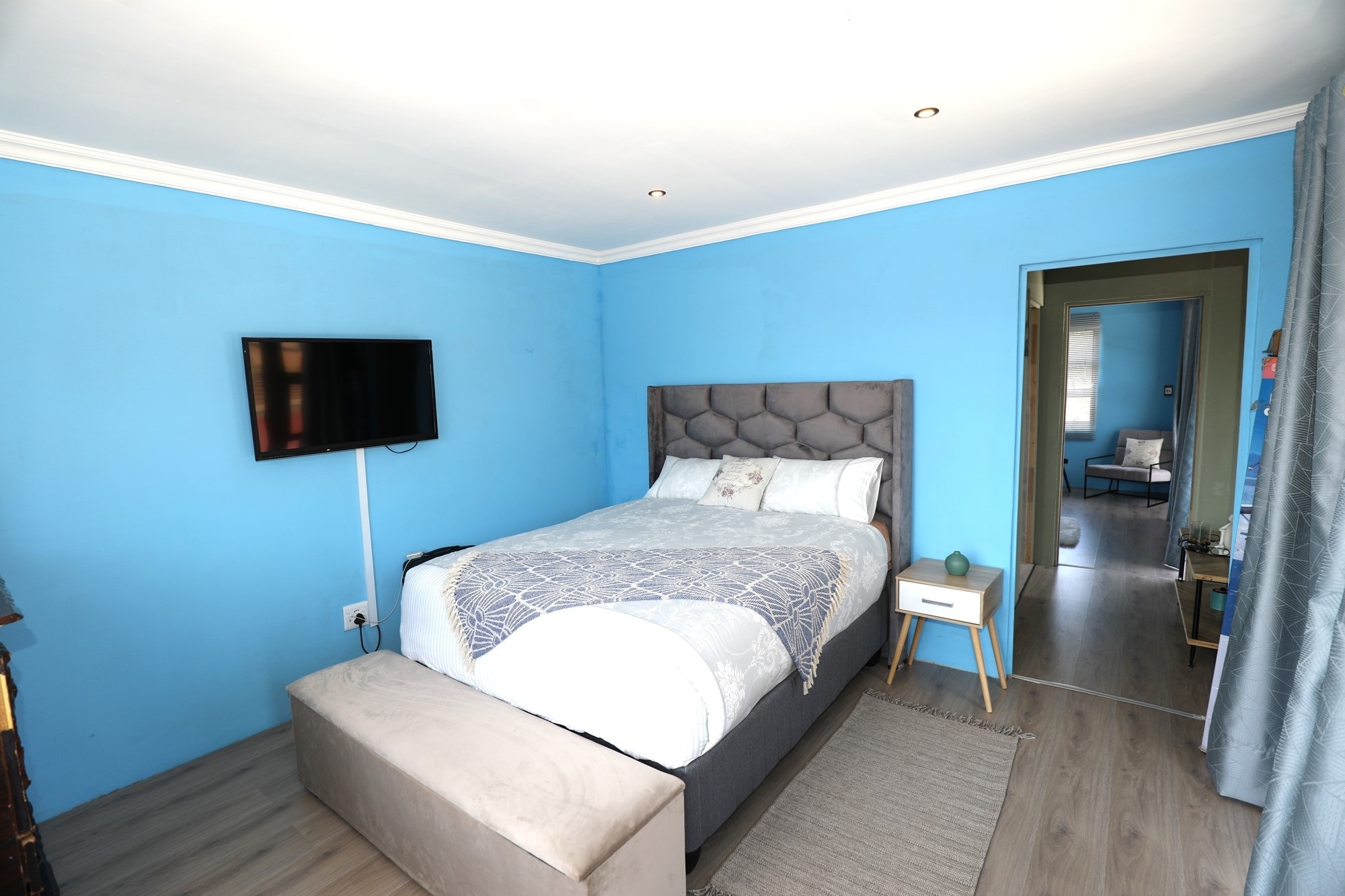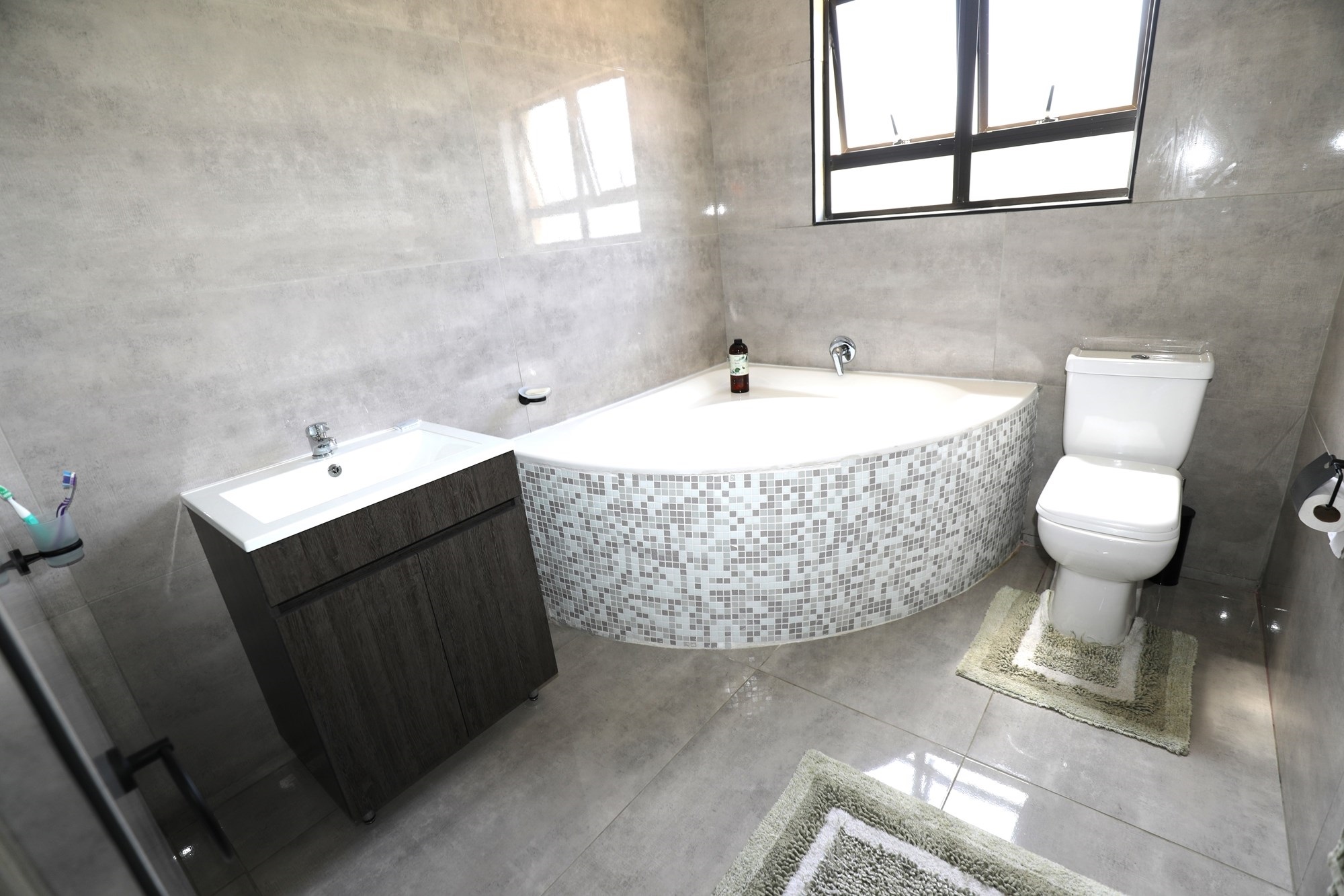 There are 2 houses in this compound, the first house has 2 bedrooms, 1 bathroom, lounge and a fully fitted kitchen with nice finishes. There are 2 aircons. One in the main bedroom and another one in the lounge. The lounge has cladding stone on the wall, which uplift the beauty of this home.